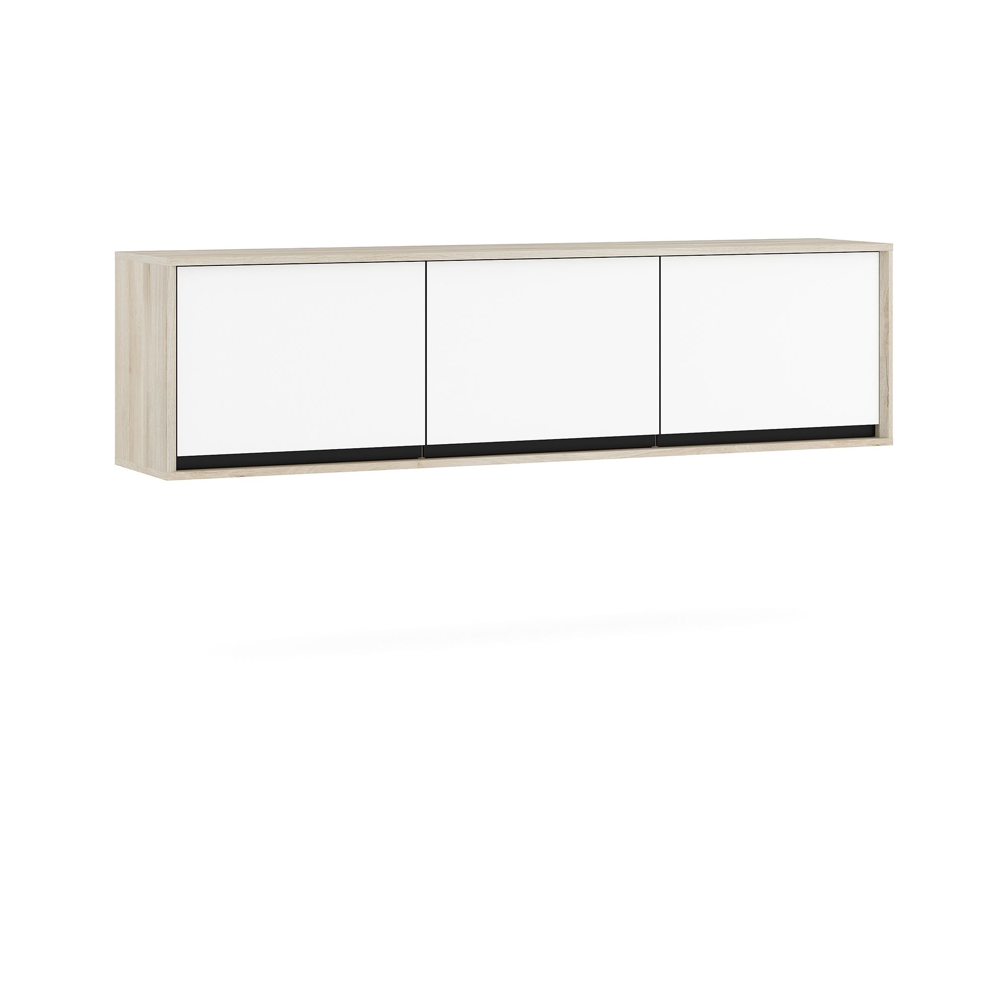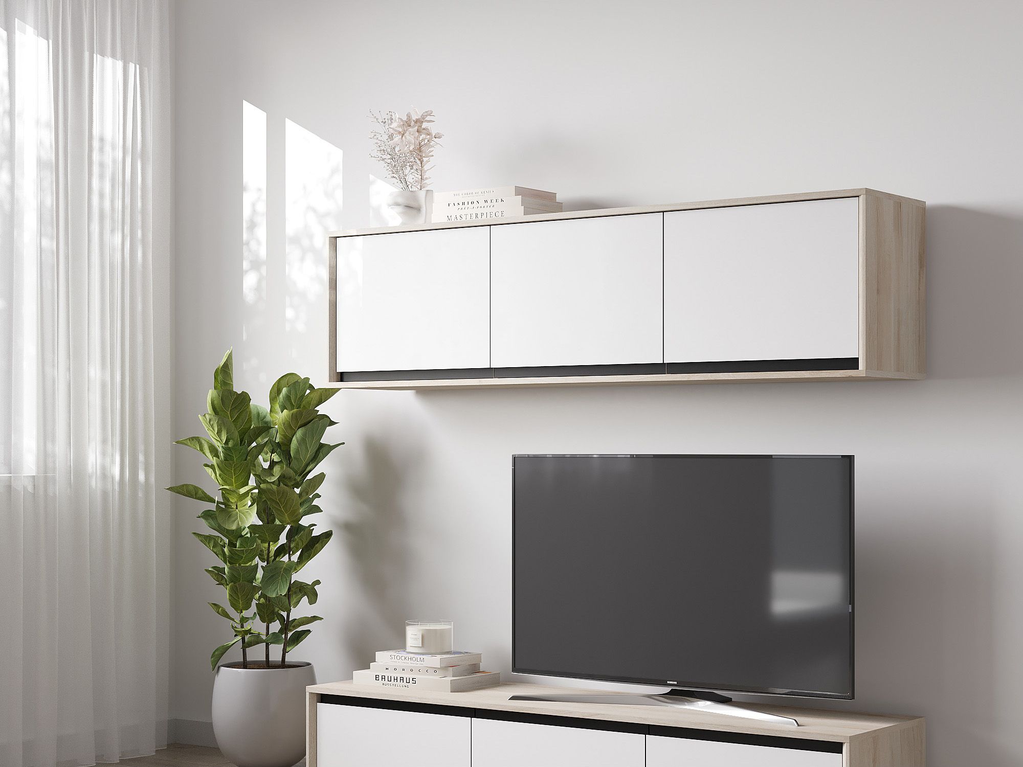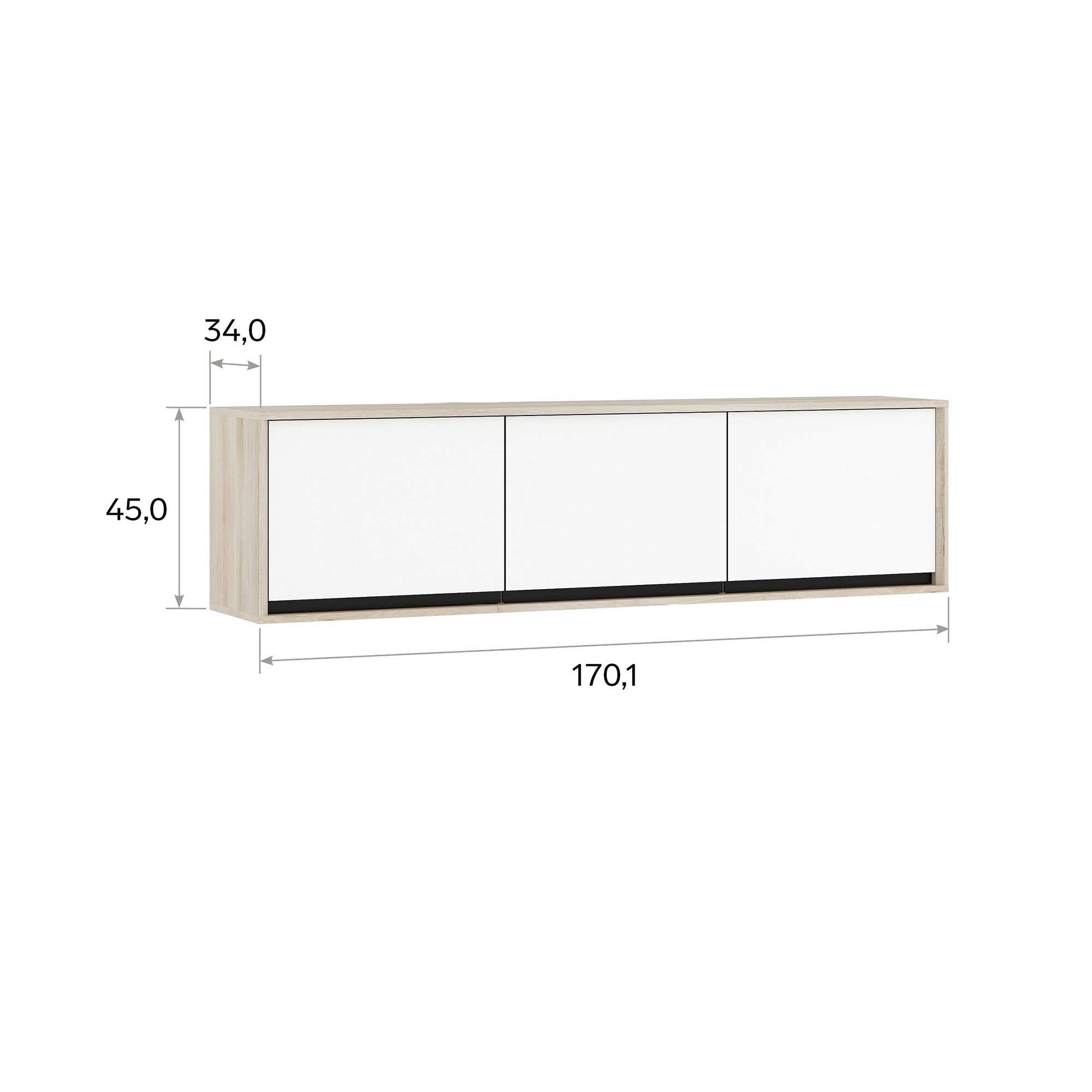 Навесной шкаф LUNA глубиной 34 см и шириной 170,1 см с корпусом в текстуре Дуб Anziano оснащен тремя распашными фасадами с интегрированными J-ручками. Максимальная допустимая распределенная нагрузка 20 кг.