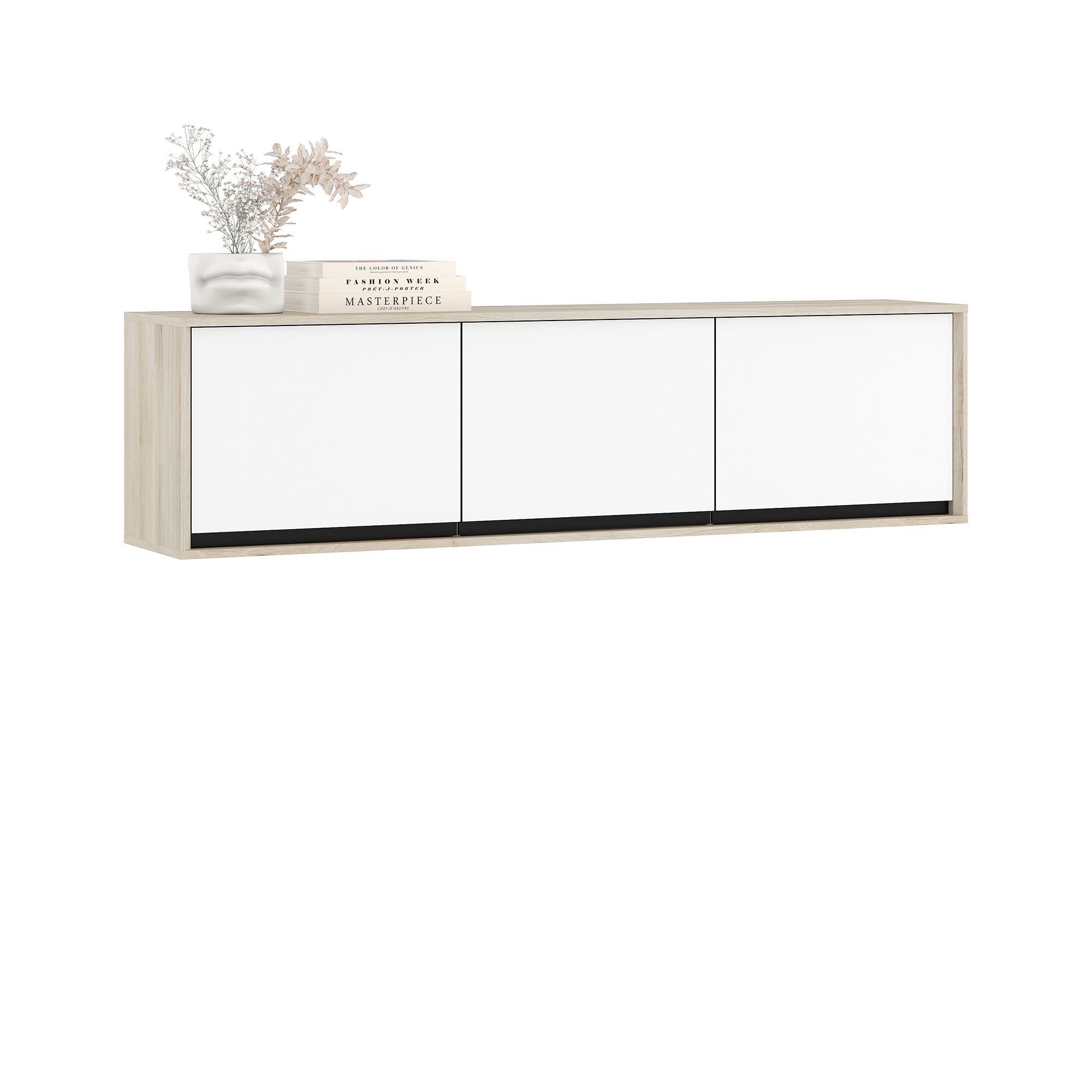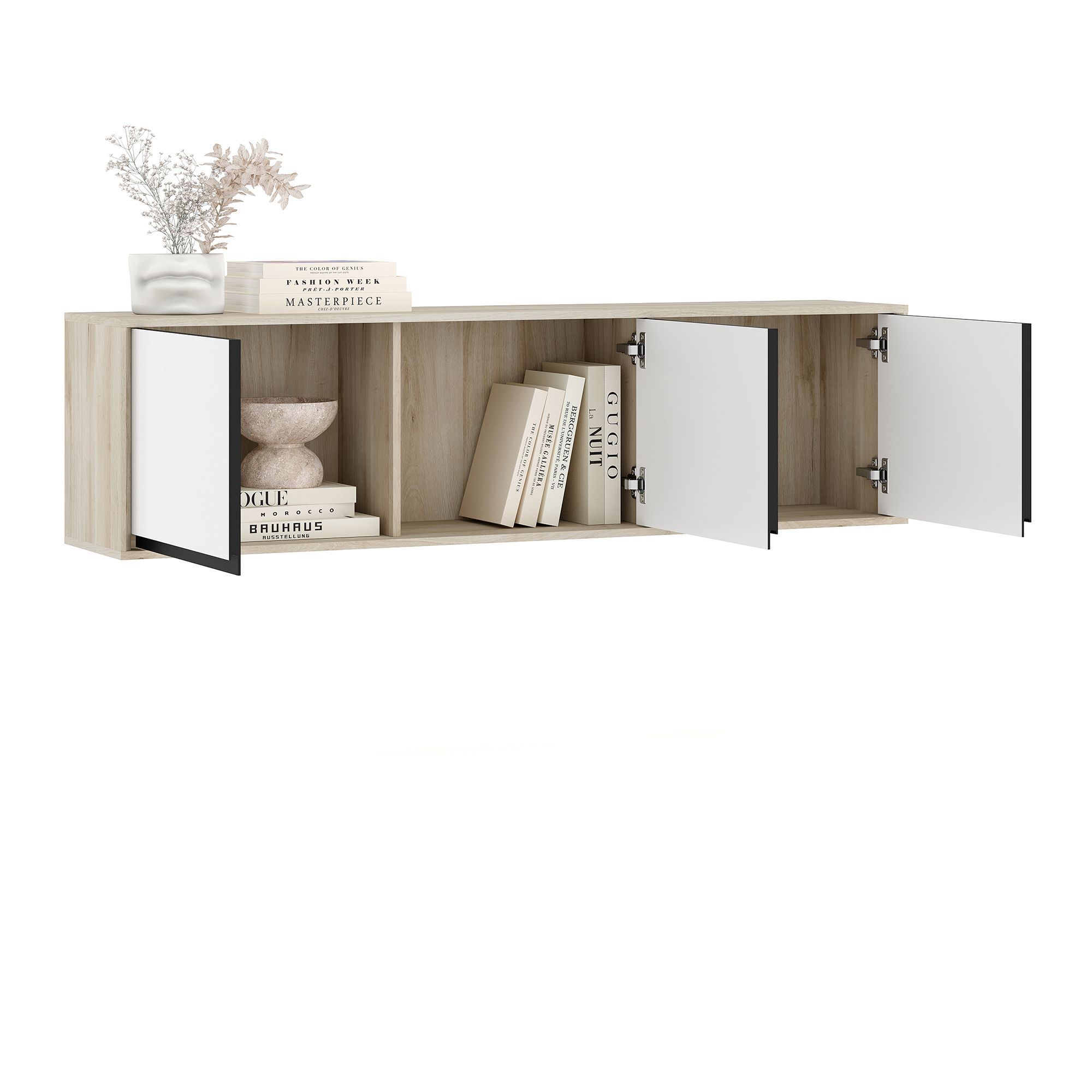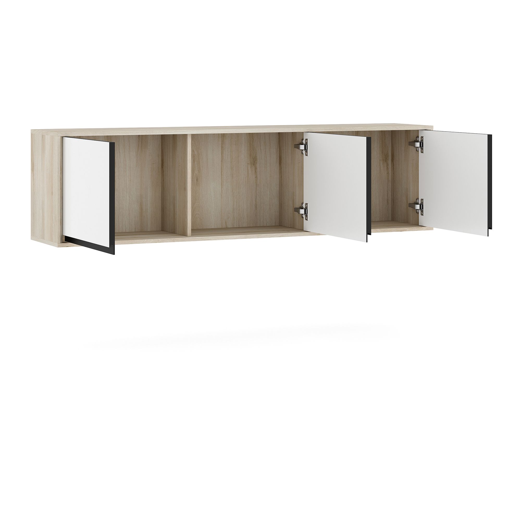 Навесной шкаф LUNA глубиной 34 см и шириной 170,1 см с корпусом в текстуре Дуб Anziano оснащен тремя распашными фасадами с интегрированными J-ручками. Максимальная допустимая распределенная нагрузка 20 кг.