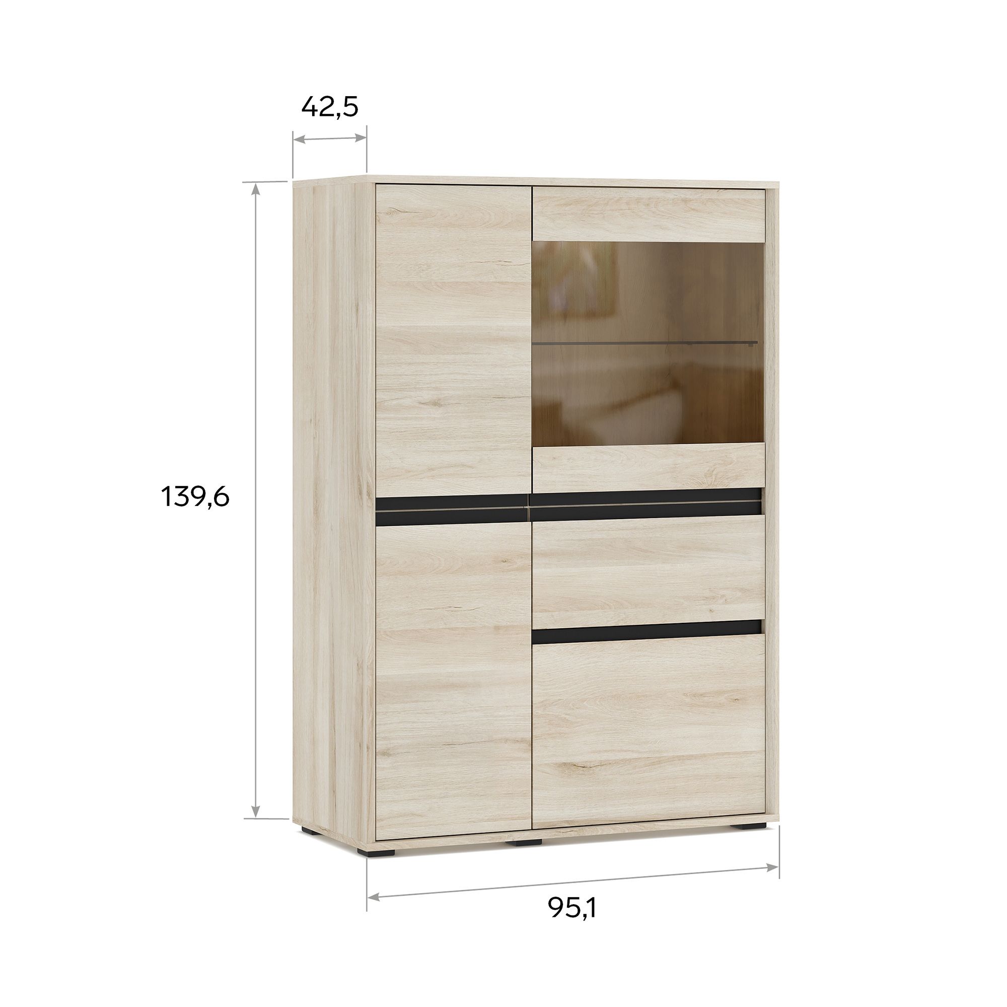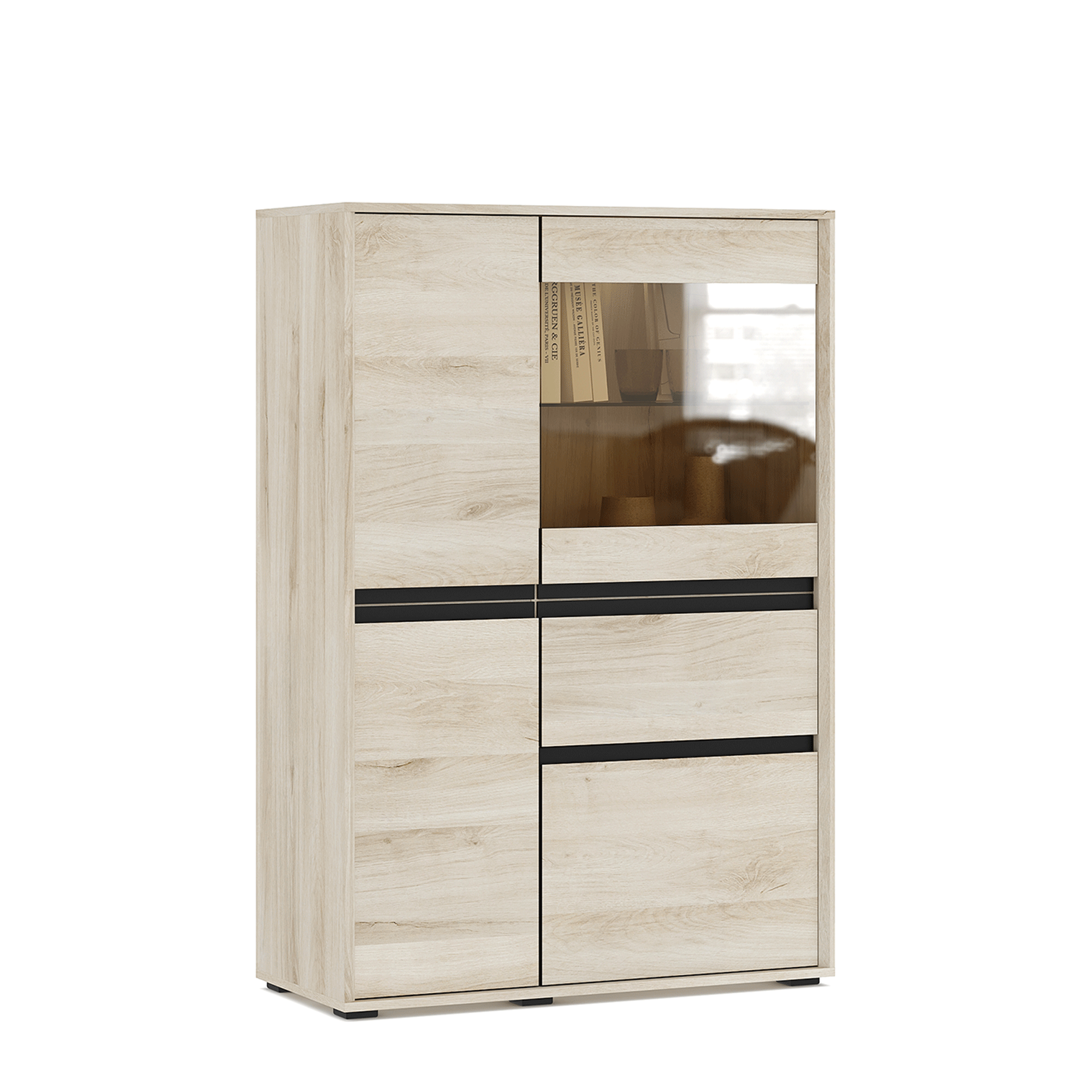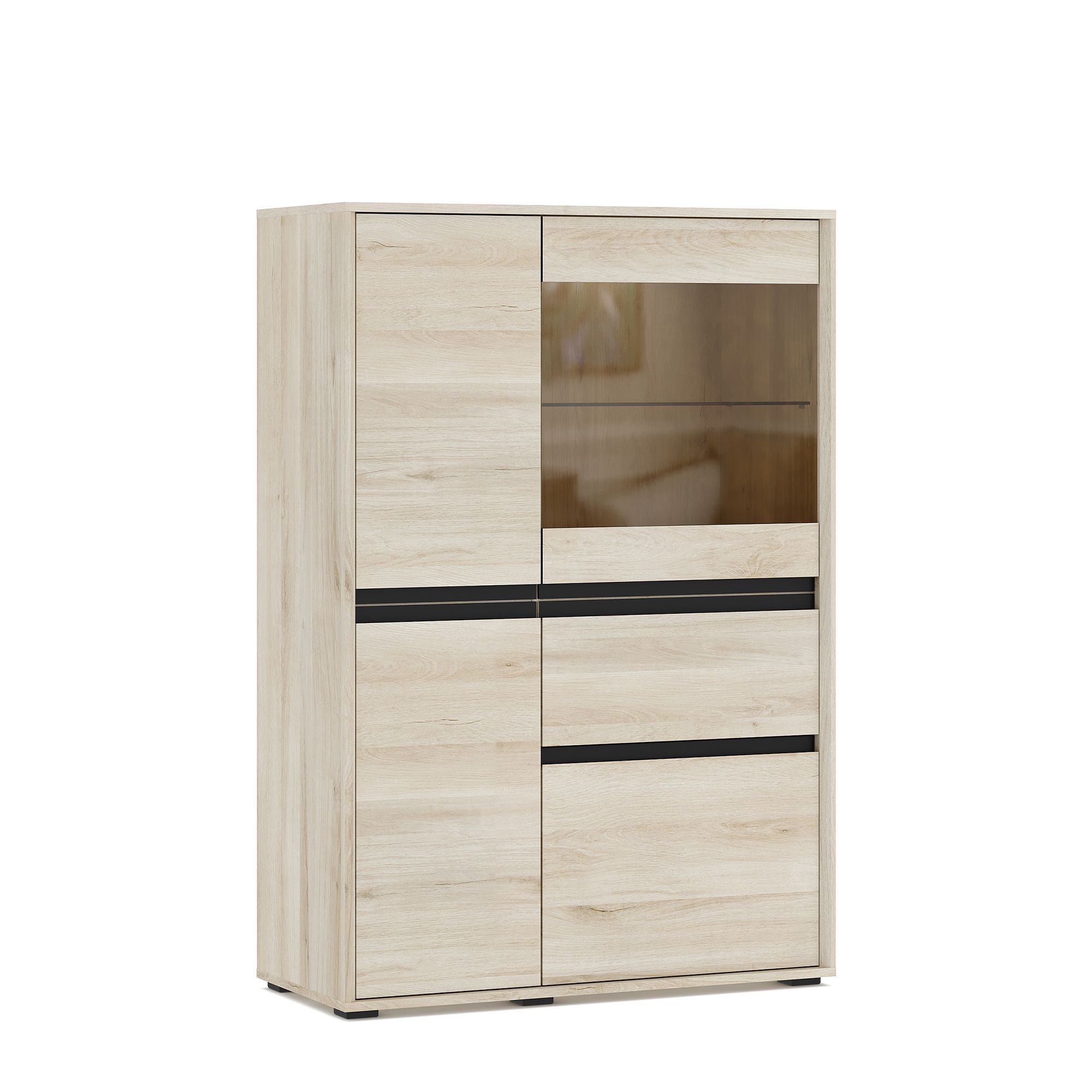 Шкаф-витрина LUNA высотой 139,6 см и шириной 95,1 см с корпусом в текстуре Дуб Anziano оснащен выдвижным ящиком и распашными фасадами с интегрированными J-ручками. За вставкой из тонированного стекла располагается стеклянная полка, за сплошными фасадами – полки из ЛДСП. В качестве опции доступна система подсветки (заказывается отдельно).