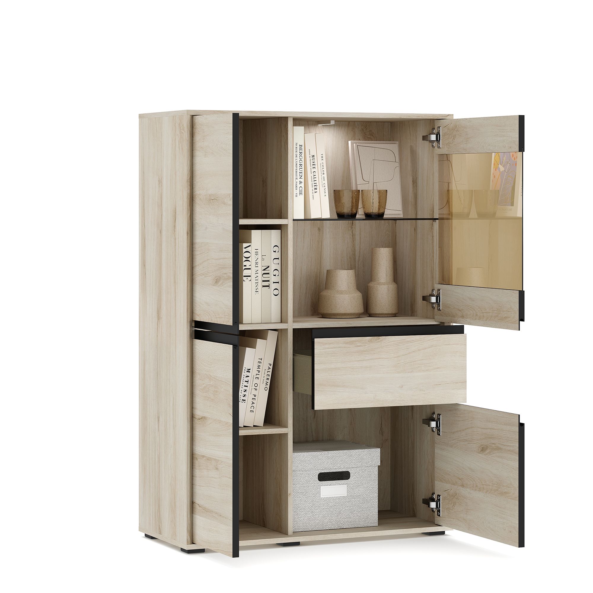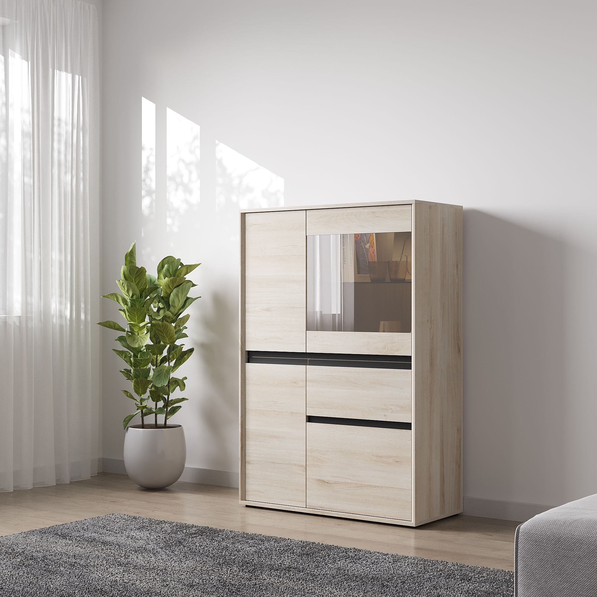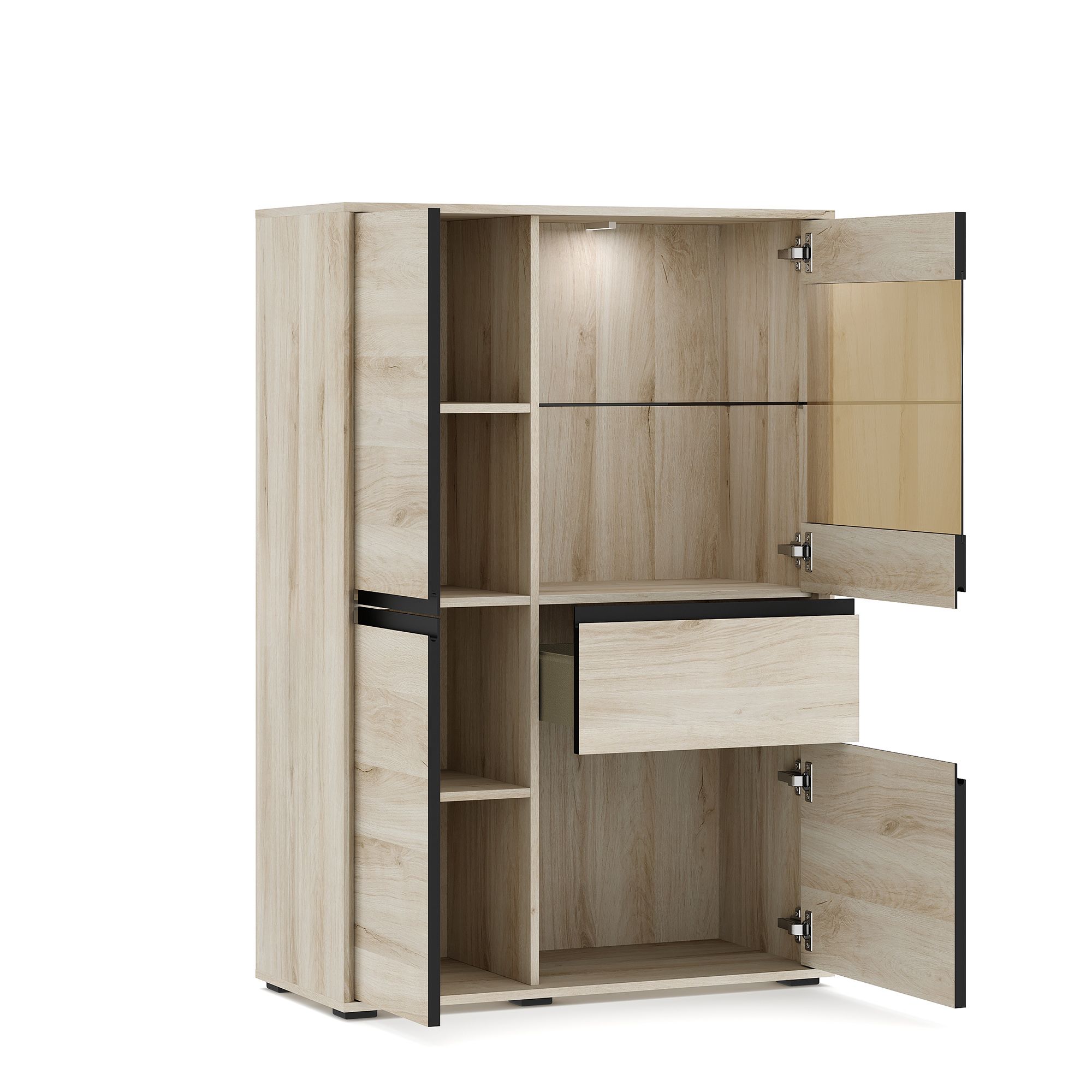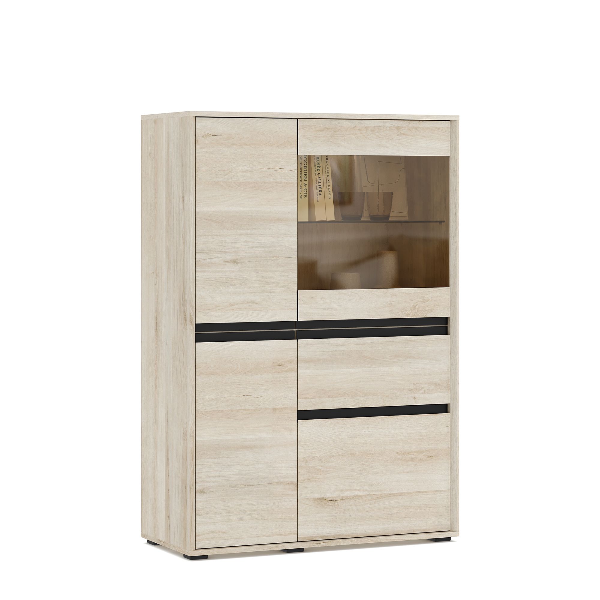 Шкаф-витрина LUNA высотой 139,6 см и шириной 95,1 см с корпусом в текстуре Дуб Anziano оснащен выдвижным ящиком и распашными фасадами с интегрированными J-ручками. За вставкой из тонированного стекла располагается стеклянная полка, за сплошными фасадами – полки из ЛДСП. В качестве опции доступна система подсветки (заказывается отдельно).