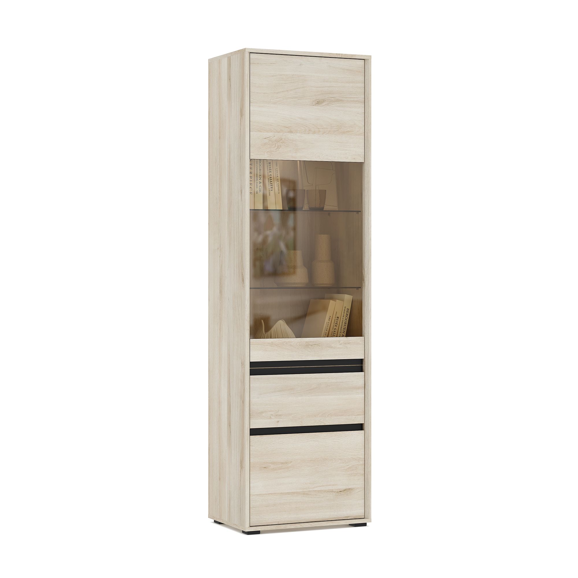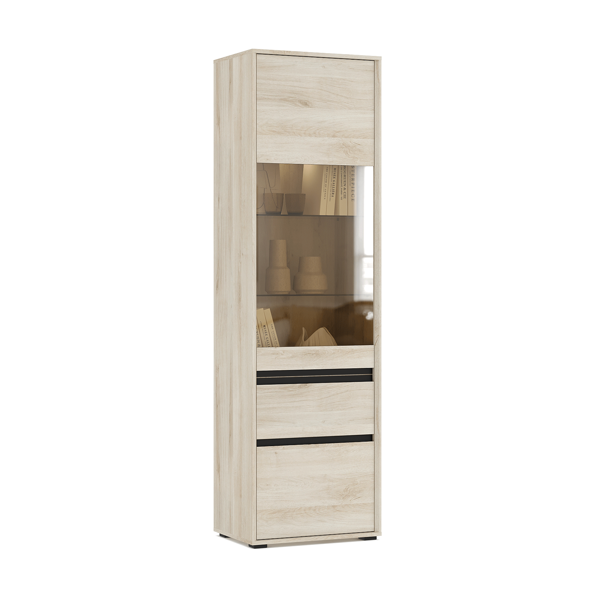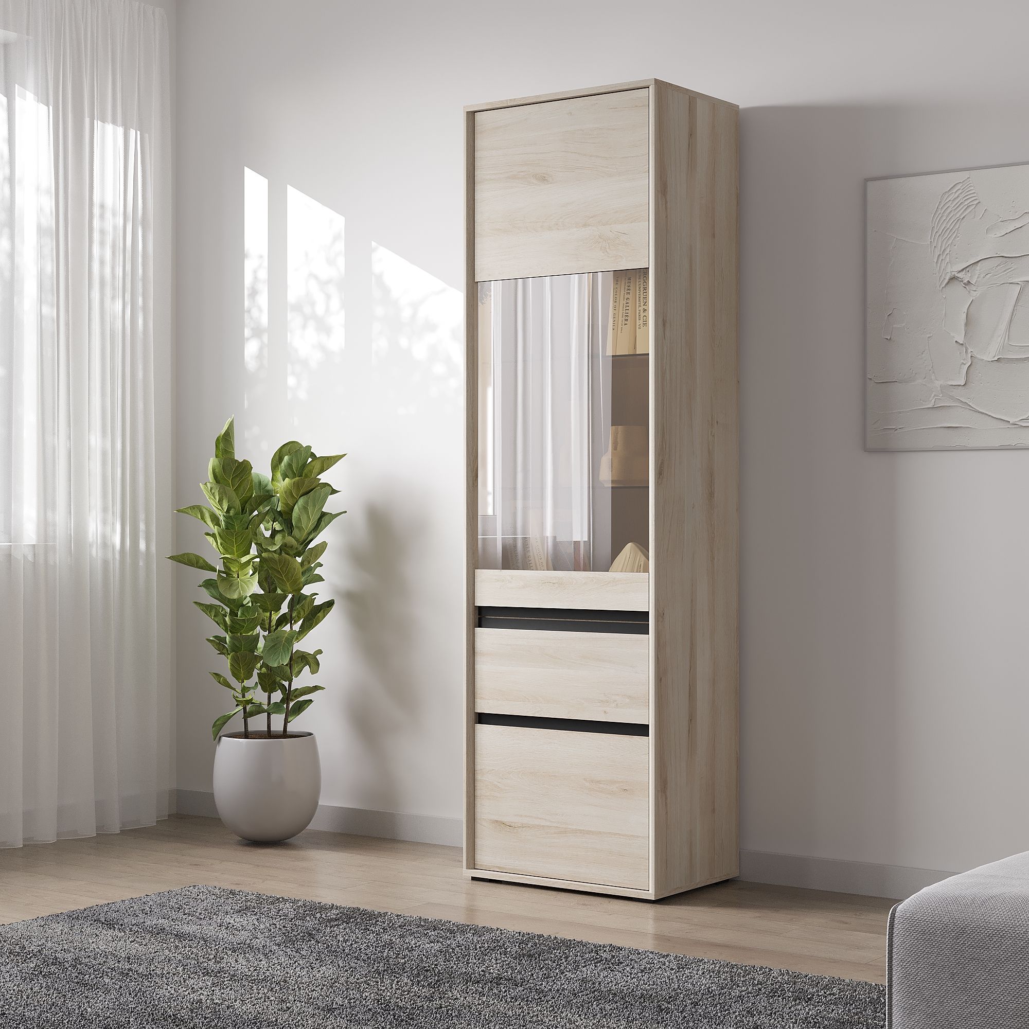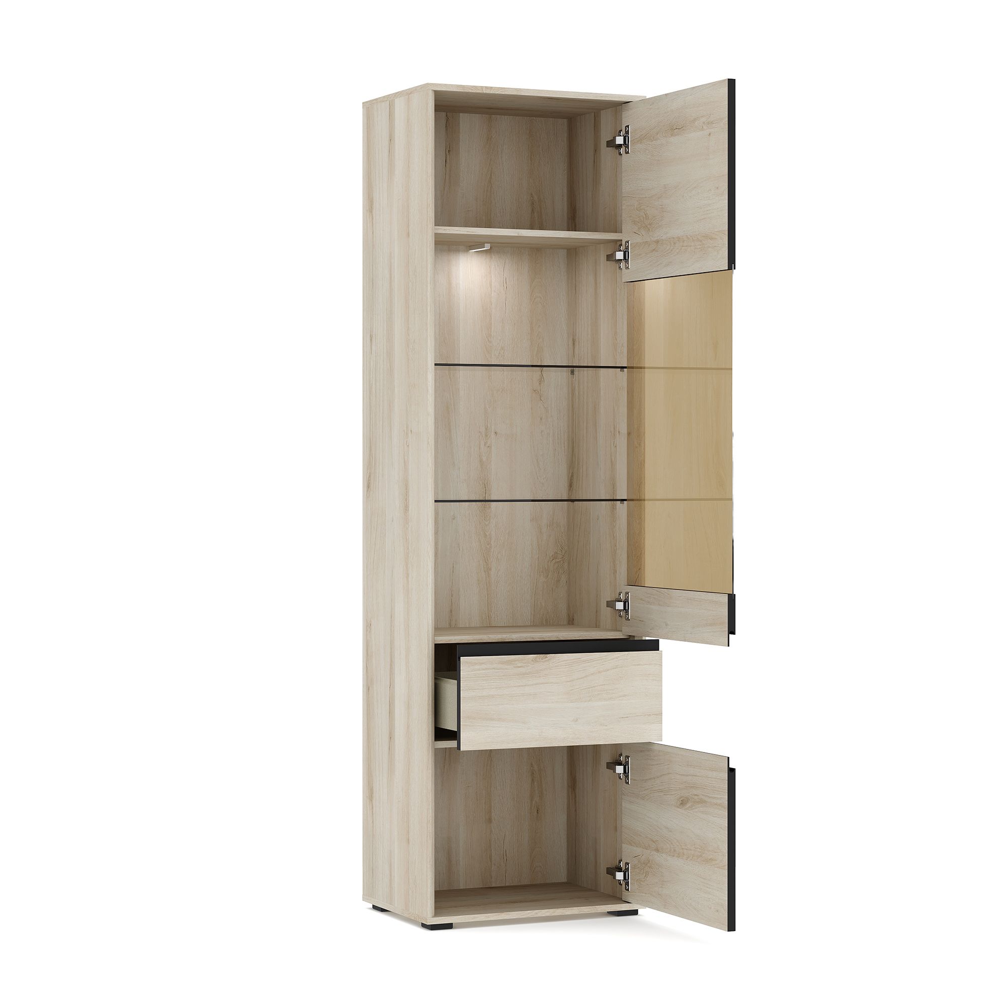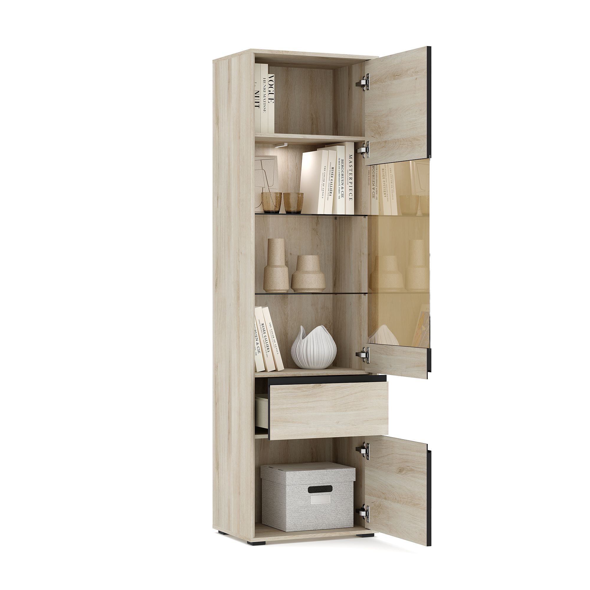 Шкаф-витрина LUNA высотой 206,8 см и шириной 60,1 см с корпусом в текстуре Дуб Anziano оснащен выдвижным ящиком и распашными фасадами с интегрированными J-ручками. За вставкой из тонированного стекла располагаются стеклянные полки, за сплошным фасадом – полки из ЛДСП. Возможно как левое, так и правое исполнение элемента. В качестве опции доступна система подсветки (заказывается отдельно).