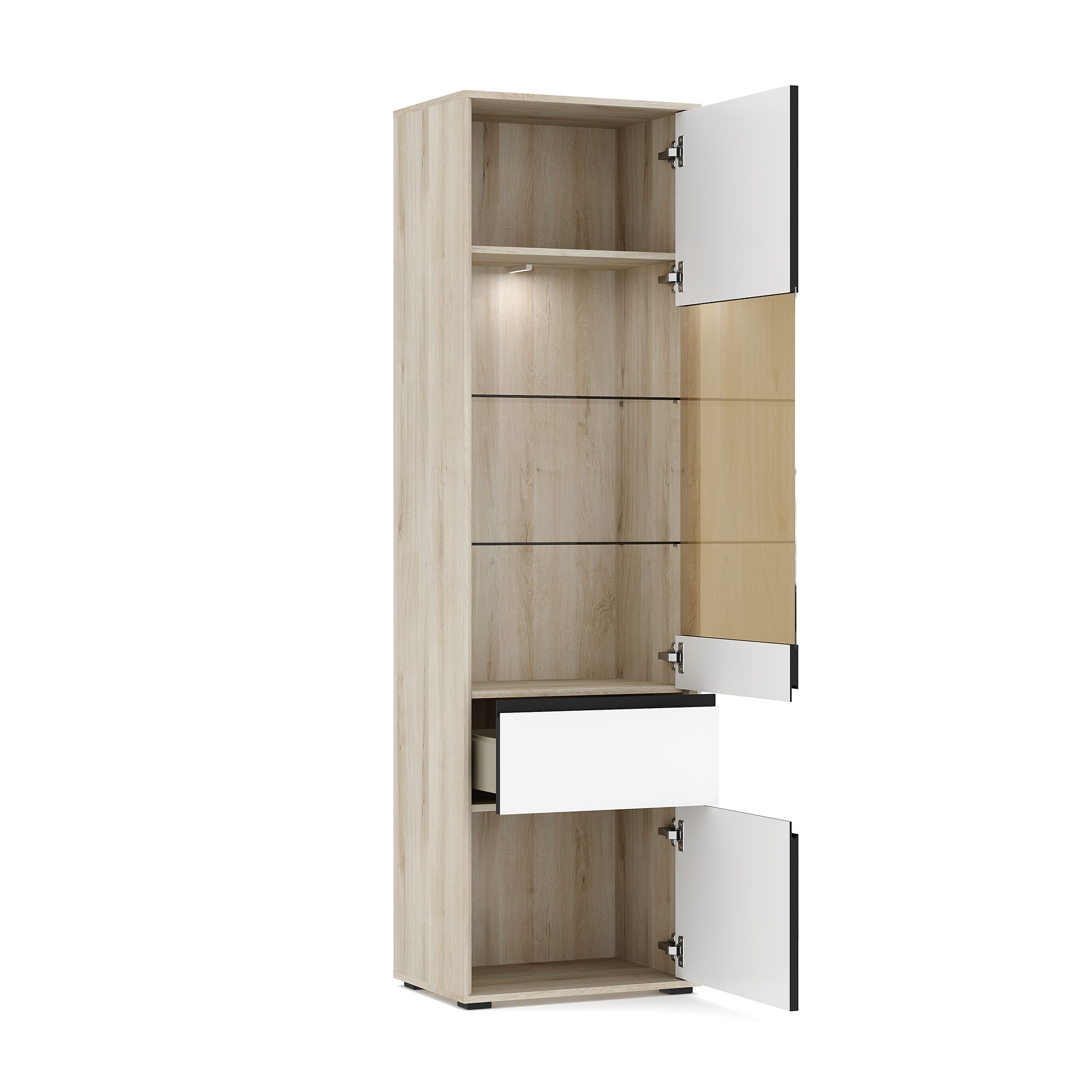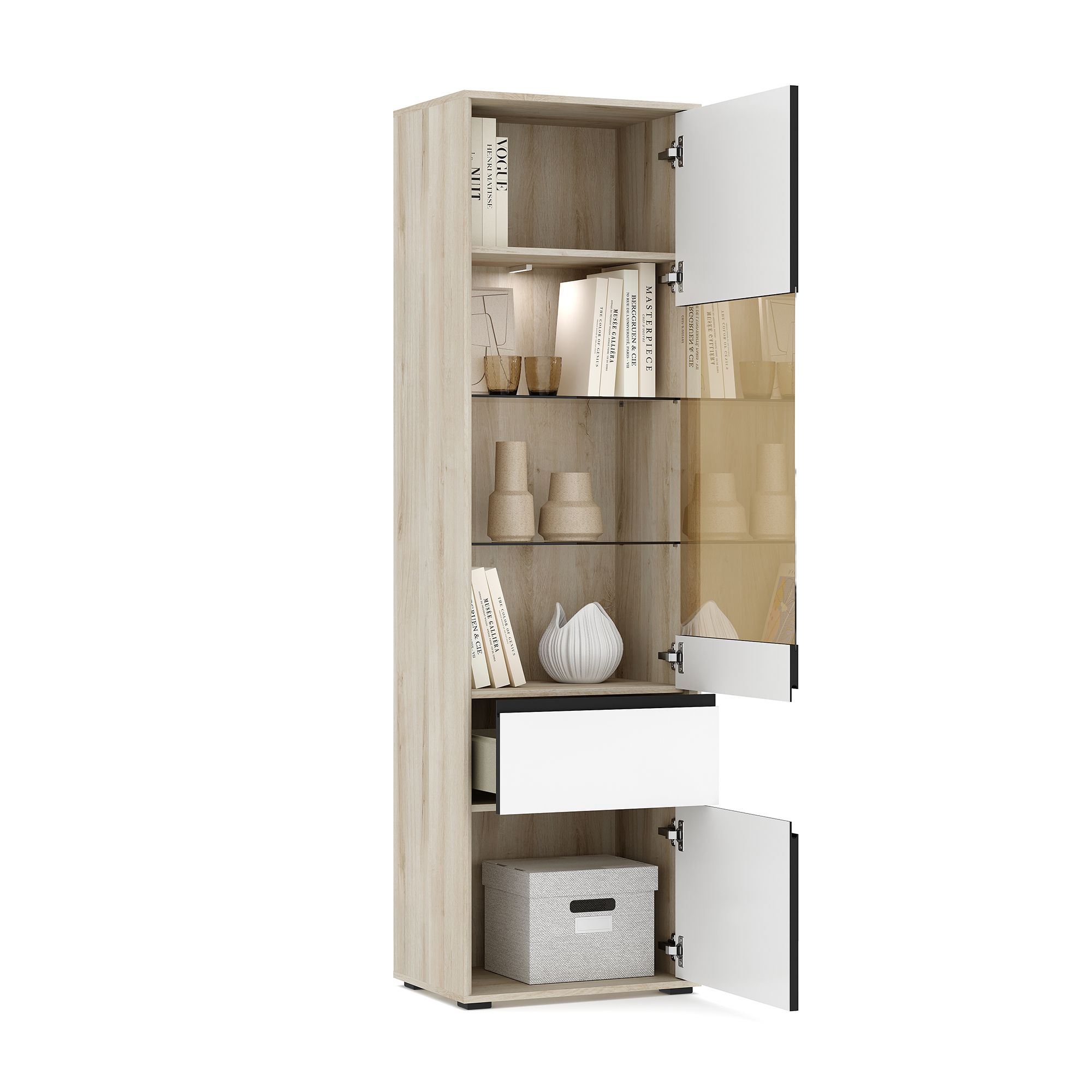 Шкаф-витрина LUNA высотой 206,8 см и шириной 60,1 см с корпусом в текстуре Дуб Anziano оснащен выдвижным ящиком и распашными фасадами с интегрированными J-ручками. За вставкой из тонированного стекла располагаются стеклянные полки, за сплошным фасадом – полки из ЛДСП. Возможно как левое, так и правое исполнение элемента. В качестве опции доступна система подсветки (заказывается отдельно).