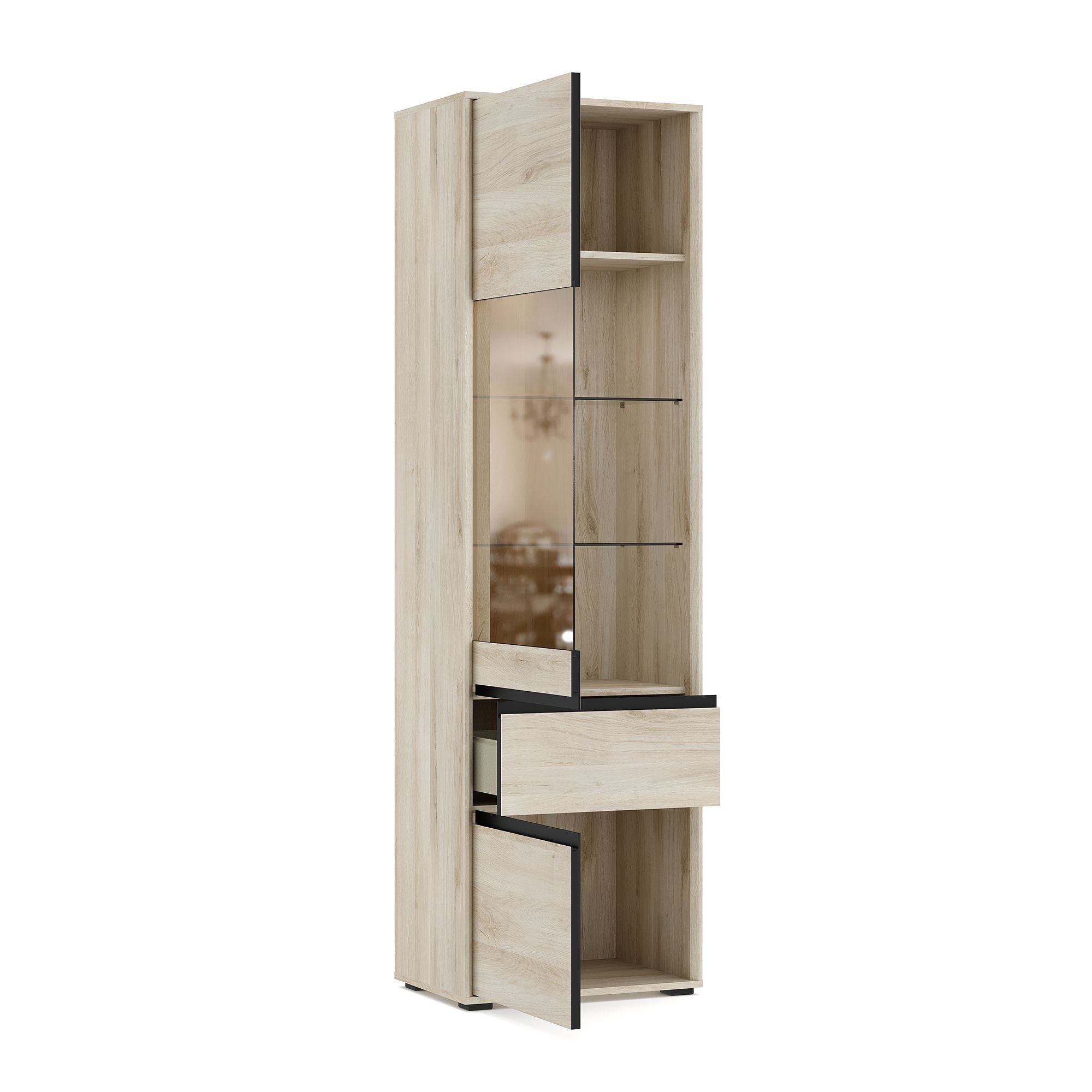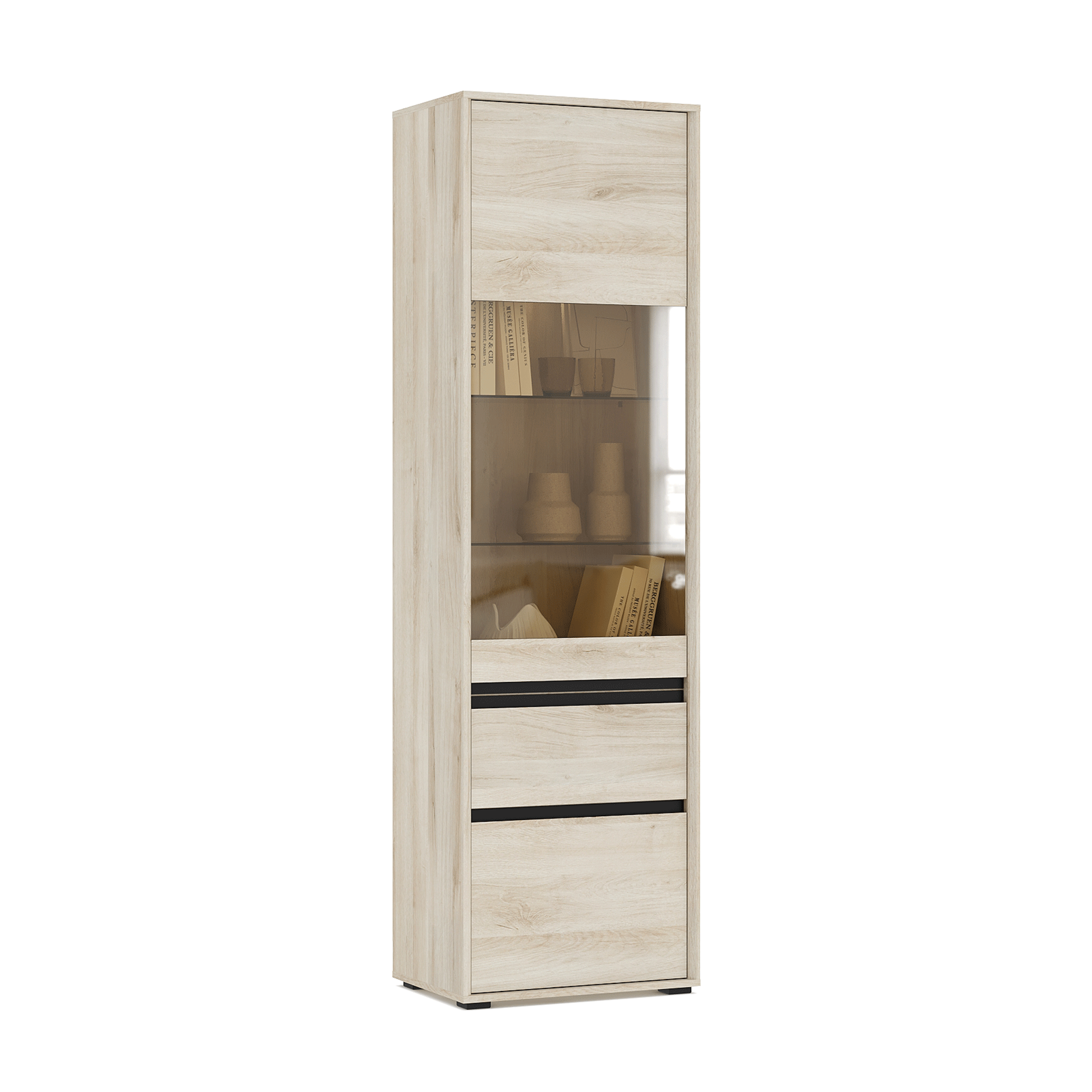 Шкаф-витрина LUNA высотой 206,8 см и шириной 60,1 см с корпусом в текстуре Дуб Anziano оснащен выдвижным ящиком и распашными фасадами с интегрированными J-ручками. За вставкой из тонированного стекла располагаются стеклянные полки, за сплошным фасадом – полки из ЛДСП. Возможно как левое, так и правое исполнение элемента. В качестве опции доступна система подсветки (заказывается отдельно).