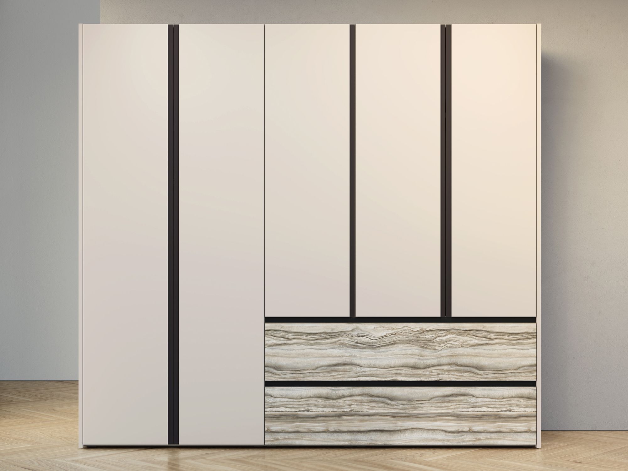 Шкаф предусматривает возможность индивидуального выбора внутреннего наполнения (полки, штанги, вставные тумбы с ящиками) и перестановки полок на удобную высоту. Это позволяет адаптировать систему хранения под особенности своего гардероба и обеспечить бережное хранение вещей.