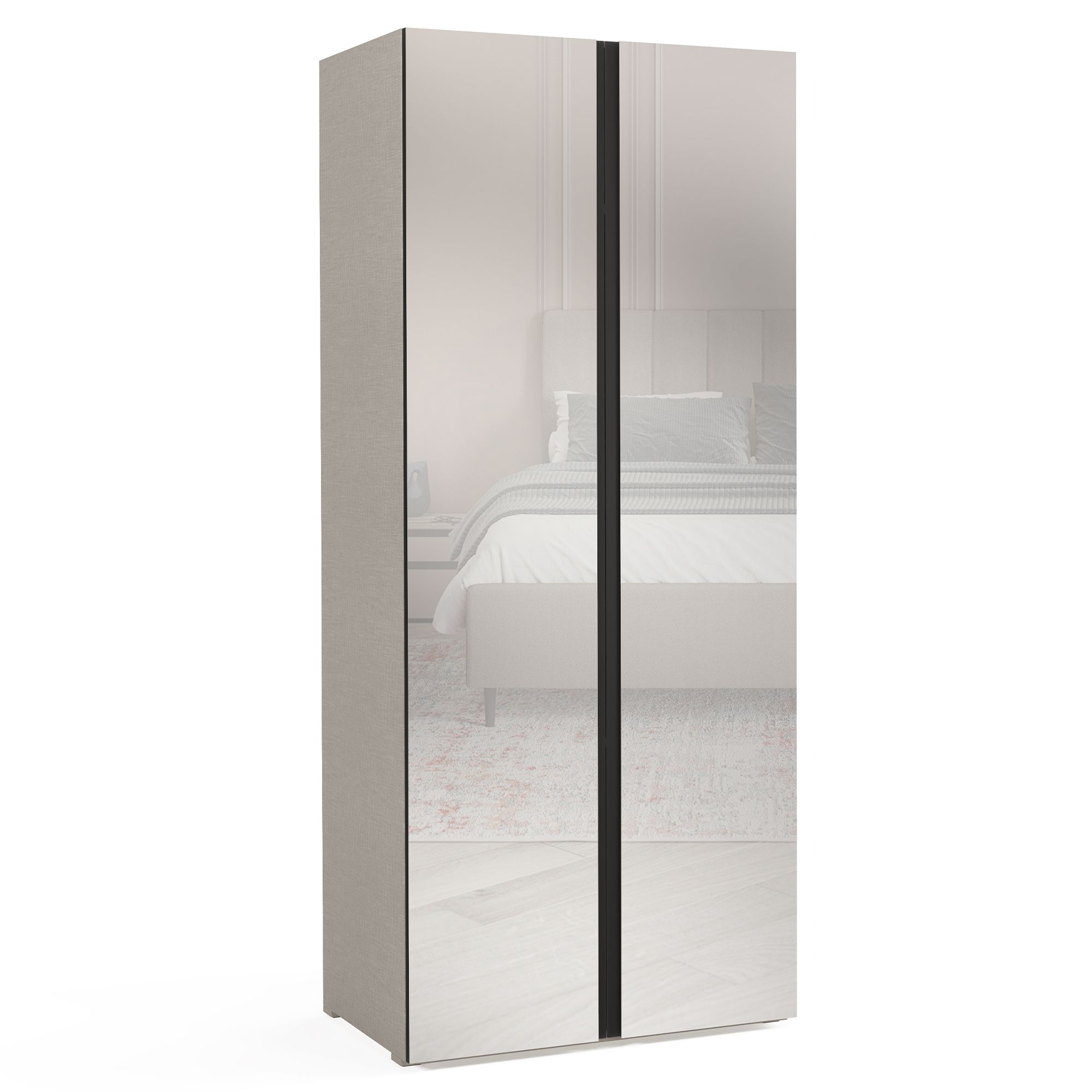 Внутреннее наполнение двухдверного шкафа ARTA с зеркальными фасадами включает две полки, к нижней из которых крепится штанга для вешалок. Подсветка с датчиком движения автоматически включается при открывании распашных фасадов (система включения подсветки с трансформатором и удлинитель заказываются отдельно). Корпус и внутреннее пространство шкафа выполнены в отделке текстурой Шенилл с рисунком плетения натуральной ткани. Шкаф оснащен J-ручками, которые располагаются вертикально по всей высоте фасадов.