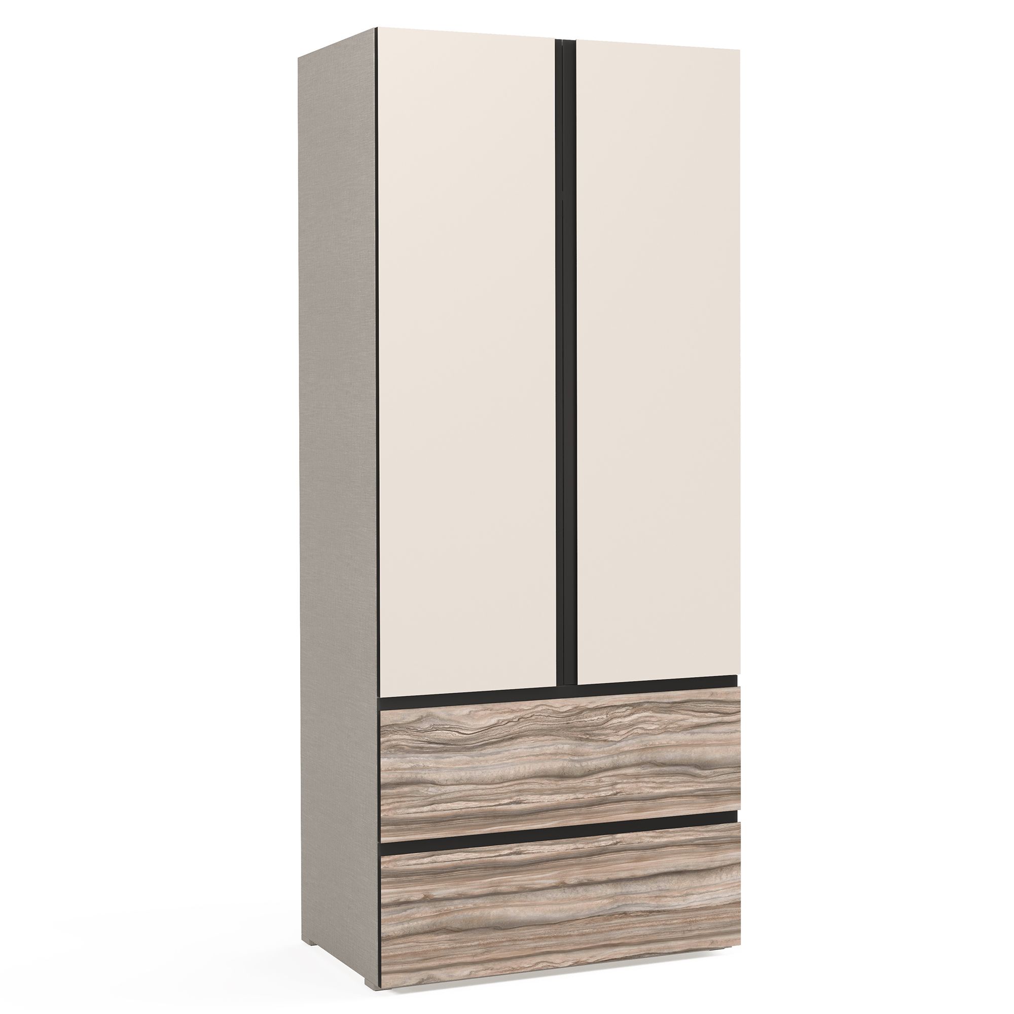 Боковые стенки (2 шт.) в текстуре Cachmere матовый включены в стоимость. При составлении комбинации из нескольких шкафов количество стенок может варьироваться в зависимости от выбранных модулей.