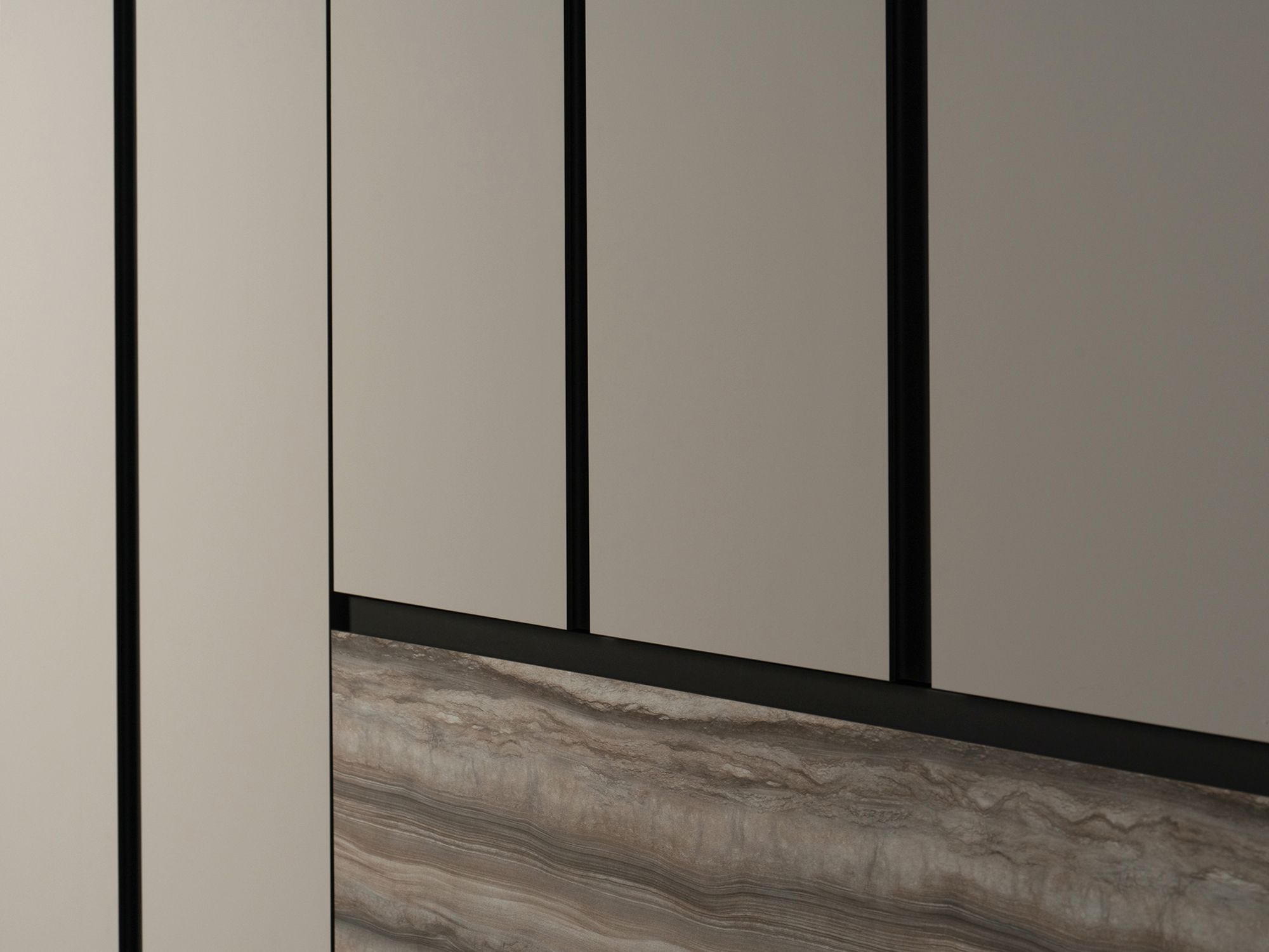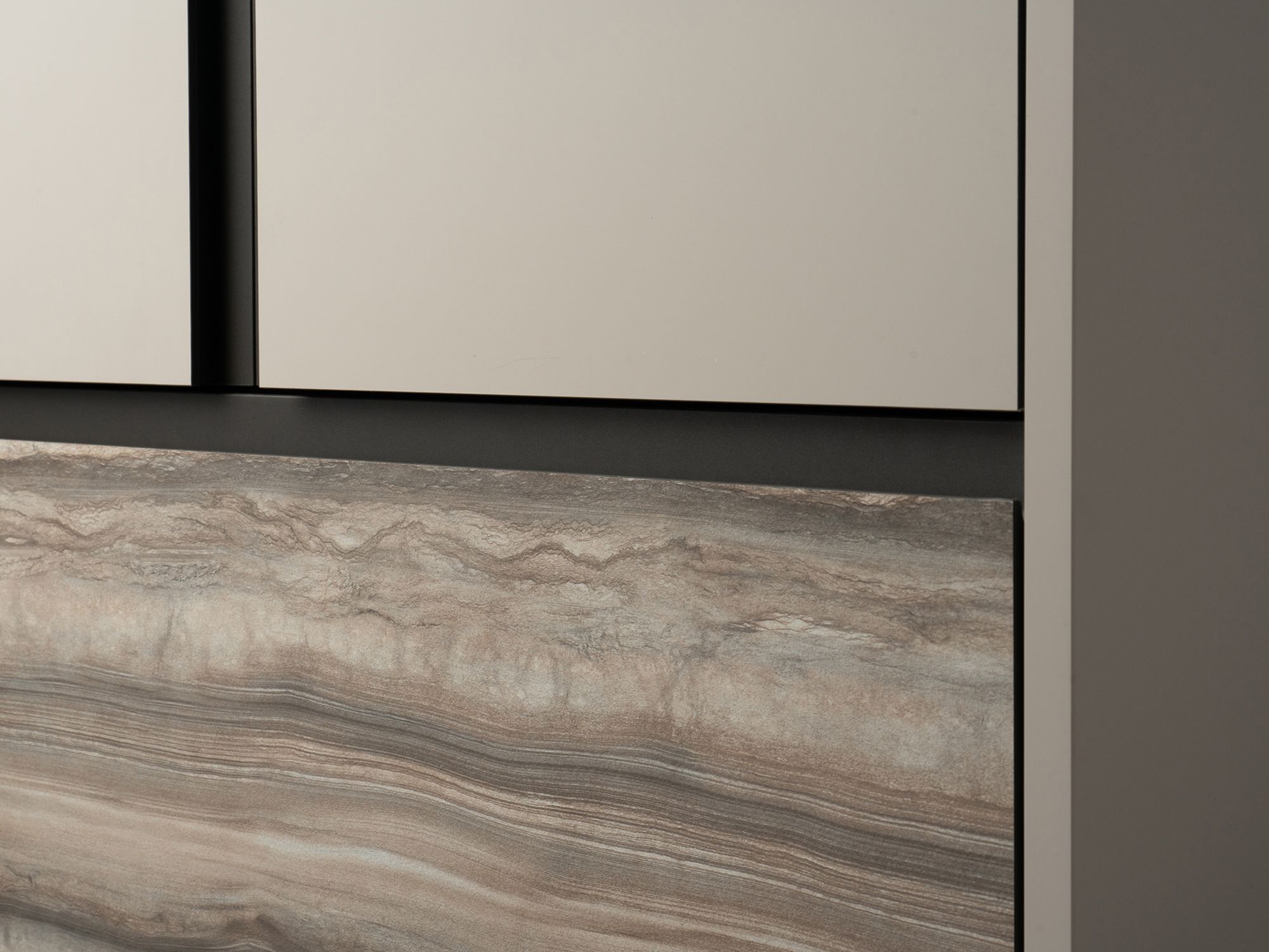 Двух- и трехдверные шкафы коллекции оснащаются вместительными выдвижными ящиками, для доступа к которым не требуется открывание фасада. Ящики выполнены в отделке акцентной текстуре мрамора.