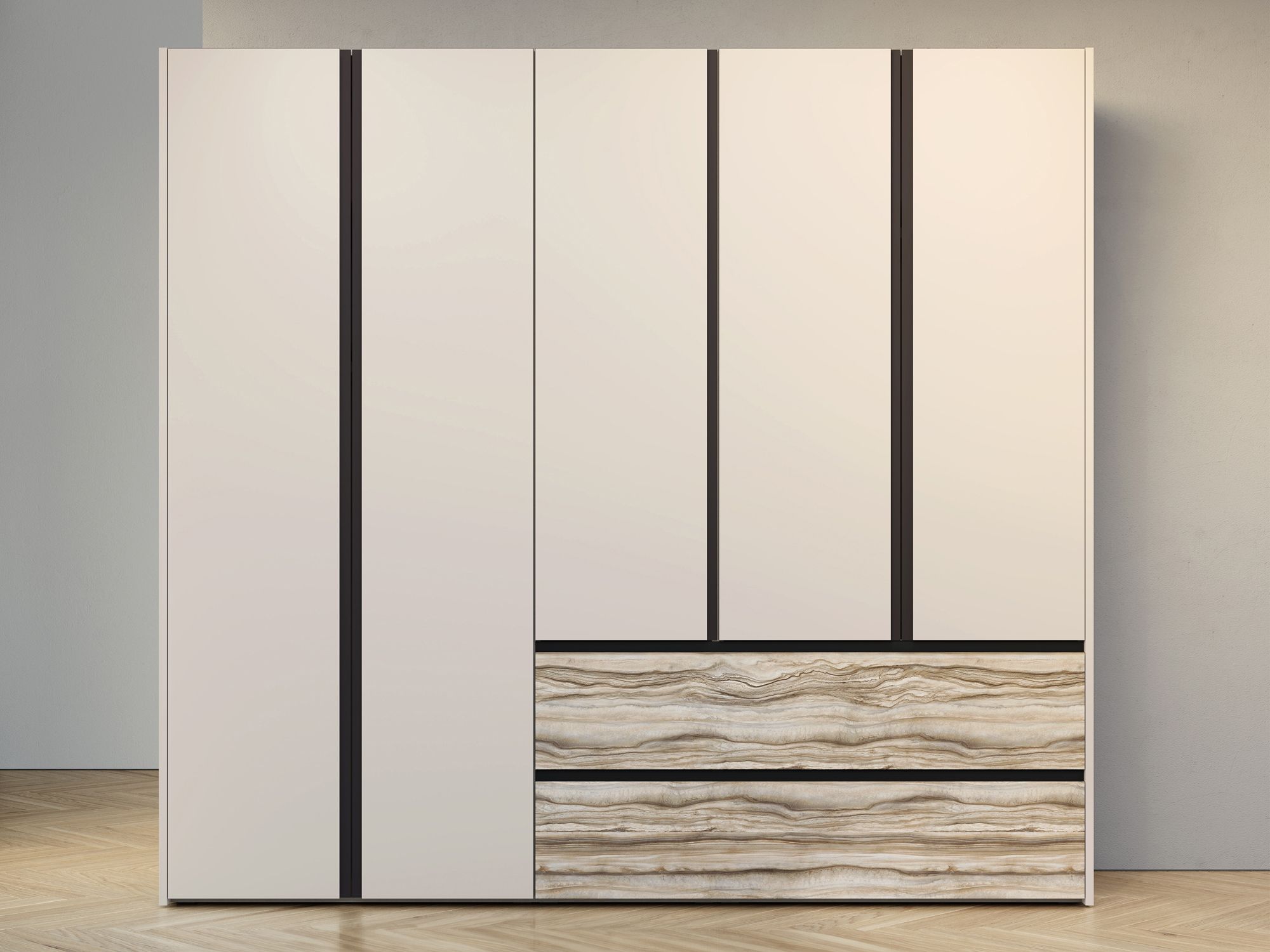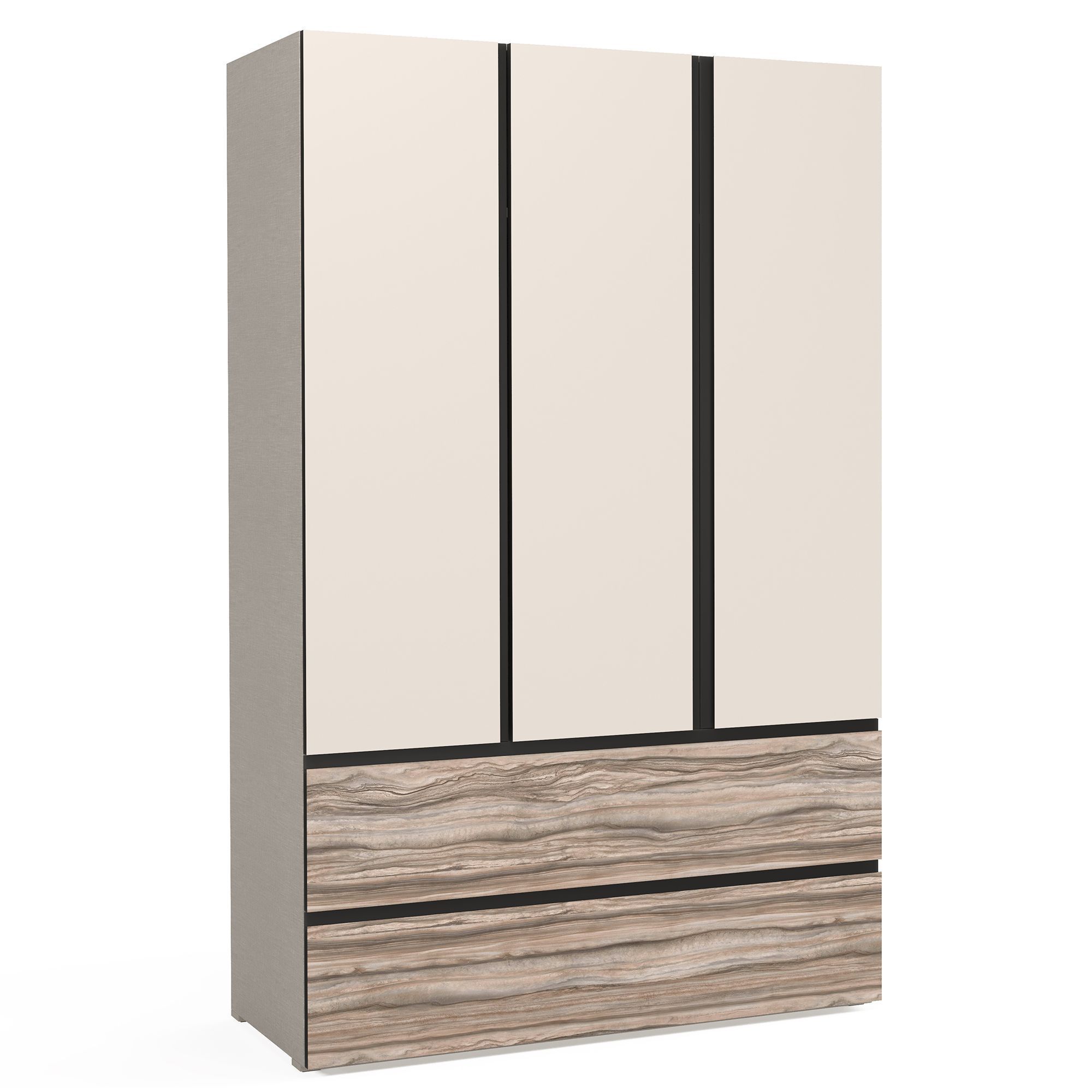 Двух- и трехдверные шкафы коллекции оснащаются вместительными выдвижными ящиками, для доступа к которым не требуется открывание фасада. Ящики выполнены в отделке акцентной текстуре мрамора.
