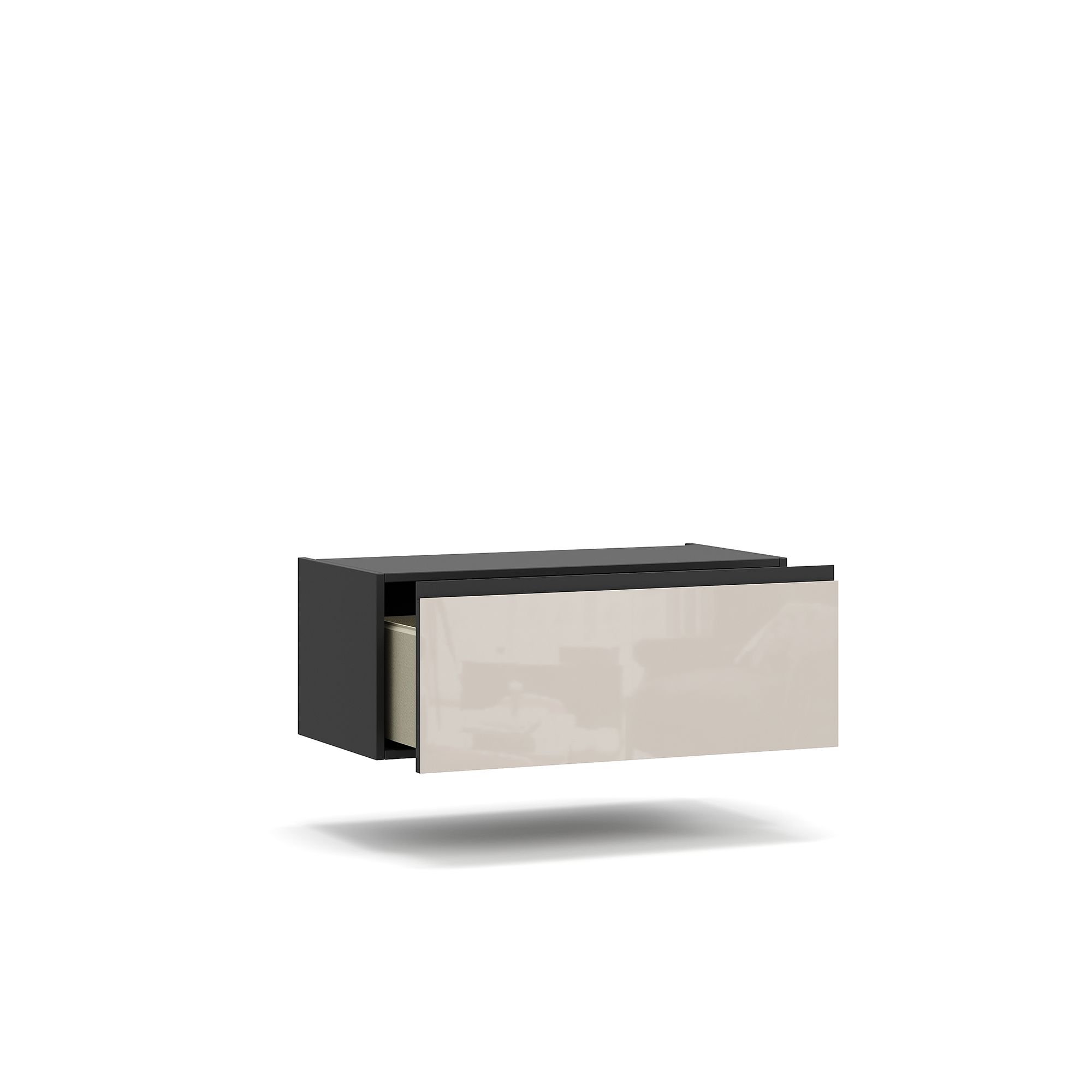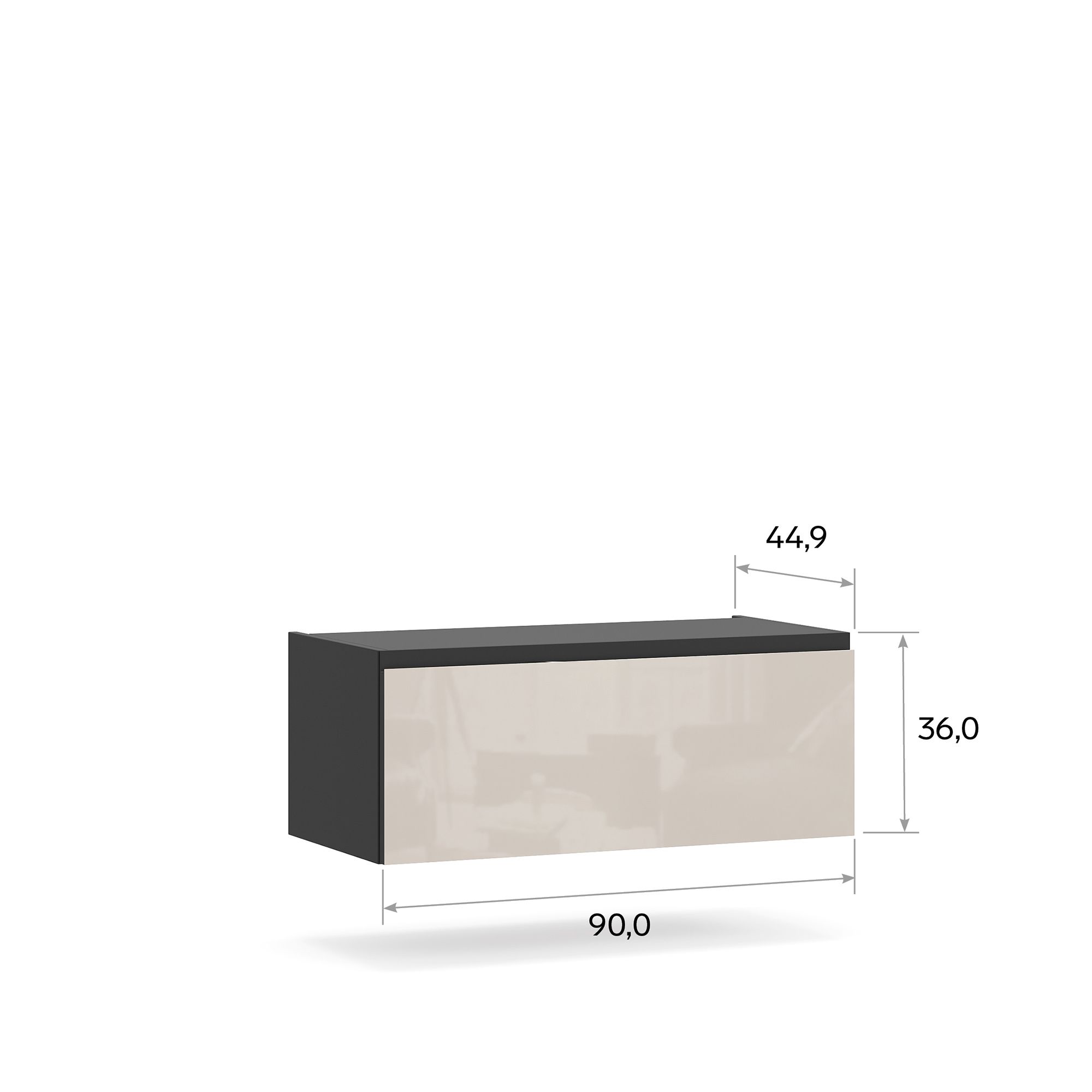 Фасад навесного шкафа BRUNO, оборудованного выдвижным ящиком с прочными металлическими царгами, оснащен интегрированной J-ручкой серого цвета. За задней стенкой шкафа предусмотрена ниша глубиной 5,4 см для размещения проводов. Максимально допустимая распределенная нагрузка на изделие составляет 30 кг. В стоимость изделия включена крышка в древесной текстуре. Использование шкафа без этого элемента дизайном не предусмотрено.