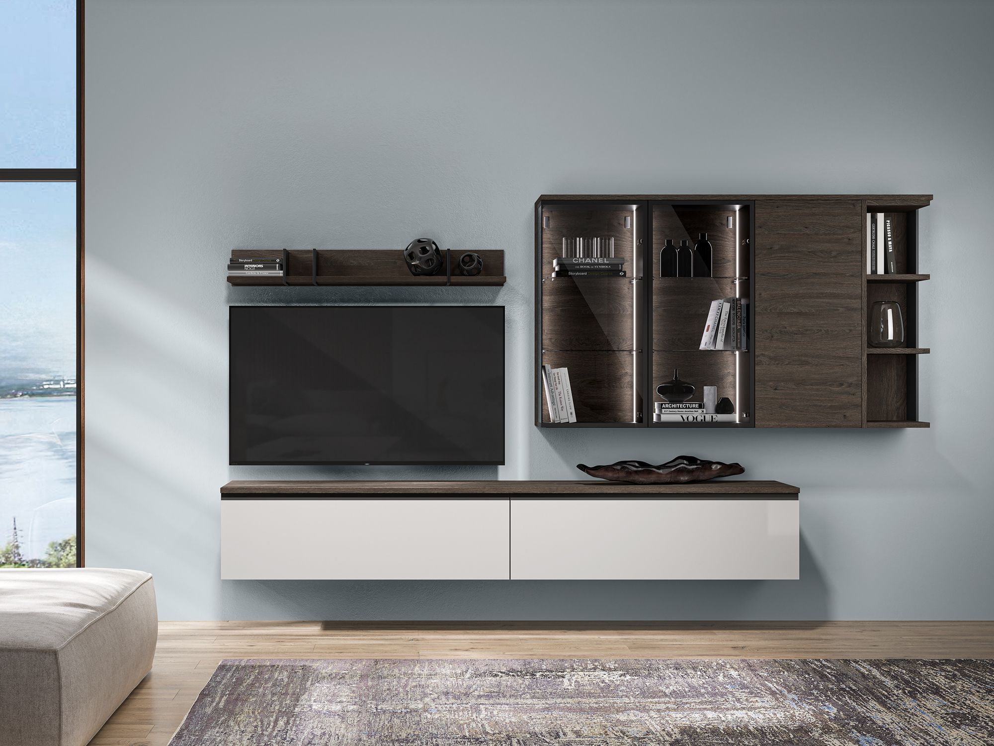 Фасад навесного шкафа BRUNO, оборудованного выдвижным ящиком с прочными металлическими царгами, оснащен интегрированной J-ручкой серого цвета. За задней стенкой шкафа предусмотрена ниша глубиной 5,4 см для размещения проводов. Максимально допустимая распределенная нагрузка на изделие составляет 30 кг. В стоимость изделия включена крышка в древесной текстуре. Использование шкафа без этого элемента дизайном не предусмотрено.
