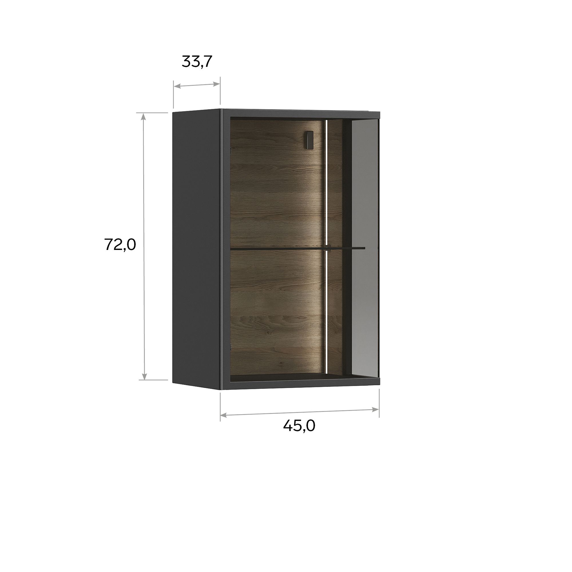Навесной шкаф-витрина BRUNO с подсветкой оснащен Г-образным фасадом из закаленного бронзированного стекла, заключенного в стильную раму из черного металла, который открывается от нажатия благодаря встроенной Push-системе. Максимально допустимая распределенная нагрузка на изделие составляет 20 кг. В стоимость изделия включена крышка в древесной текстуре. Система включения/выключения светового оборудования заказывается отдельно.