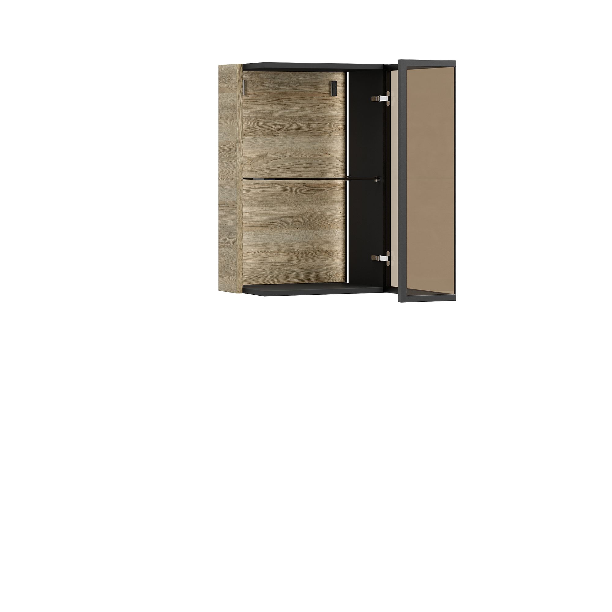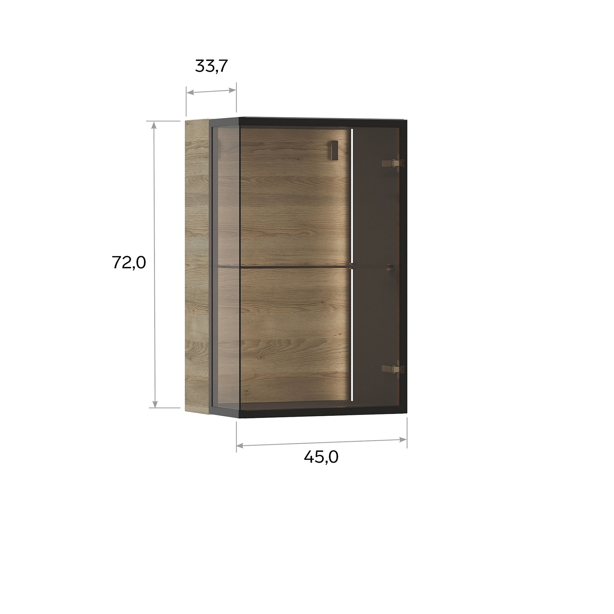 Навесной шкаф-витрина BRUNO с подсветкой оснащен Г-образным фасадом из закаленного бронзированного стекла, заключенного в стильную раму из черного металла, который открывается от нажатия благодаря встроенной Push-системе. Максимально допустимая распределенная нагрузка на изделие составляет 20 кг. В стоимость изделия включена крышка в древесной текстуре. Система включения/выключения светового оборудования заказывается отдельно.