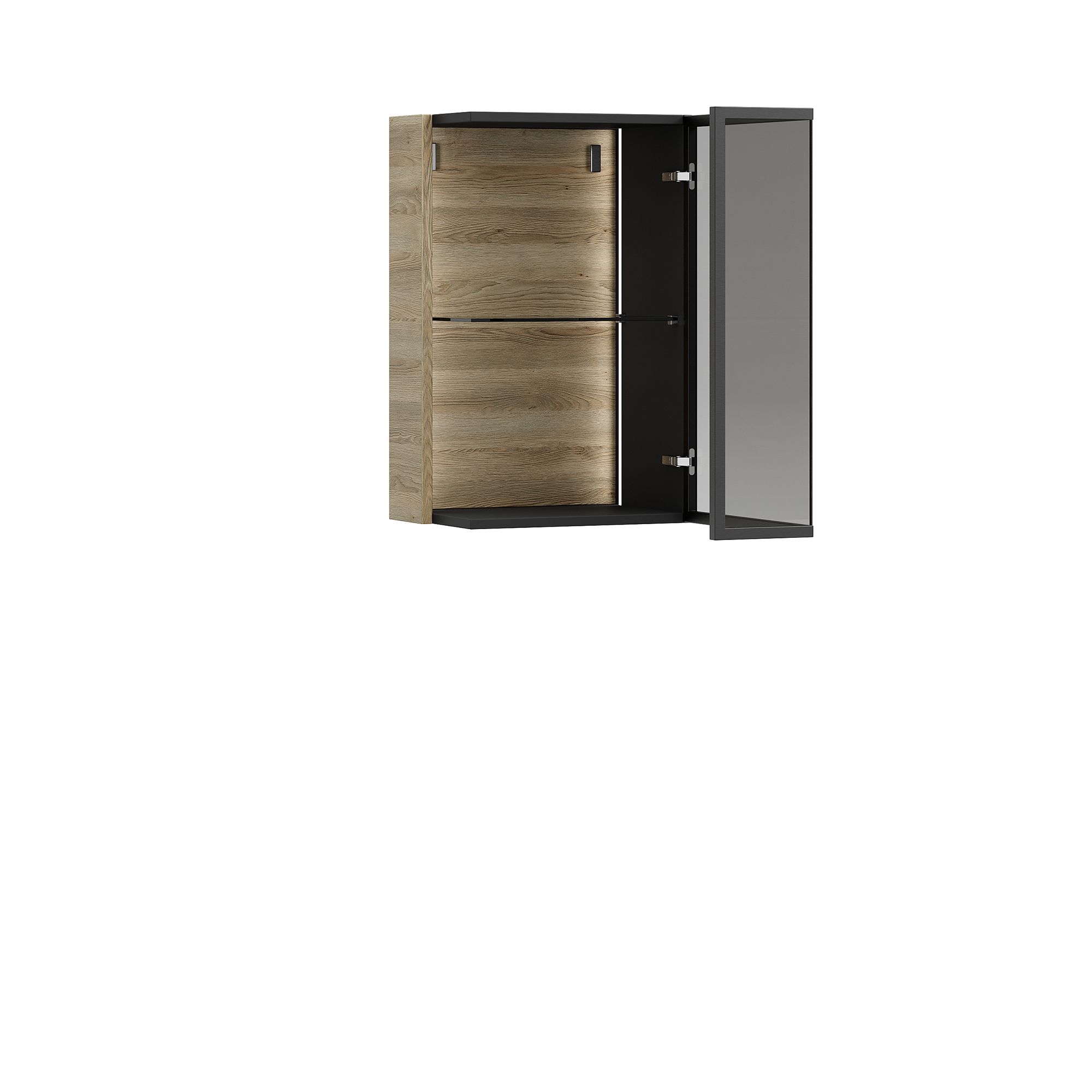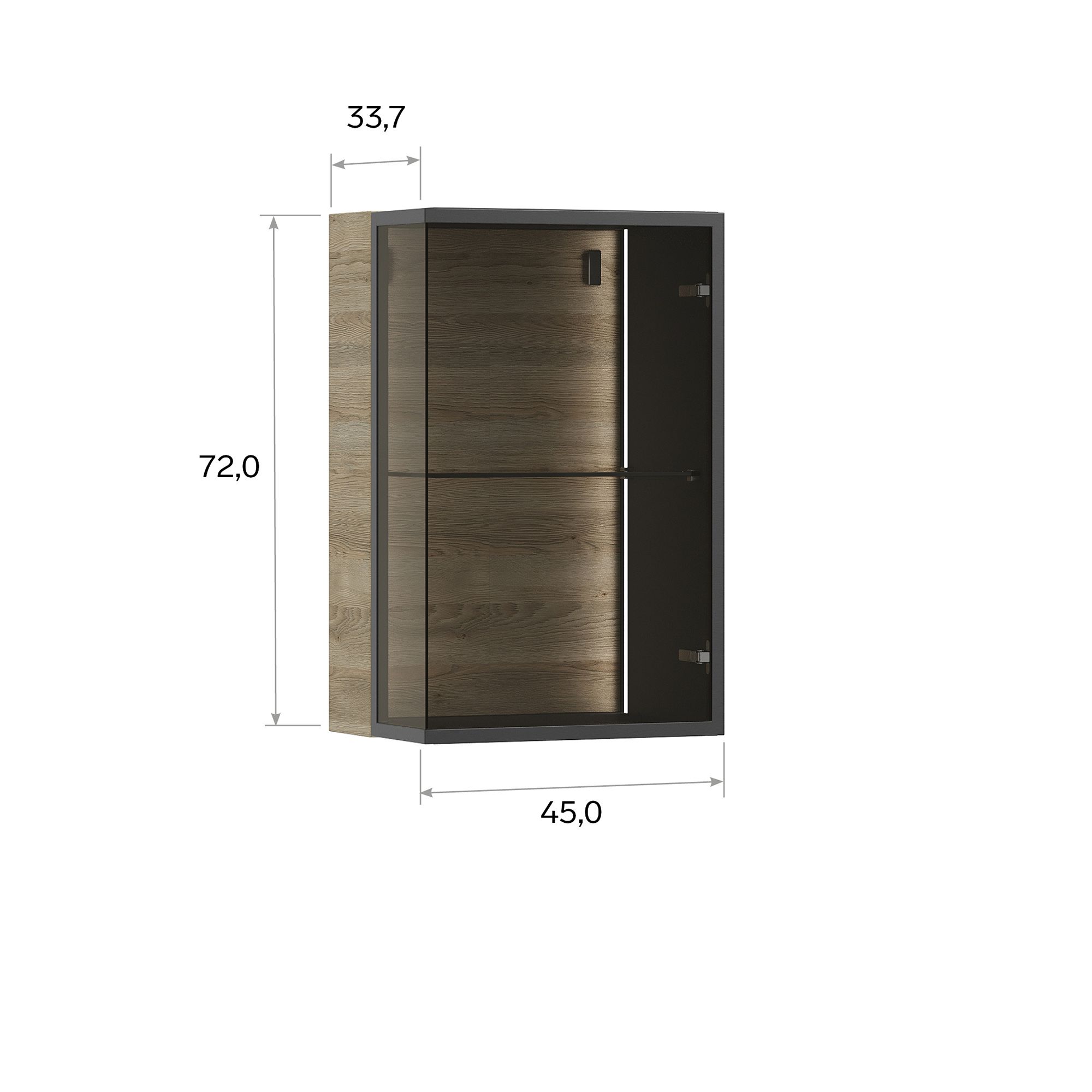 Навесной шкаф-витрина BRUNO с подсветкой оснащен Г-образным фасадом из закаленного бронзированного стекла, заключенного в стильную раму из черного металла, который открывается от нажатия благодаря встроенной Push-системе. Максимально допустимая распределенная нагрузка на изделие составляет 20 кг. В стоимость изделия включена крышка в древесной текстуре. Система включения/выключения светового оборудования заказывается отдельно.