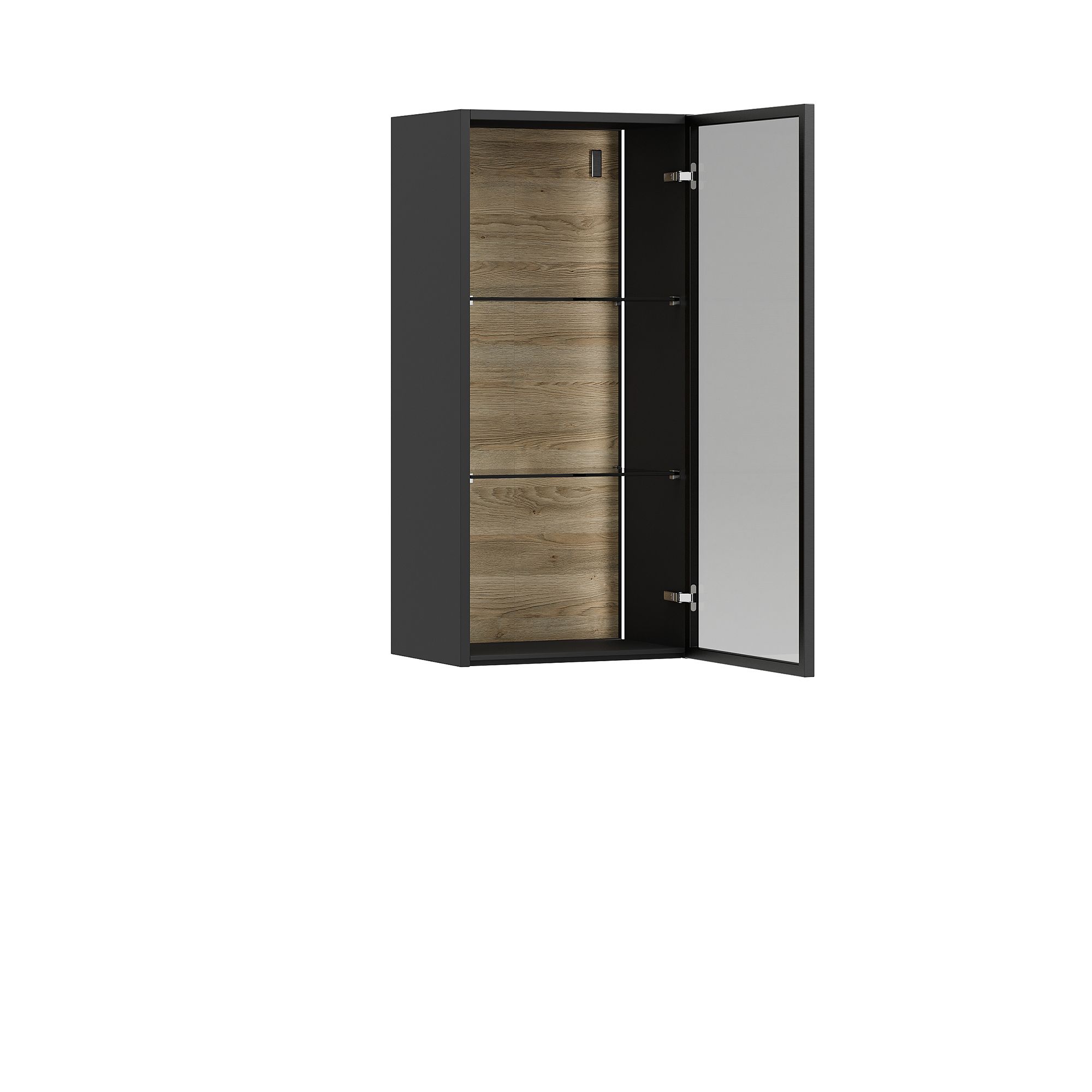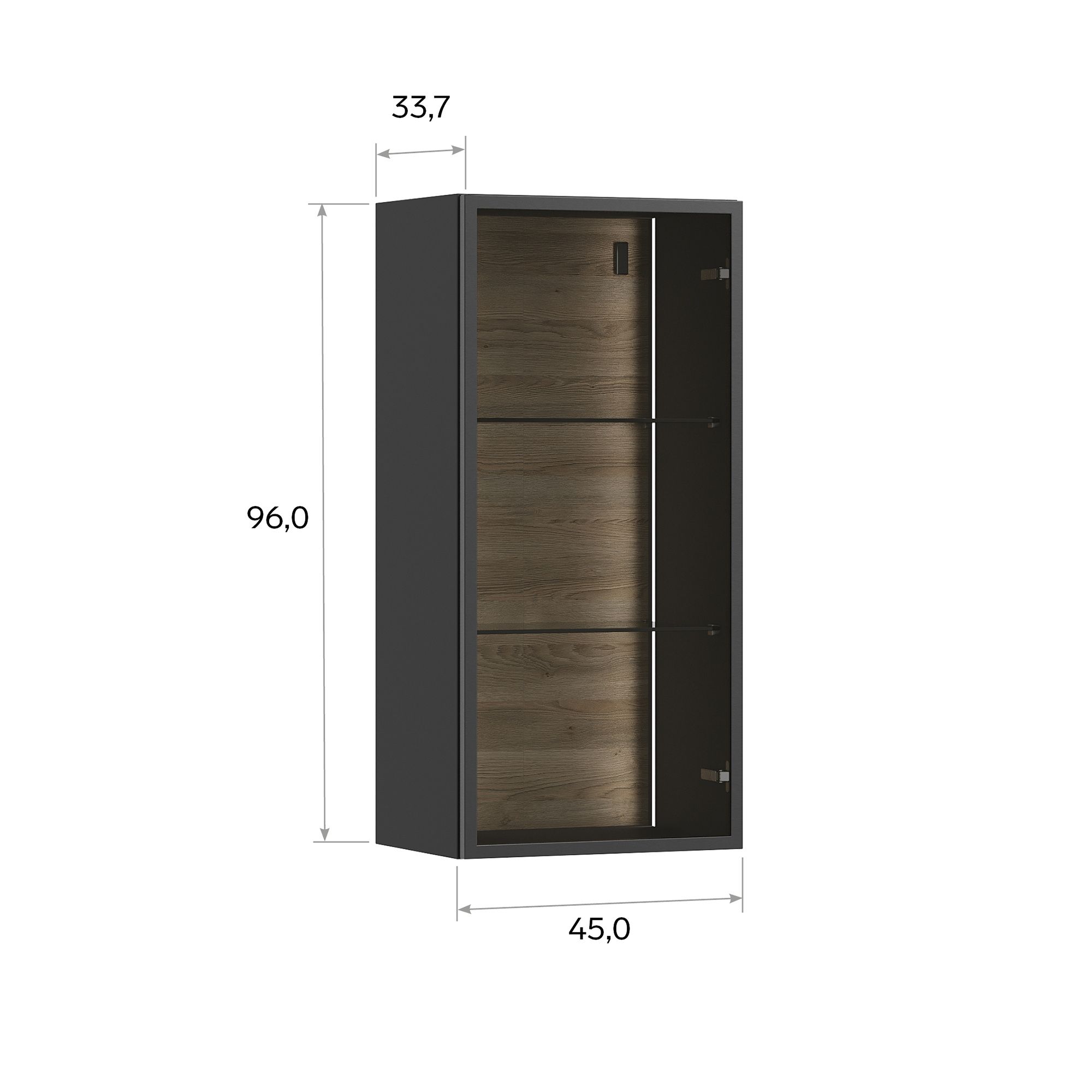 В навесном шкафу-витрине BRUNO с подсветкой и закаленным бронзированным стеклом, заключенным в стильную раму из черного металла, используется современная система открывания с профилем Gola. Максимально допустимая распределенная нагрузка на изделие составляет 20 кг. В стоимость изделия включена крышка в древесной текстуре. Система включения/выключения светового оборудования заказывается отдельно.