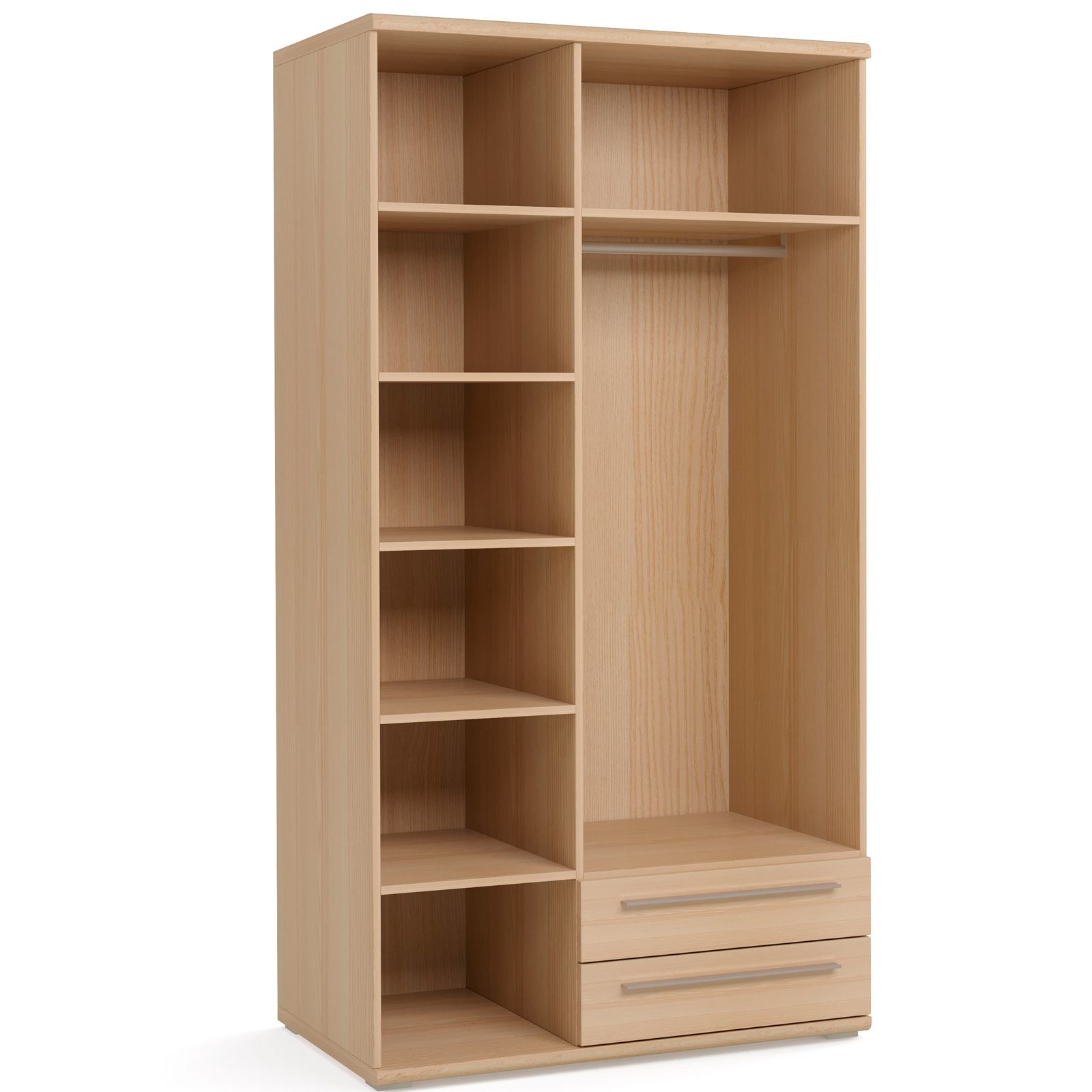 Над ящиками располагается секция, оборудованная двумя полками, к нижней из которых крепится штанга для вешалок. Внутреннее наполнение другой секции представляет собой систему полок. Все шкафы оснащены системой плавного открывания дверей и доводчиками уже в базовой комплектации. Исполнение ручек: Хром-глянец.