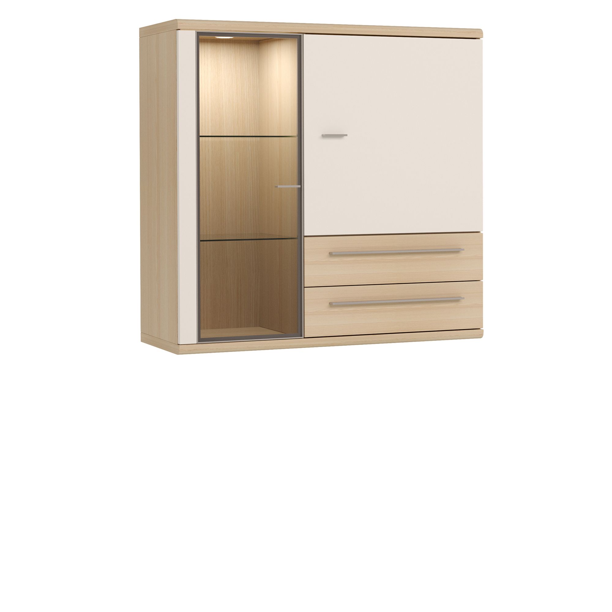 Настенный шкаф ESTE оснащен распашными фасадами и выдвижными ящиками. За закаленным бронзированным стеклом расположены стеклянные полки и система внутренней подсветки.