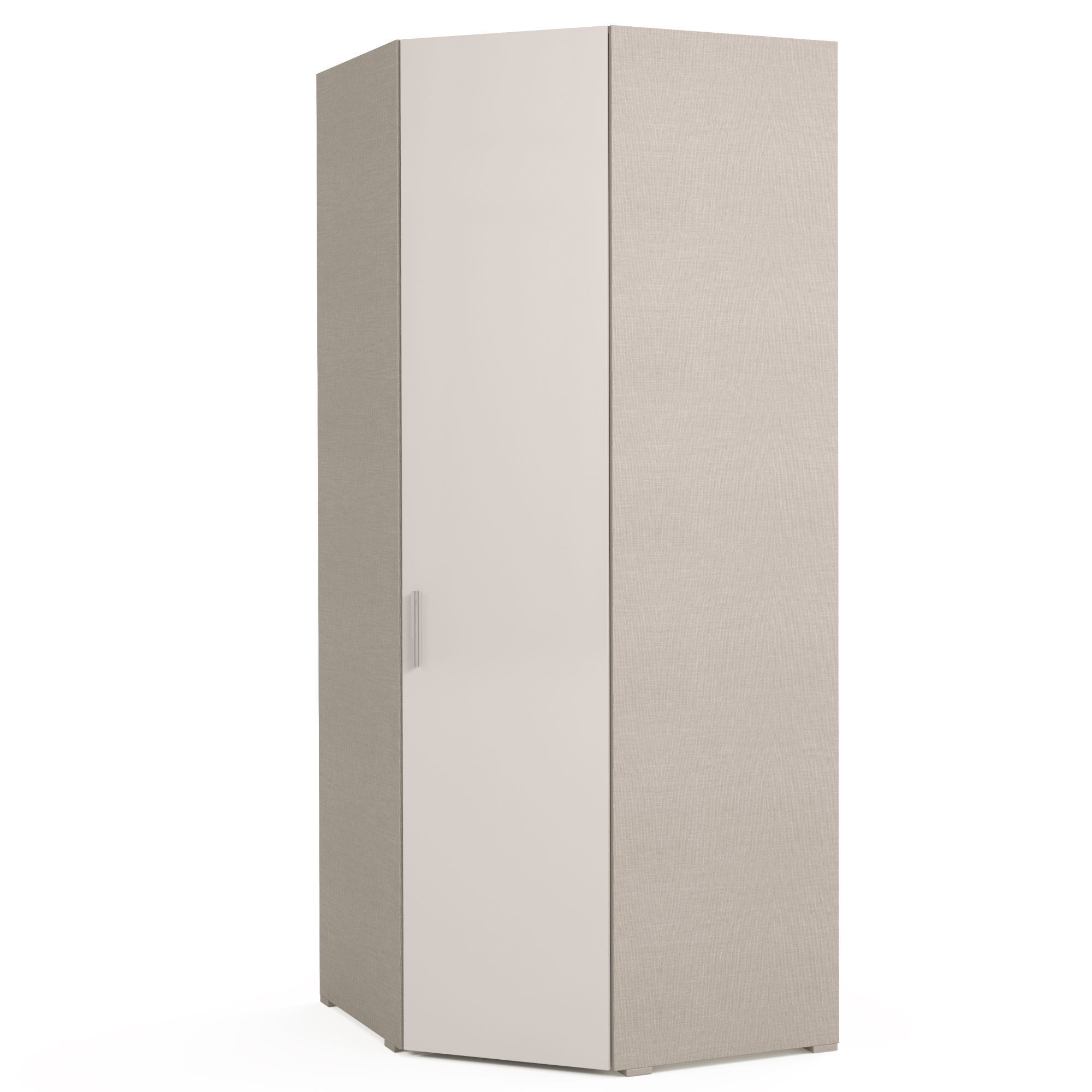 Угловой шкаф ESTE оснащен белым высокоглянцевым фасадом. В правом отделении размещена полка с прикрепленной к ней штангой, в левом – система из пяти полок. Внешний и внутренний декор корпуса выполнен в текстуре Шенилл темный. Шкаф оборудован системой подсветки, которая автоматически включается при открывании. В комплектацию включены ручки в отделке Хром-глянец. Предусмотрена возможность замены на ручки в отделке Черный никель. ВАЖНО! Система включения с трансформатором, а также боковые стенки и карнизы соответствующей конфигурации (с закруглением или без) заказываются отдельно.