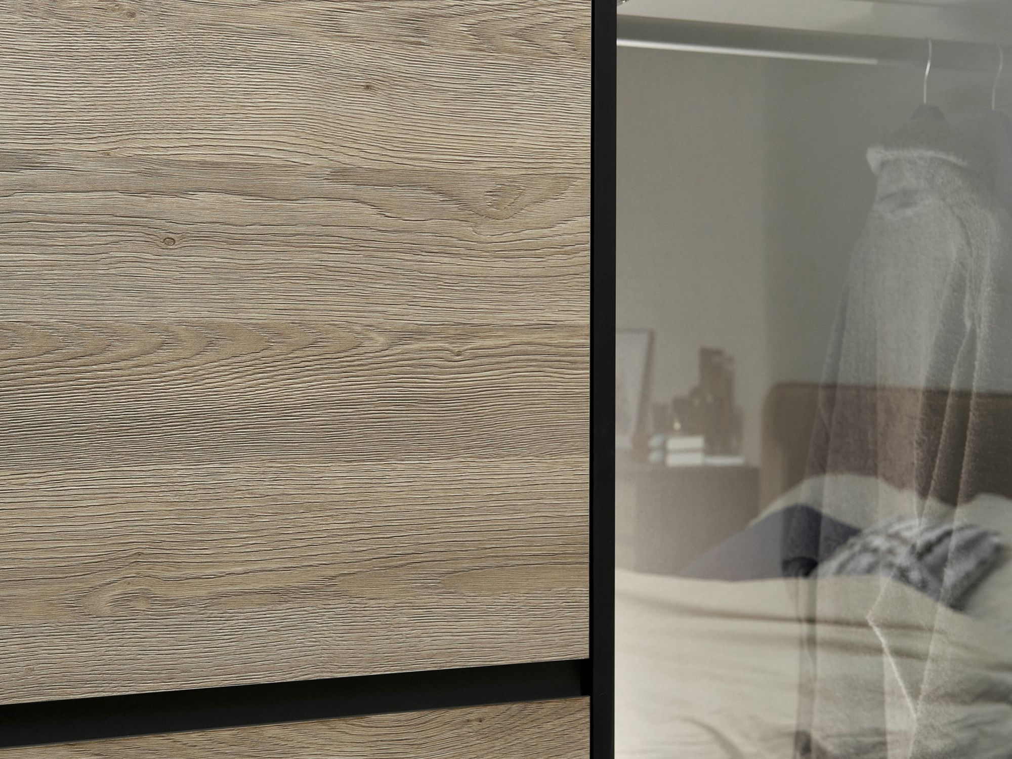 Отделка создает полное ощущение натурального дерева благодаря точнейшей проработке рисунка и рельефа. Тактильная поверхность создается с использованием инновационной технологии «глубокая пора». Текстура представлена в двух оттенках: Серо-бежевый и Сепия.