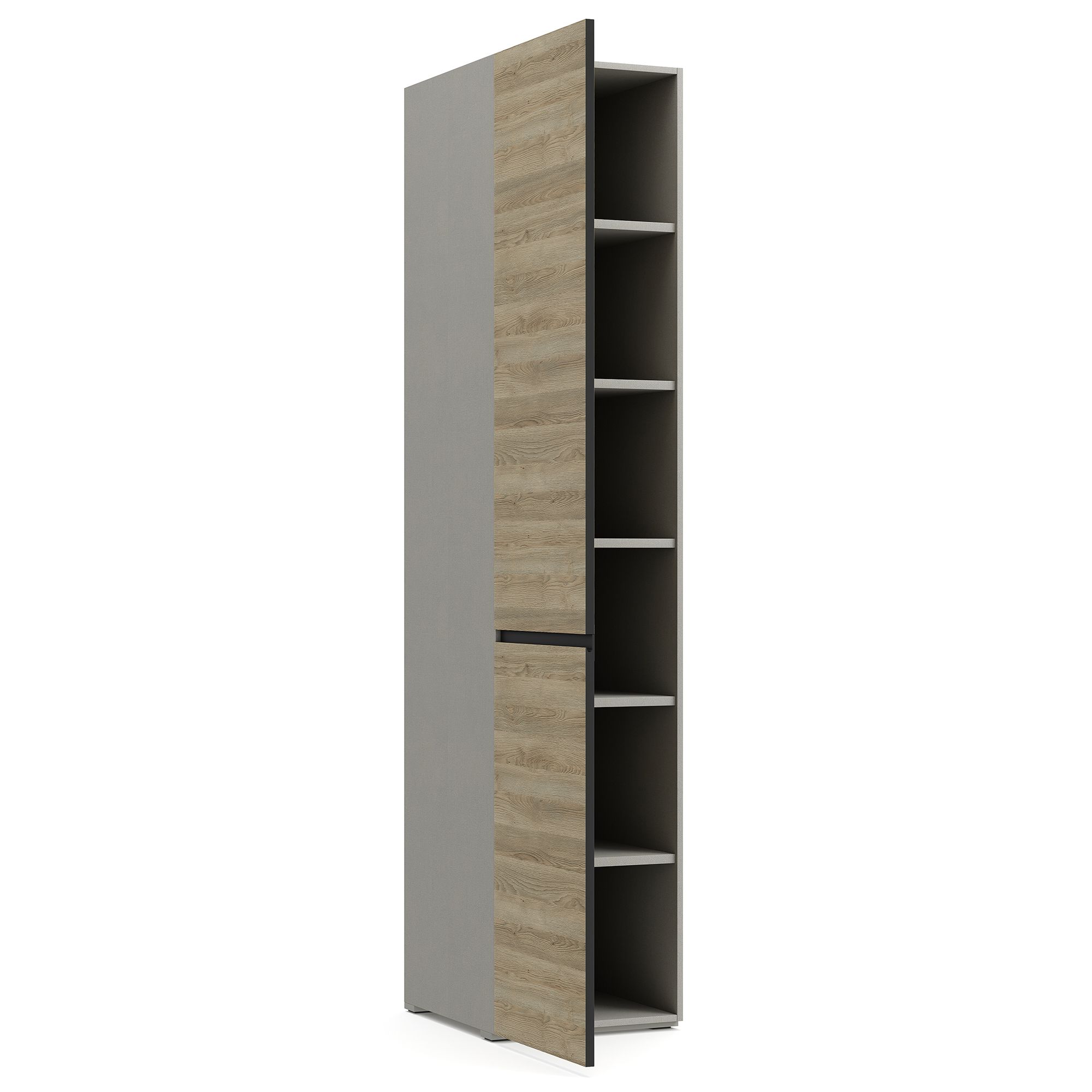 За фасадом однодверного шкафа BRUNO, оснащенным эргономичной J-ручкой, расположена система полок. Внутреннее пространство шкафа выполнено в отделке текстурой Шенилл. Возможно исполнение как с правым, так и с левым открыванием двери. Глубина шкафа указана без учета фасада. В стоимость изделия включены боковые стенки (2 шт.) в древесной текстуре (возможна замена на стенки в черном цвете).