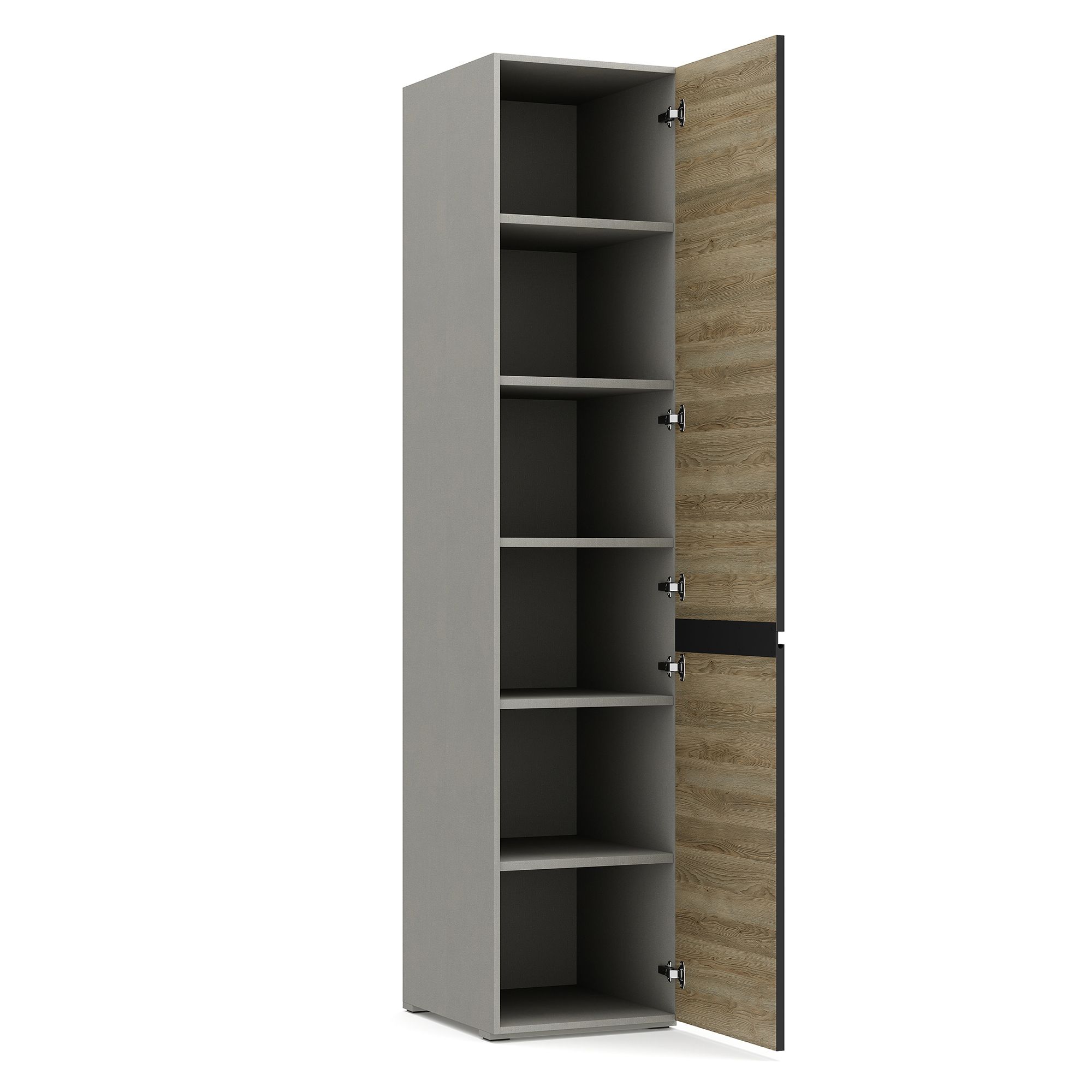 За фасадом однодверного шкафа BRUNO, оснащенным эргономичной J-ручкой, расположена система полок. Внутреннее пространство шкафа выполнено в отделке текстурой Шенилл. Возможно исполнение как с правым, так и с левым открыванием двери. Глубина шкафа указана без учета фасада. В стоимость изделия включены боковые стенки (2 шт.) в древесной текстуре (возможна замена на стенку в черном цвете). Конструкция шкафа предусматривает возможность индивидуального формирования системы хранения за счет выбора дополнительных элементов внутреннего наполнения – полок, штанг и вставных тумб (заказываются отдельно). * Внешний вид реальных изделий может незначительно отличаться от представленных на сайте. В частности, на смежных фасадах допустимо смещение рисунков древесной текстуры относительно друг друга.