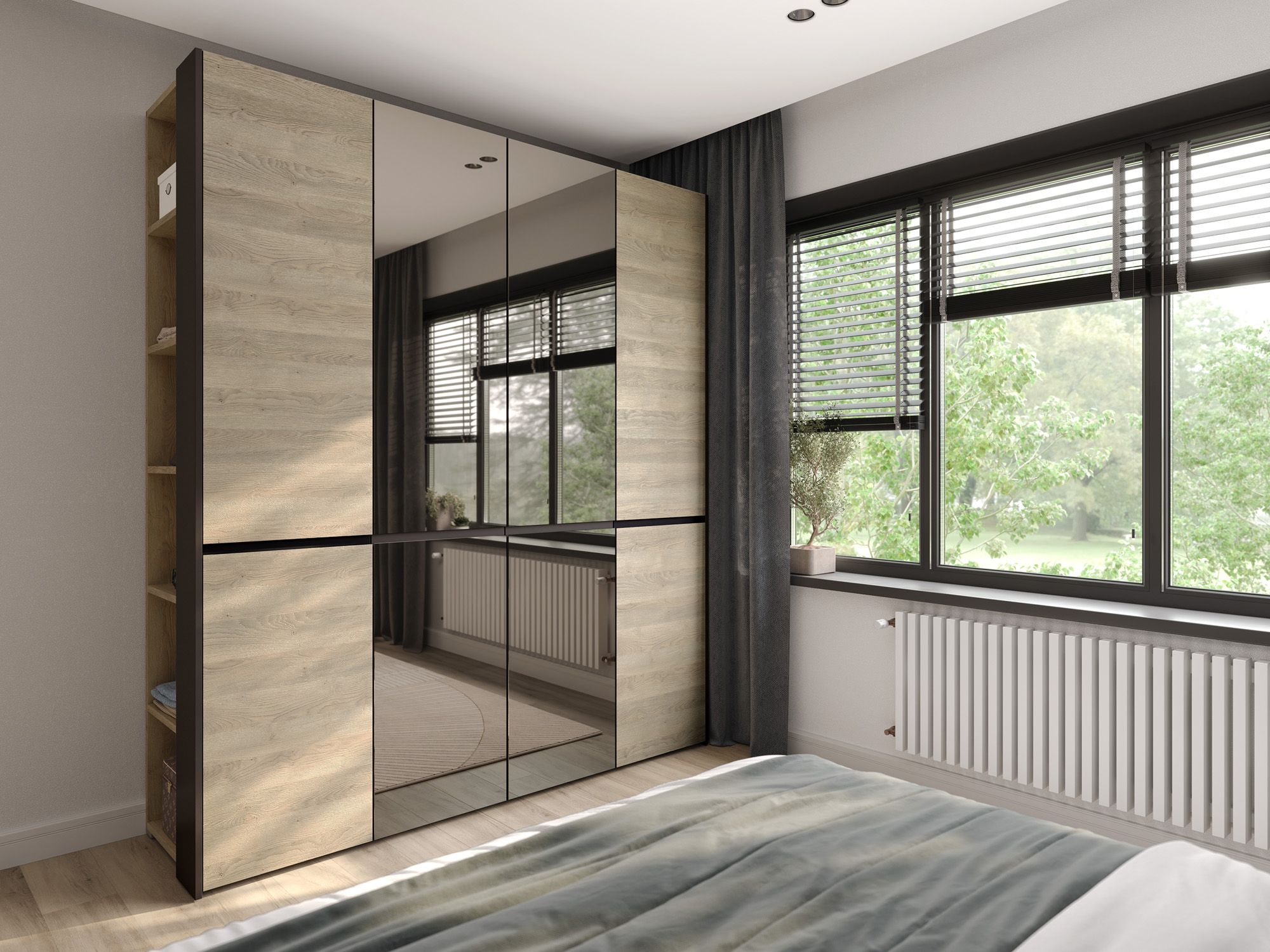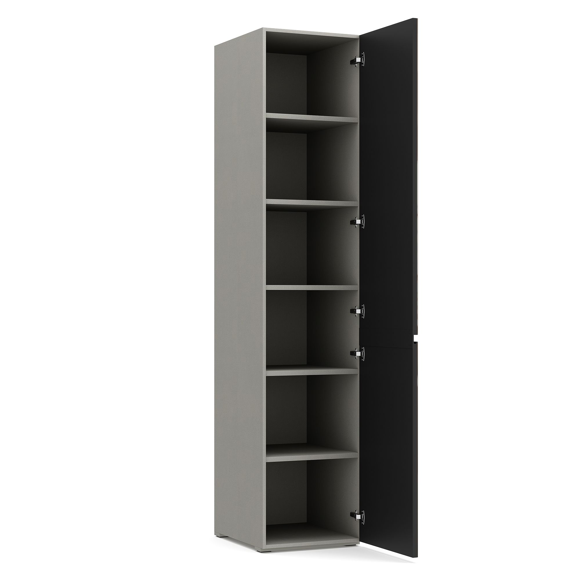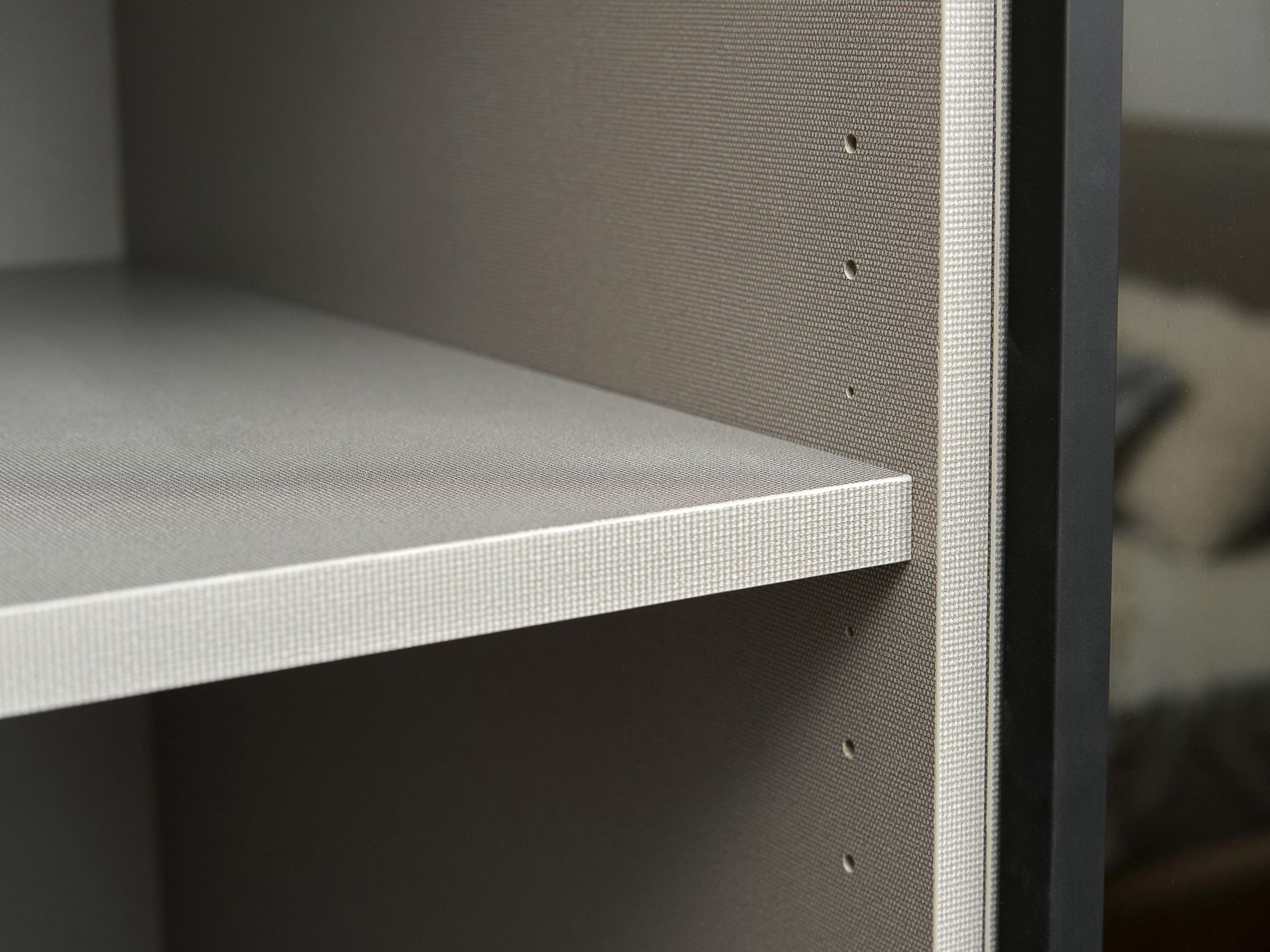 За зеркальным фасадом однодверного шкафа BRUNO, оснащенным эргономичной J-ручкой, расположена система полок. Внутреннее пространство шкафа выполнено в отделке текстурой Шенилл. Возможно исполнение как с правым, так и с левым открыванием двери. Глубина шкафа указана без учета фасада. В стоимость изделия включены боковые стенки (2 шт.) в черном цвете (возможна замена на стенку в древесной текстуре).