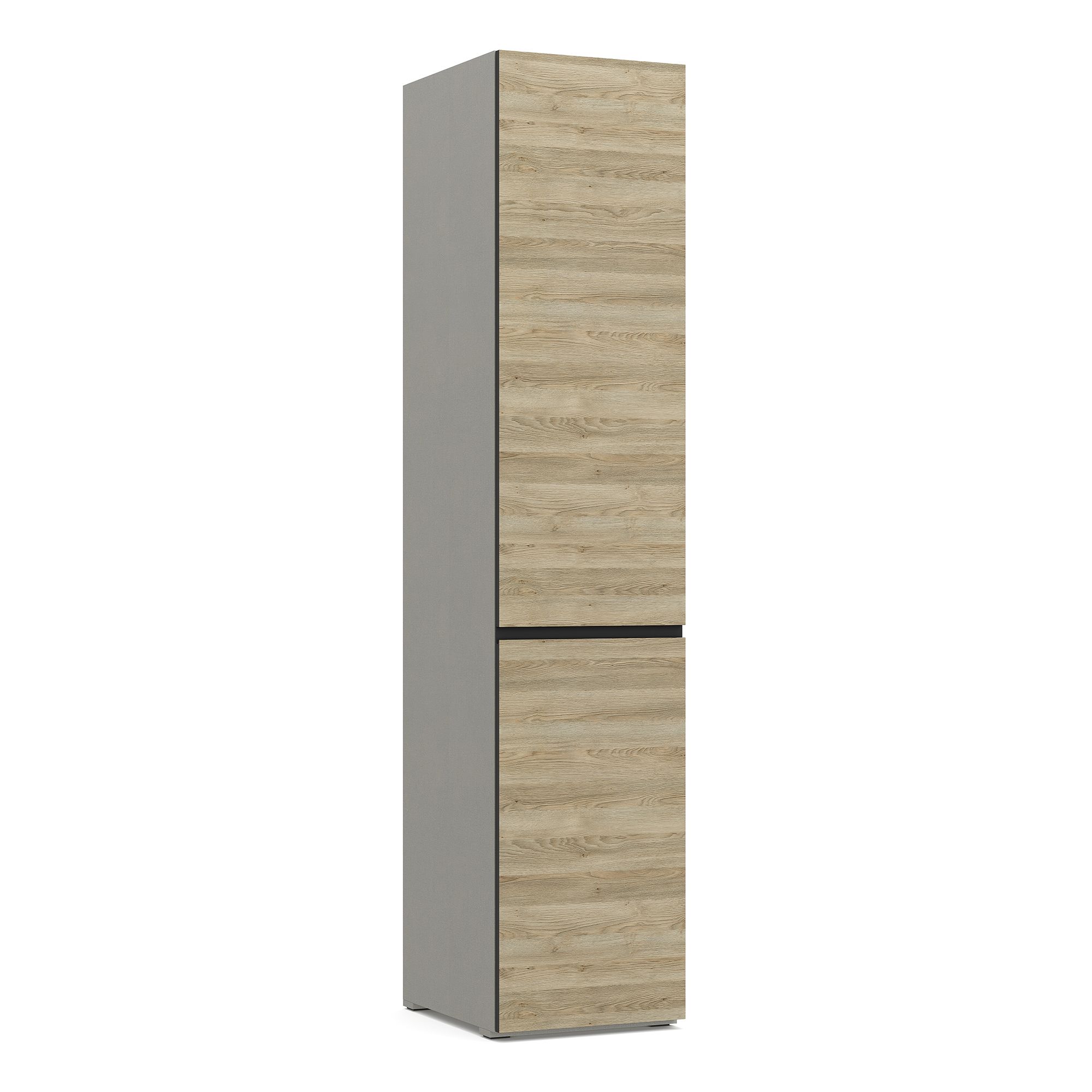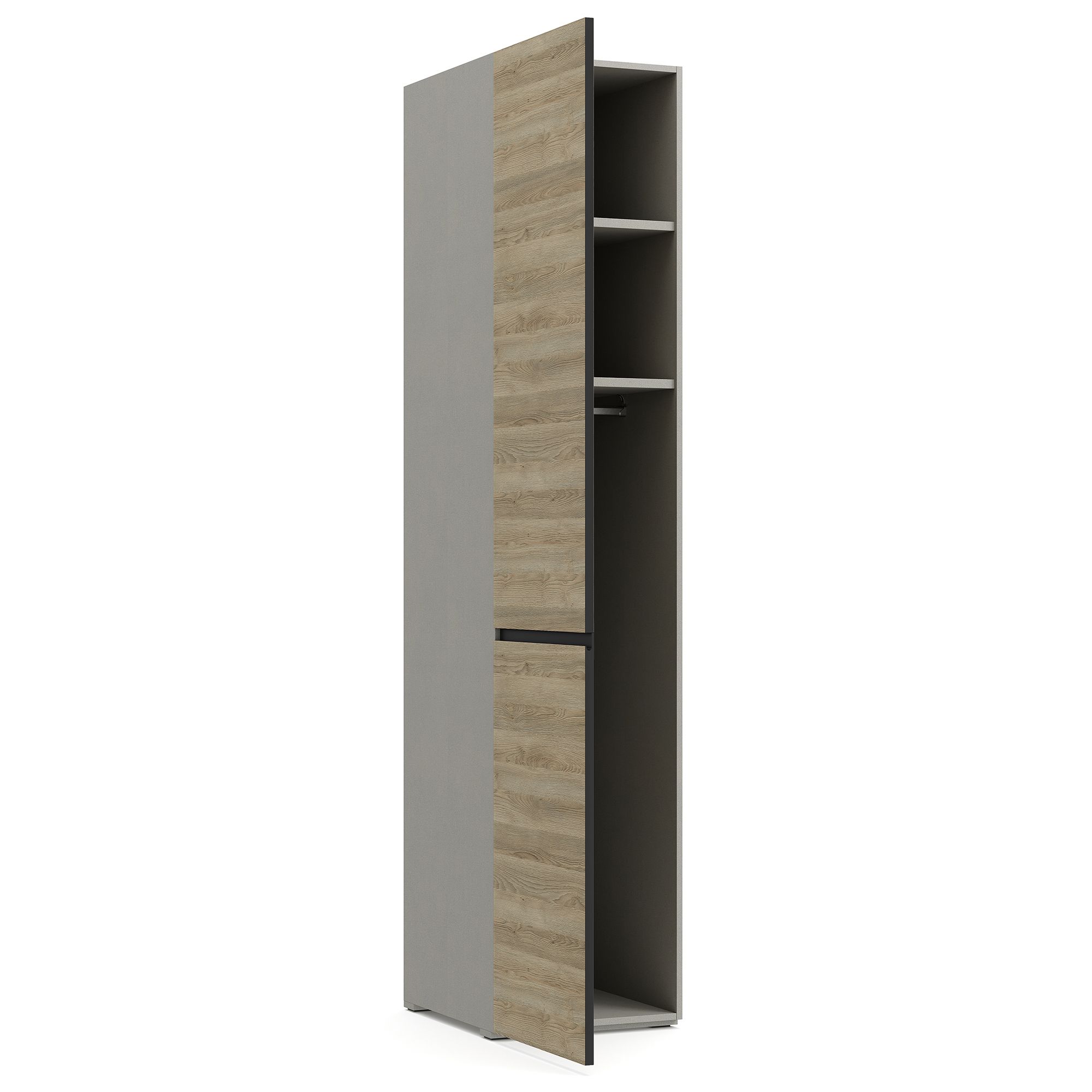 Внутреннее наполнение однодверного шкафа BRUNO с фасадом, оснащенным эргономичной J-ручкой, предусматривает две полки, к нижней из которых крепится штанга для вешалок. Внутреннее пространство шкафа выполнено в отделке текстурой Шенилл. Возможно исполнение как с правым, так и с левым открыванием двери. Глубина шкафа указана без учета фасада. В стоимость изделия включены боковые стенки (2 шт.) в древесной текстуре (возможна замена на стенку в черном цвете).