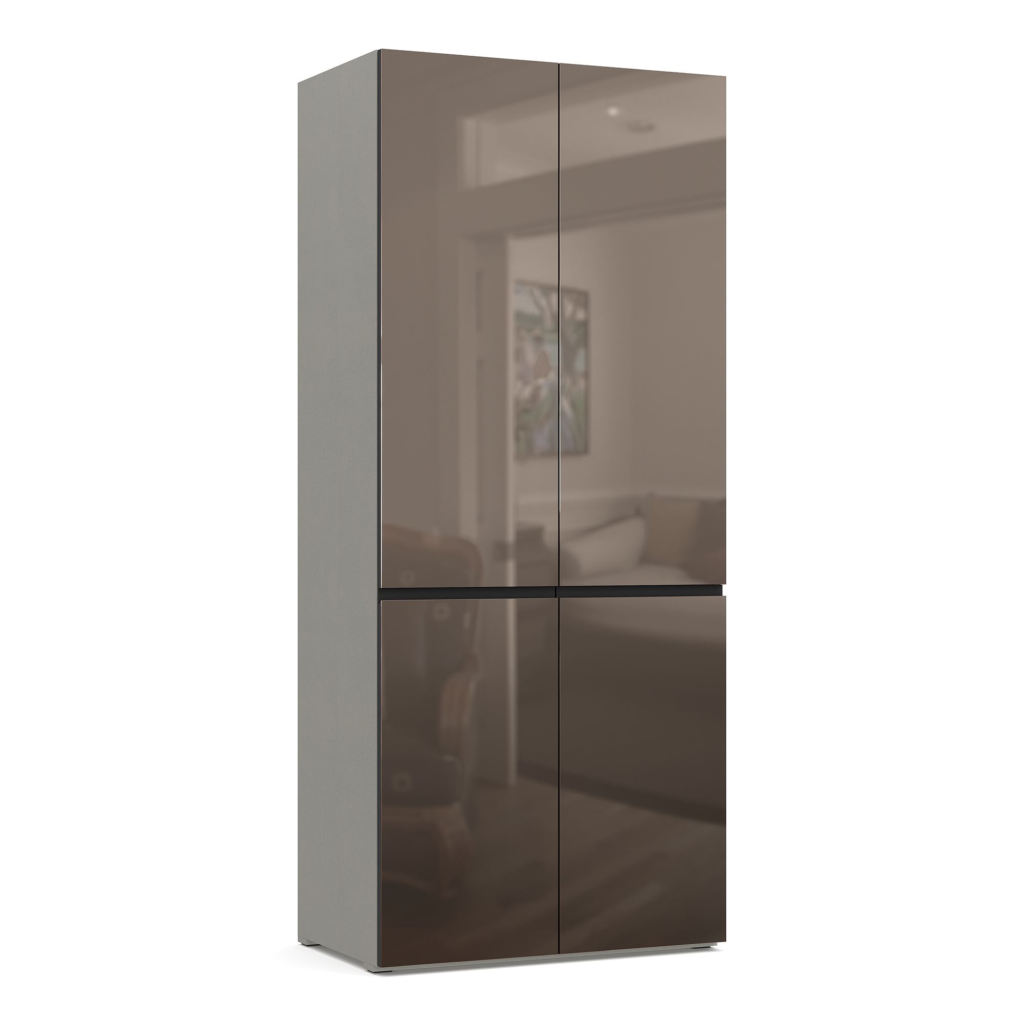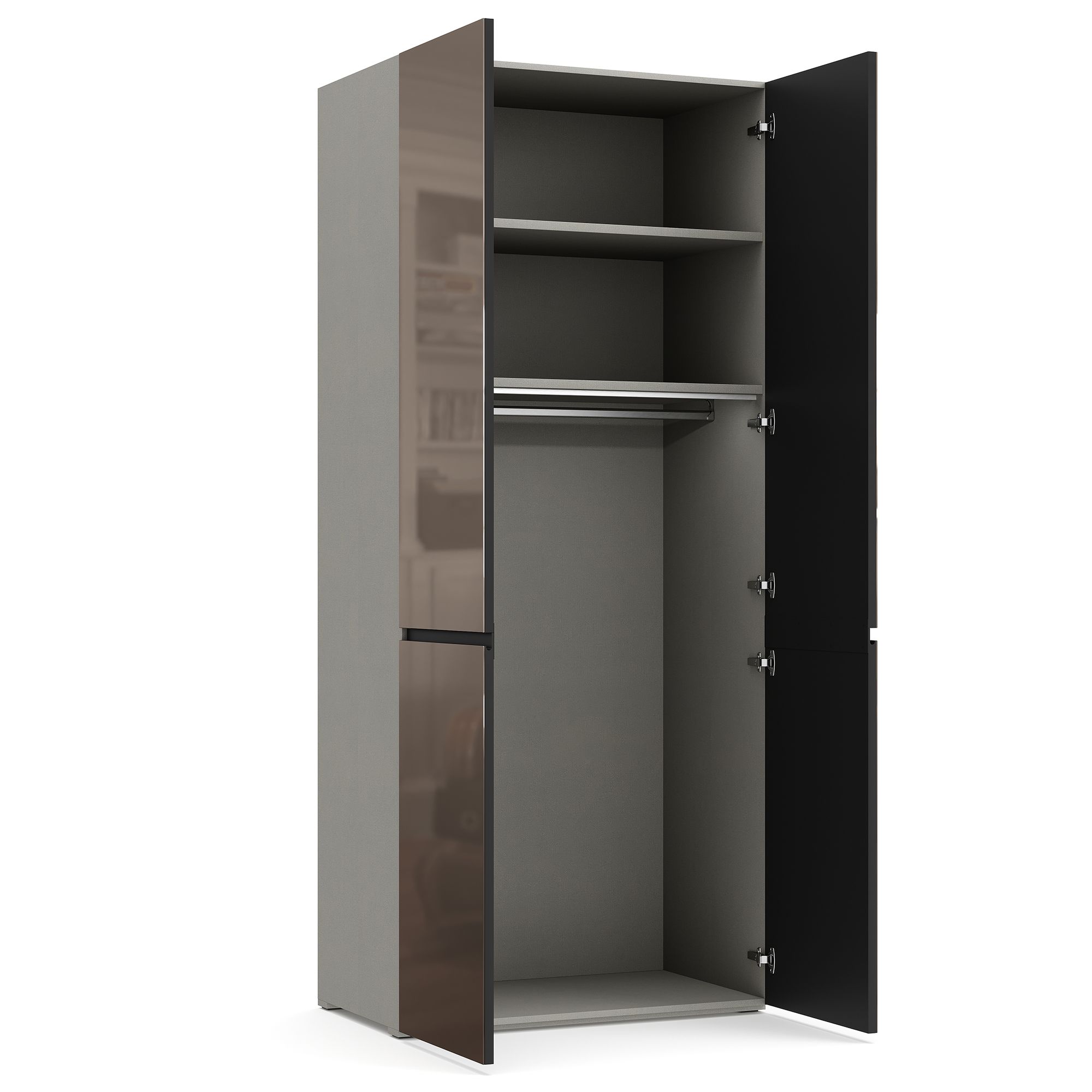 За фасадами двухдверного шкафа BRUNO с эргономичными J-ручками размещены две полки, к нижней из которых крепится штанга для вешалок. Шкаф оснащен встроенным светильником, который включается при открывании двери (система включения подсветки с трансформатором заказываются отдельно). Внутреннее пространство шкафа выполнено в отделке текстурой Шенилл. Глубина шкафа указана без учета фасада. В стоимость изделия включены боковые стенки (2 шт.) в черном цвете (возможна замена на стенку в древесной текстуре).