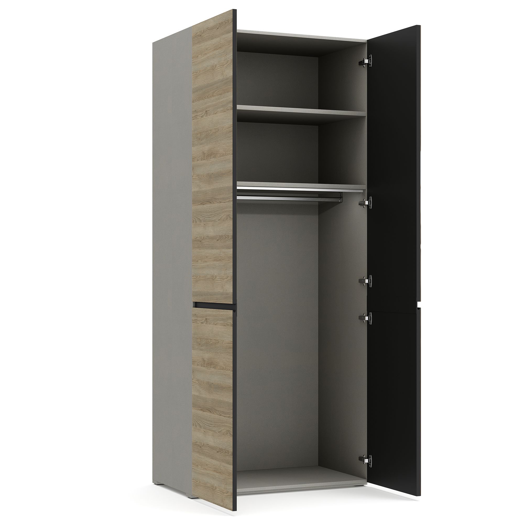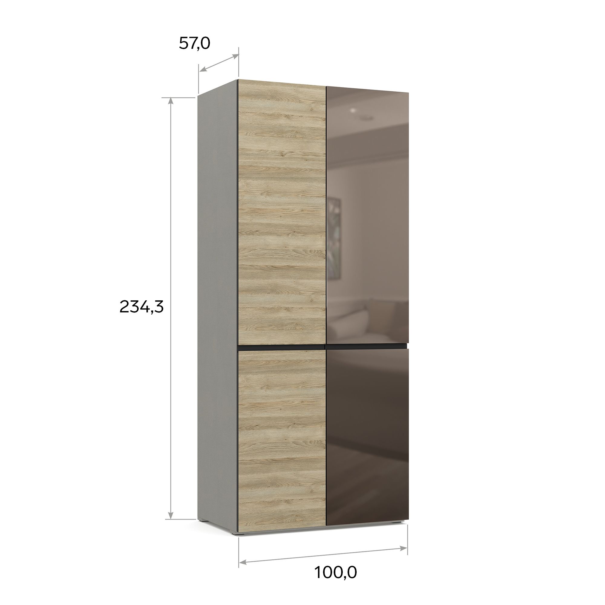 За фасадами двухдверного шкафа BRUNO с эргономичными J-ручками размещены две полки, к нижней из которых крепится штанга для вешалок. Шкаф оснащен встроенным светильником, который включается при открывании двери (система включения подсветки с трансформатором заказываются отдельно). Внутреннее пространство шкафа выполнено в отделке текстурой Шенилл. Глубина шкафа указана без учета фасада. В стоимость изделия включены боковые стенки (2 шт.) в древесной текстуре (возможна замена на стенку в черном цвете).