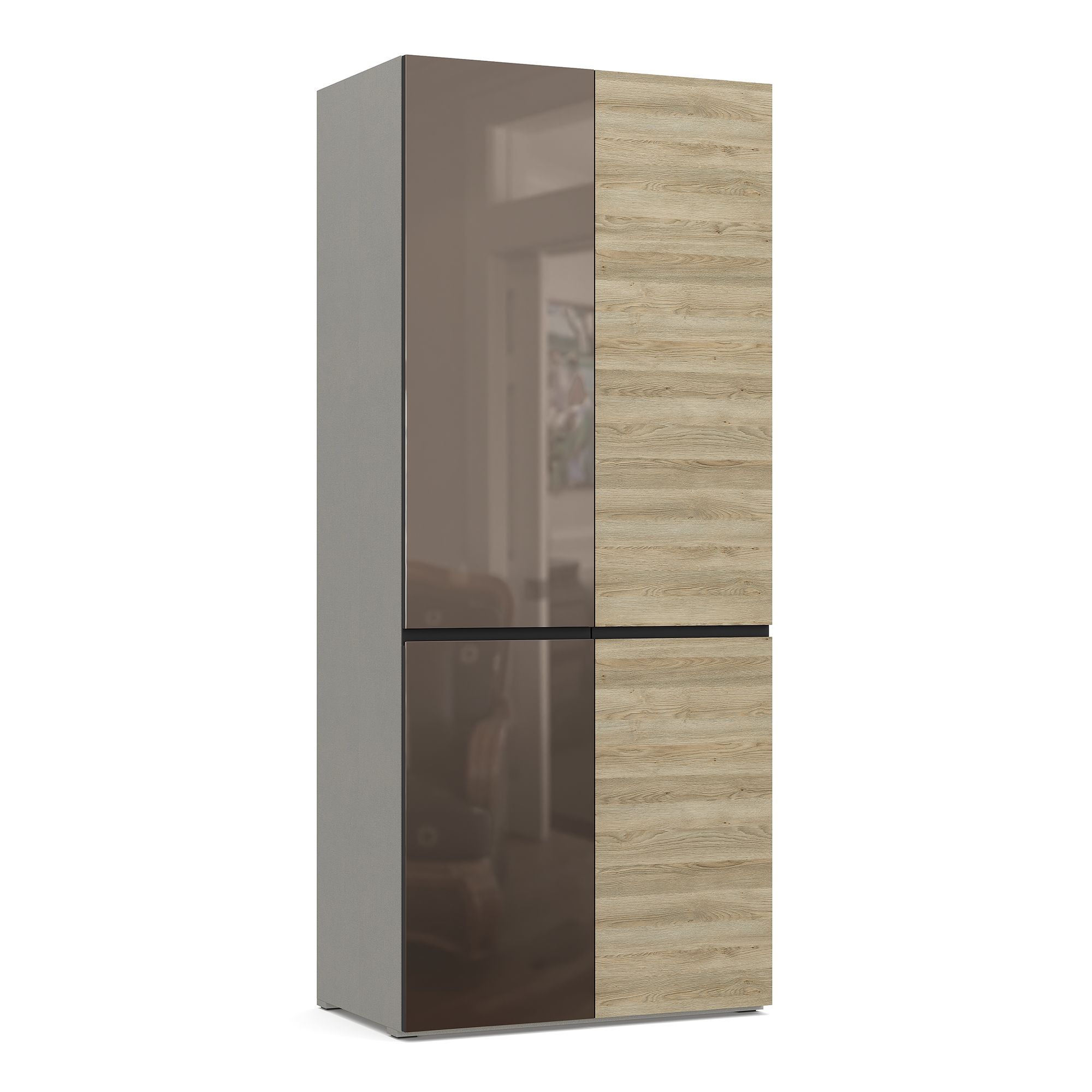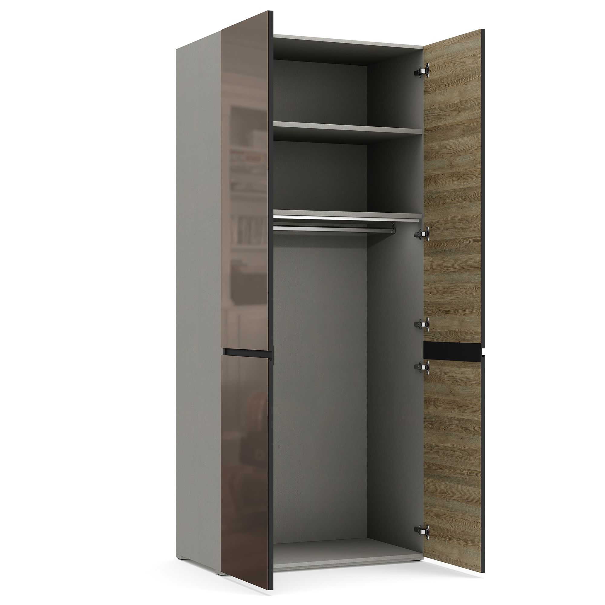 За фасадами двухдверного шкафа BRUNO с эргономичными J-ручками размещены две полки, к нижней из которых крепится штанга для вешалок. Шкаф оснащен встроенным светильником, который включается при открывании двери (система включения подсветки с трансформатором заказываются отдельно). Внутреннее пространство шкафа выполнено в отделке текстурой Шенилл. Глубина шкафа указана без учета фасада. В стоимость изделия включены боковые стенки (2 шт.) в древесной текстуре (возможна замена на стенку в черном цвете).