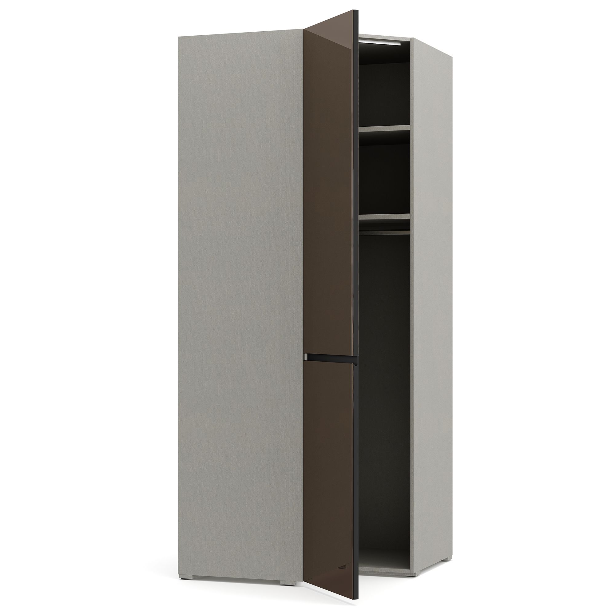 Одна из секций вместительного углового шкафа BRUNO оснащена системой полок, во второй располагаются две полки, к нижней из которых крепится штанга для вешалок. Внутреннее пространство шкафа выполнено в отделке текстурой Шенилл. Шкаф оснащен встроенным светильником, который включается при открывании двери (система включения подсветки с трансформатором заказывается отдельно). Фасад шкафа оснащен эргономичной J-ручкой. Глубина шкафа указана без учета фасада. В стоимость изделия включены боковые стенки (2 шт.) в черном цвете (возможна замена на стенку в древесной текстуре).