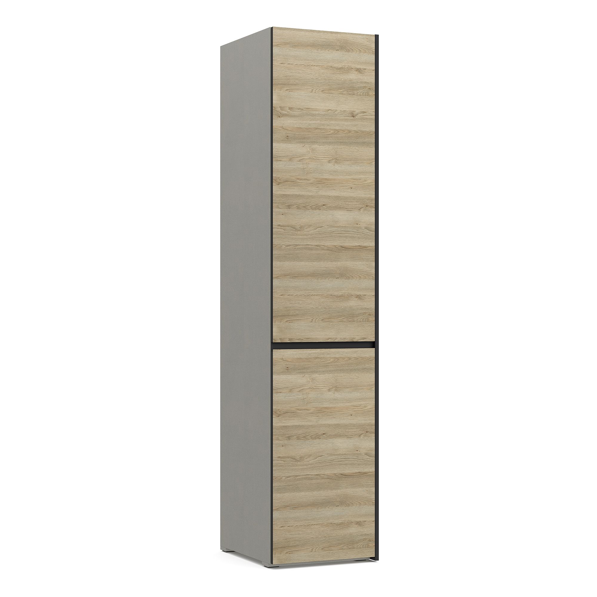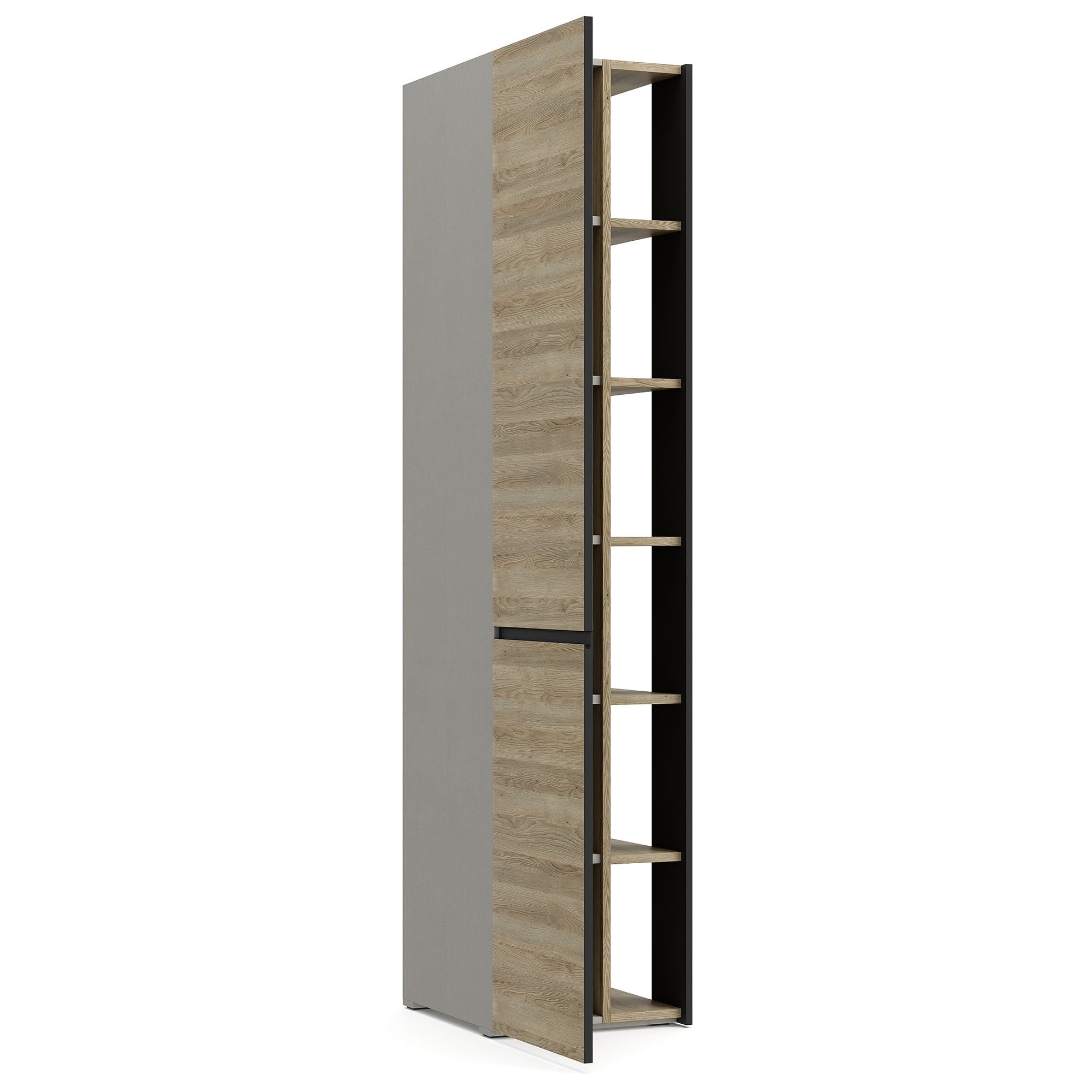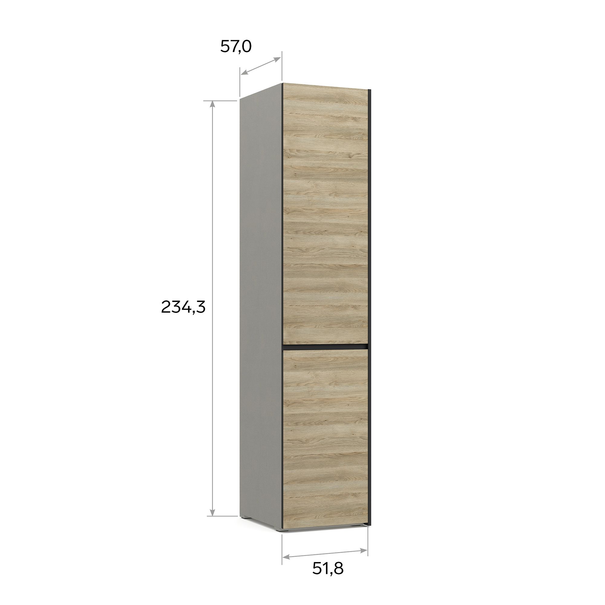 Шкафы BRUNO используются в качестве завершающих элементов системы хранения и могут приставляться как к прямым, так и к угловым моделям. Конструкция шкафа предусматривает закрытую нишу с полками, выполненную в отделке текстурой Шенилл, а также открытую нишу с полками в древесной текстуре. Глубина шкафа указана без учета фасада, ширина – c учетом планки (1,8 см).