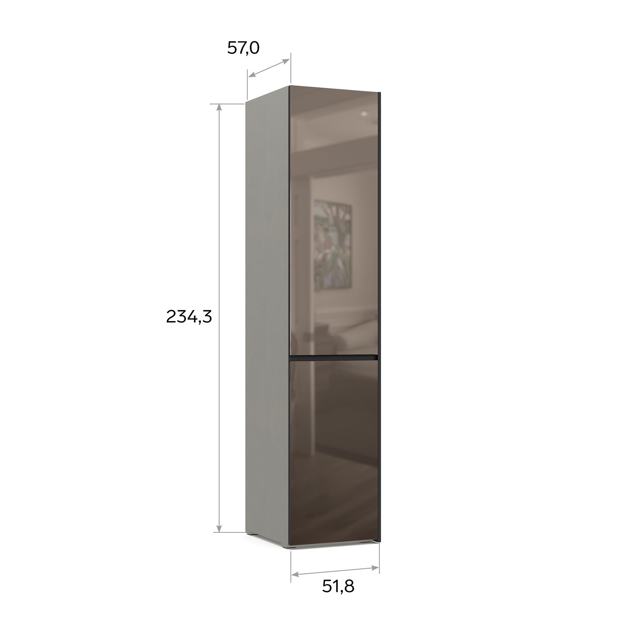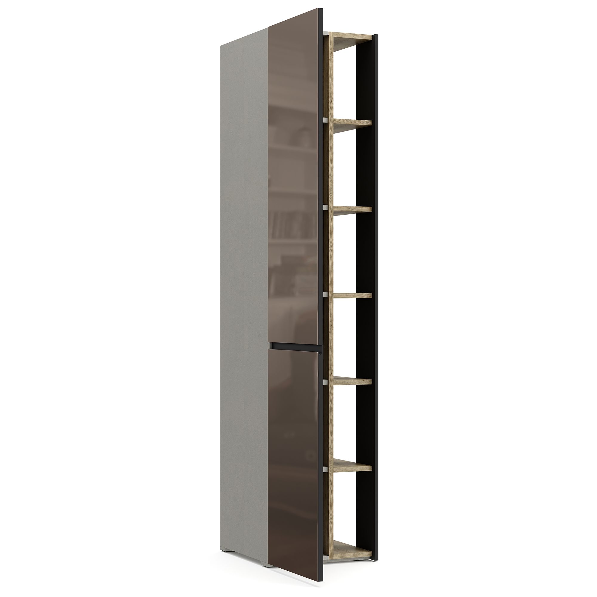 Шкафы BRUNO используются в качестве завершающих элементов системы хранения и могут приставляться как к прямым, так и к угловым моделям. Конструкция шкафа предусматривает закрытую нишу с полками, выполненную в отделке текстурой Шенилл, а также открытую нишу с полками в древесной текстуре. Глубина шкафа указана без учета фасада, ширина – c учетом планки (1,8 см).