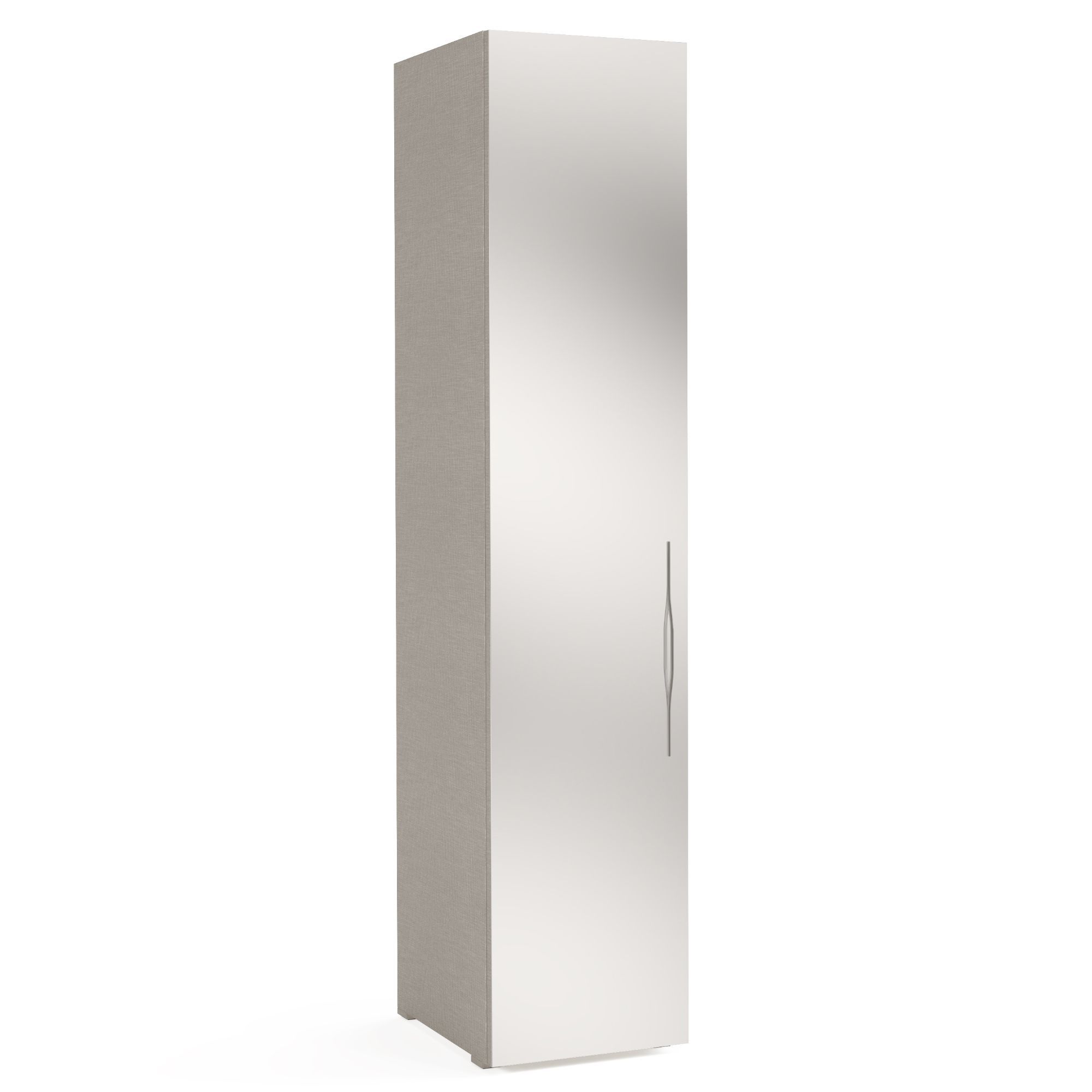 За зеркальным фасадом однодверного шкафа SAVONA расположено 5 полок. Внутреннее пространство выполнено в отделке текстурой Шенилл, воспроизводящей рисунок плетения натуральной ткани. Возможно исполнение как с правым, так и с левым открыванием двери. ВАЖНО! Боковые стенки и карнизы соответствующей конфигурации заказываются отдельно. Габариты шкафа указаны без учета карниза.