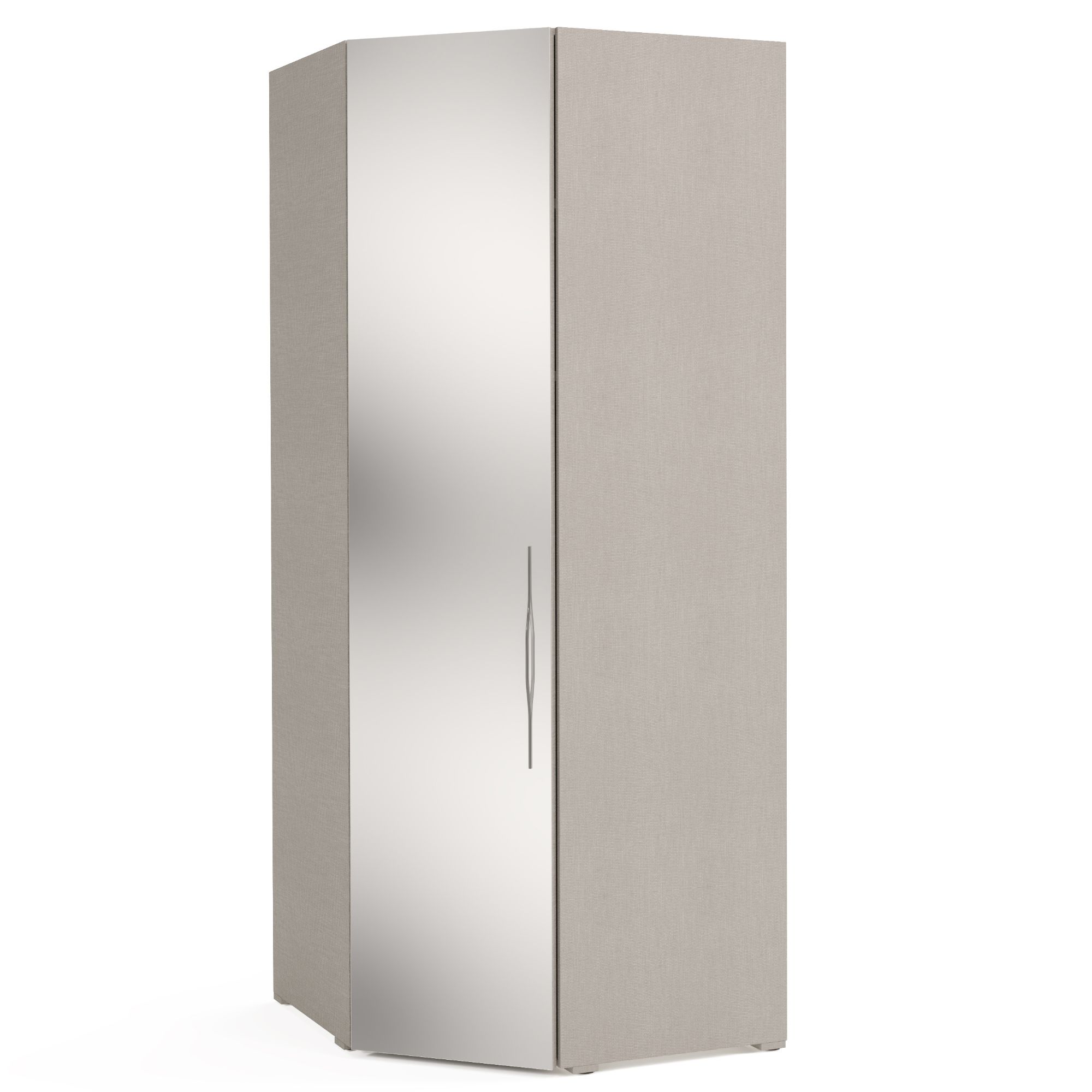 Внутреннее пространство углового шкафа SAVONA с зеркальным фасадом выполнено в отделке текстурой Шенилл, воспроизводящей рисунок плетения натуральной ткани. Одну из частей шкафа занимает система из 5 полок, вторая оборудована двумя полками, к нижней из которых прикреплена штанга для вешалок. Внутренняя подсветка с датчиком движения автоматически включается при открывании дверей. Возможно исполнение как с правым, так и с левым открыванием двери. ВАЖНО! Система включения с трансформатором, а также боковые стенки и карнизы соответствующей конфигурации заказываются отдельно. Габариты шкафа указаны без учета карниза.
