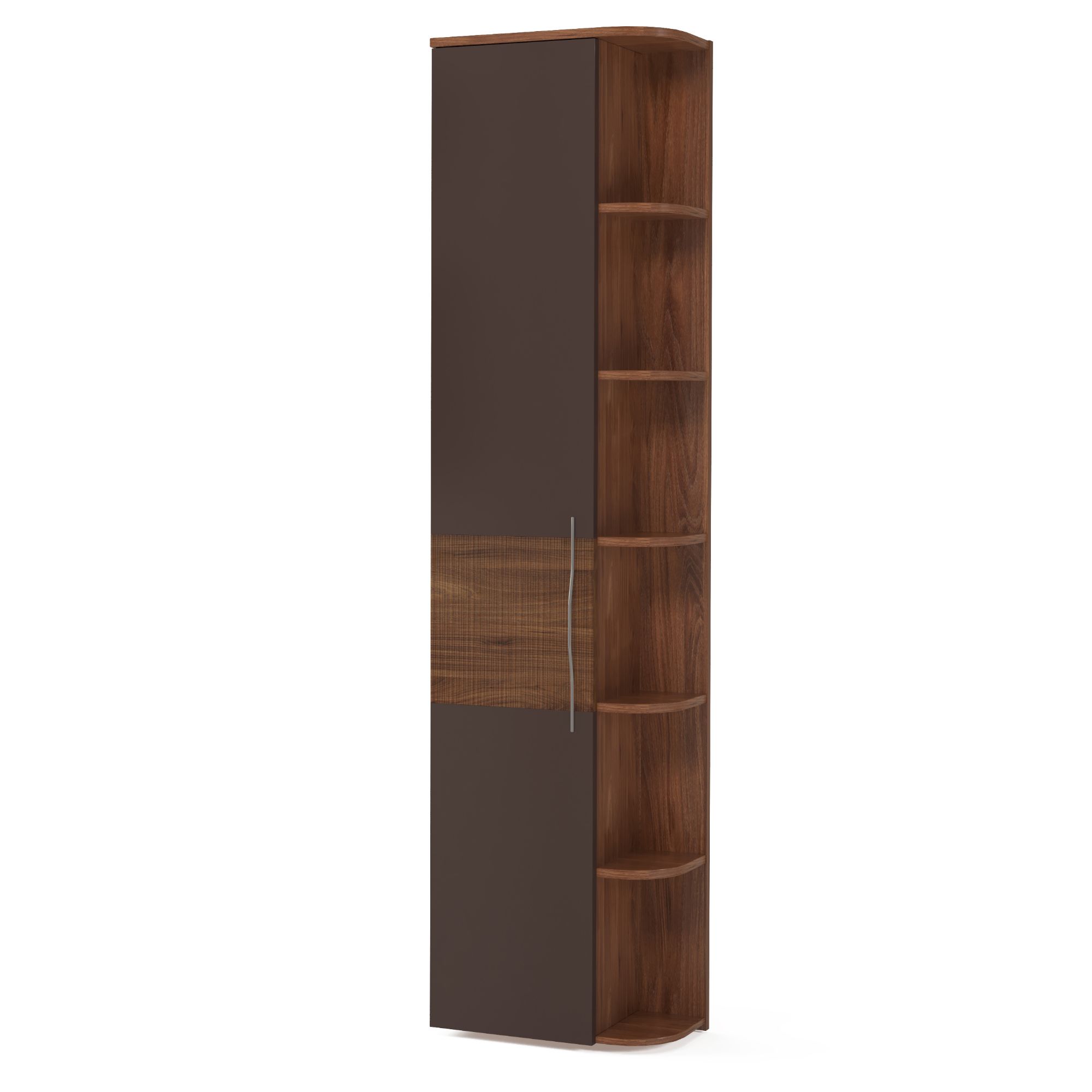 Завершащий шкаф SAVONA, который сочетает в себе функции открытого и закрытого хранения, может приставляться как к прямым, так и к угловым моделям. Конструкция шкафа предусматривает нишу с полками за фасадом с глянцевой отделкой и тиснением, а также систему открытых полок. Карниз и боковые полки входят в комплект.