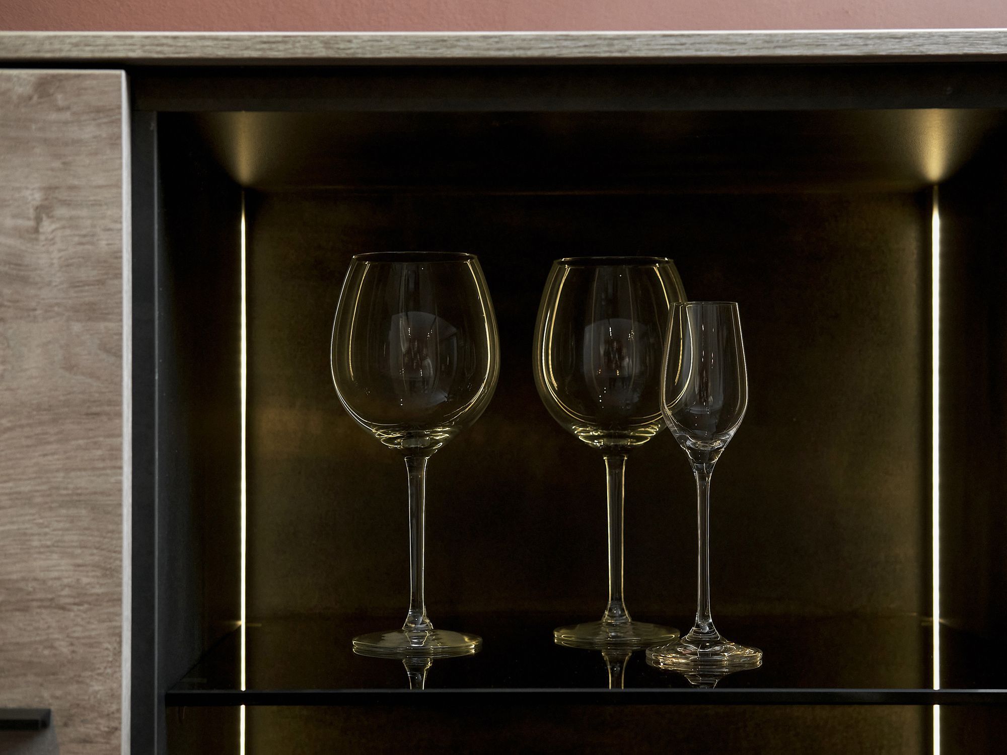 Ассортимент коллекции включает шкафы со стеклом, тонированным в оттенок Бронза, и тонированными стеклянными полками, которые придают композиции легкость и глубину. Закаленное стекло обладает гораздо более высокой прочностью, чем обычное, и безопасно даже при случайном разрушении.