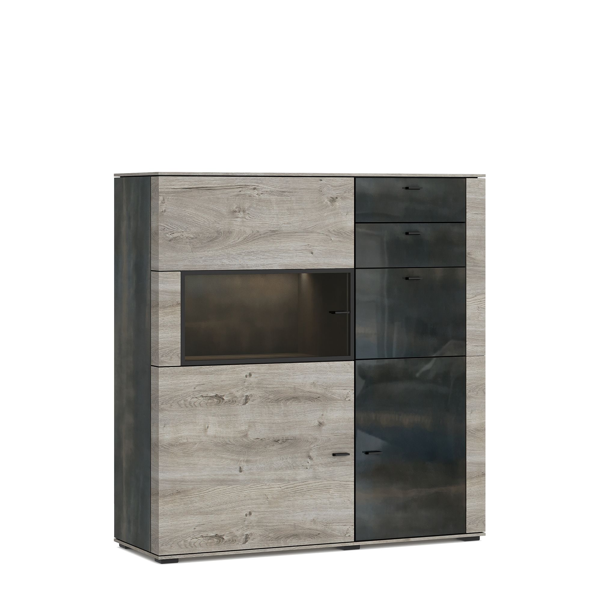 Вместительный шкаф BOSTON с комбинированными фасадами оснащен распашными дверьми и выдвижными ящиками. За закаленным бронзированным стеклом в изящной раме из черного металла размещена встроенная подсветка (система включения-выключения светильников заказывается отдельно).