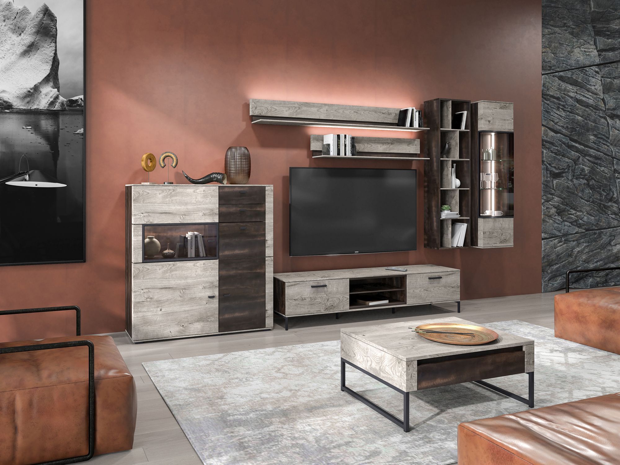 Текстуры коллекции в точности воспроизводят рисунок натуральных материалов, создавая пространство релакса. Сочетание выразительного рисунка древесных волокон Дуб Grande с текстурой Galaxy, зрительно и на ощупь напоминающей природный камень или грубоватую поверхность темного металла, отлично вписывается в интерьеры в стилях лофт, минимализм, eco и industrial.