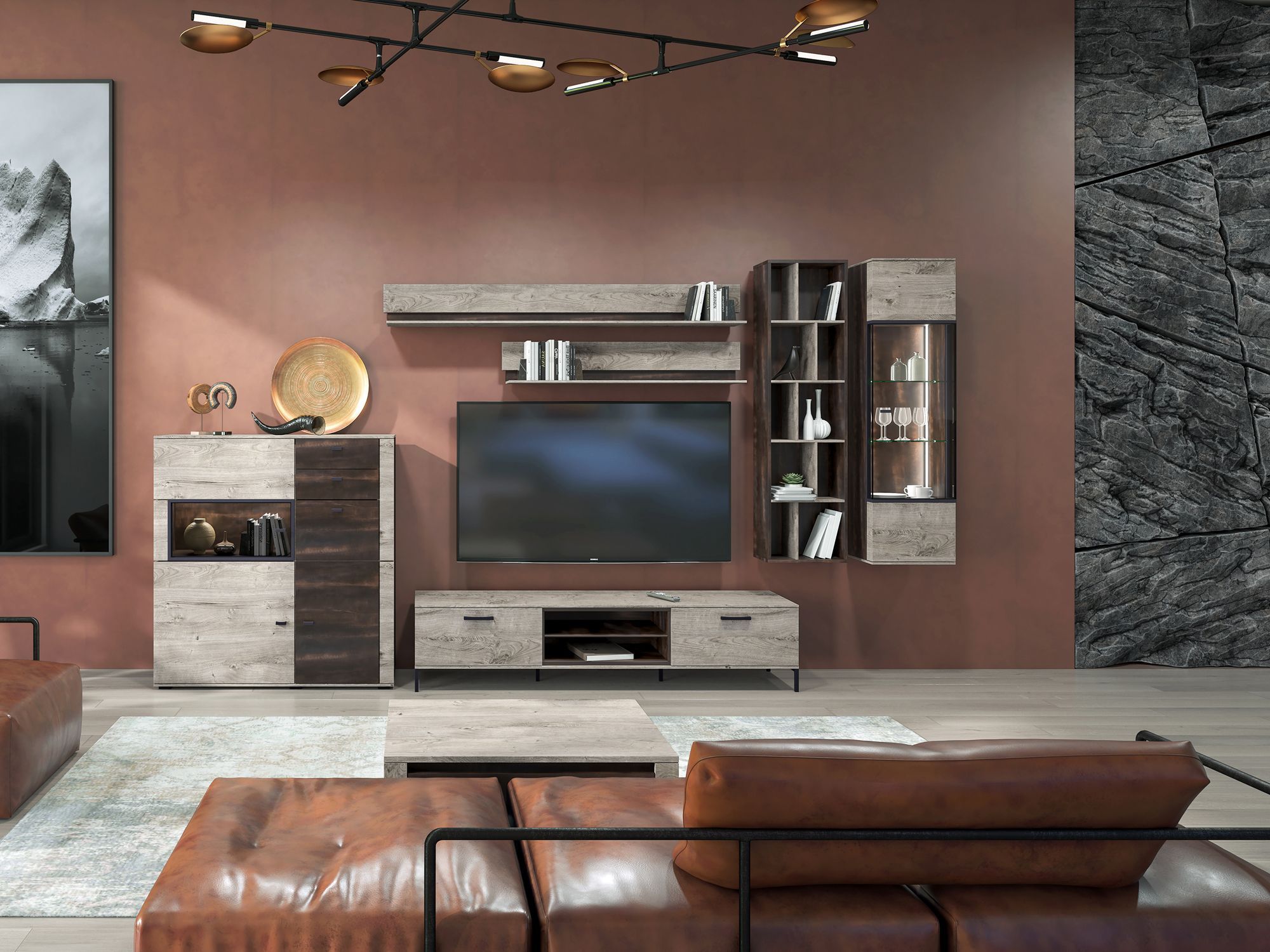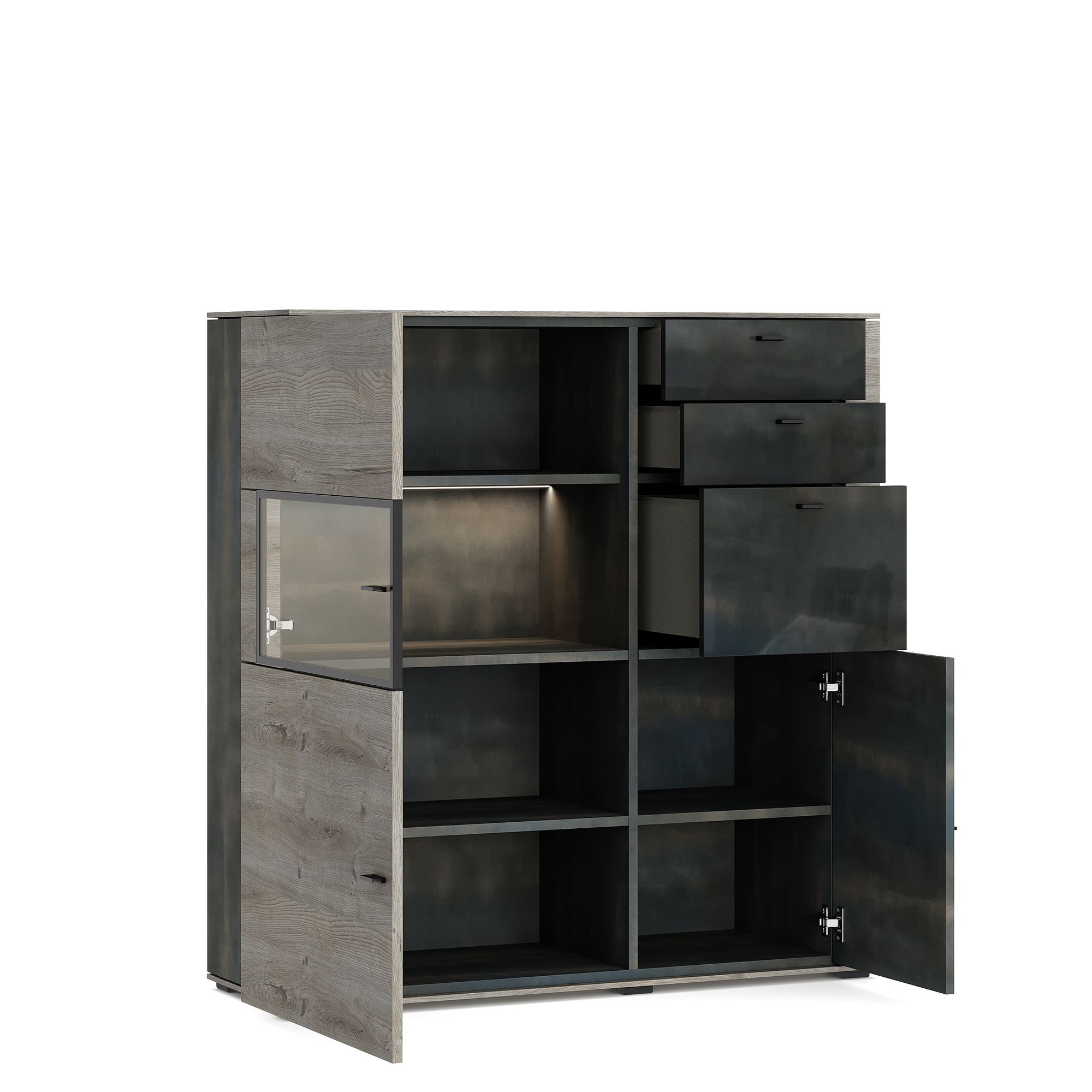 Корпуса шкафов выполнены в отделке текстурой Galaxy, зрительно и на ощупь напоминающей природный камень или поверхность темного металла с характерным рельефом. Дизайн корпуса органично дополняют фасады с текстурой Galaxy в отделке прозрачным лаком, которая раскрывает глубину рисунка.
