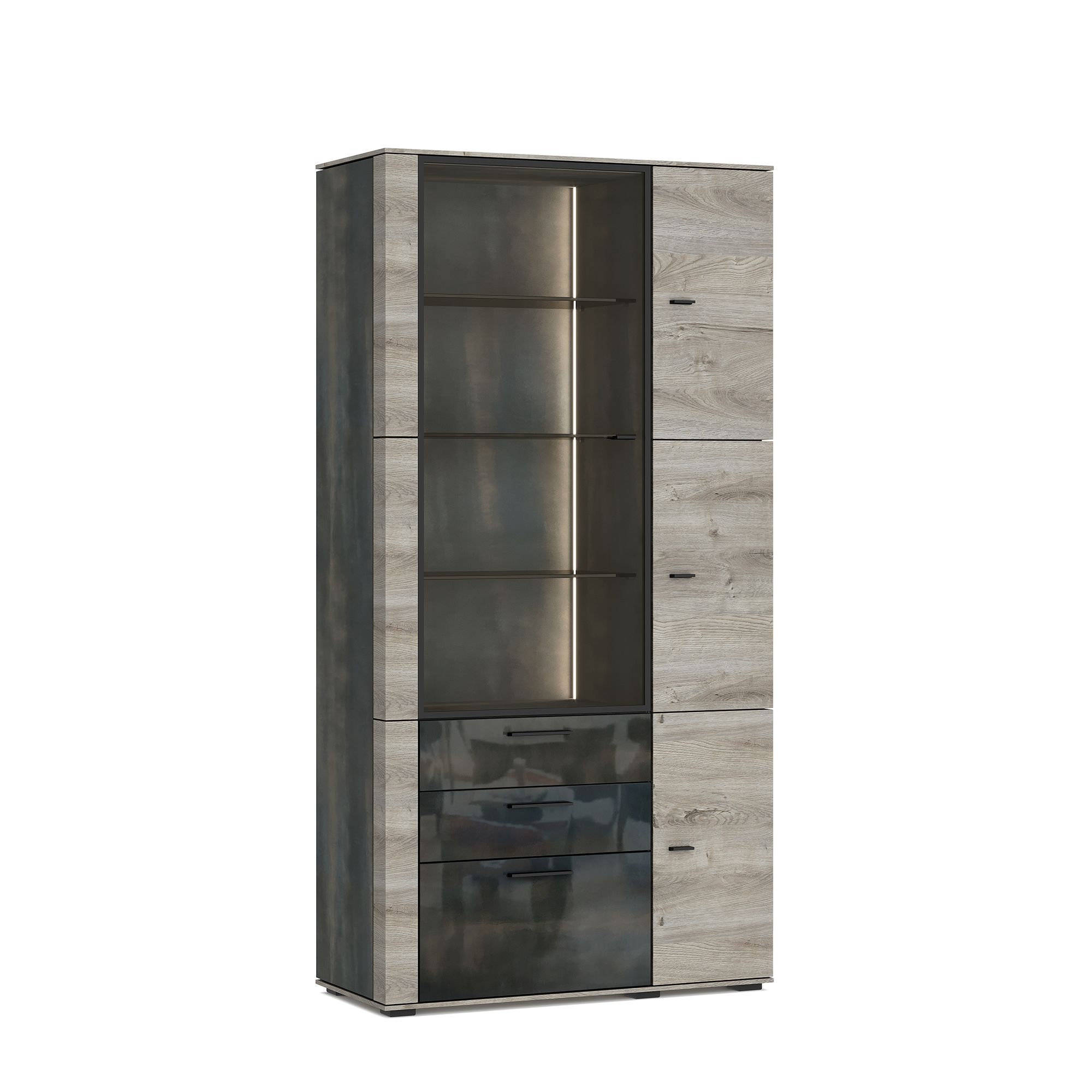 Вместительный шкаф BOSTON с комбинированными фасадами оснащен распашными дверьми и выдвижными ящиками. За закаленным бронзированным стеклом в изящной раме из черного металла размещена встроенная подсветка (система включения-выключения светильников заказывается отдельно).