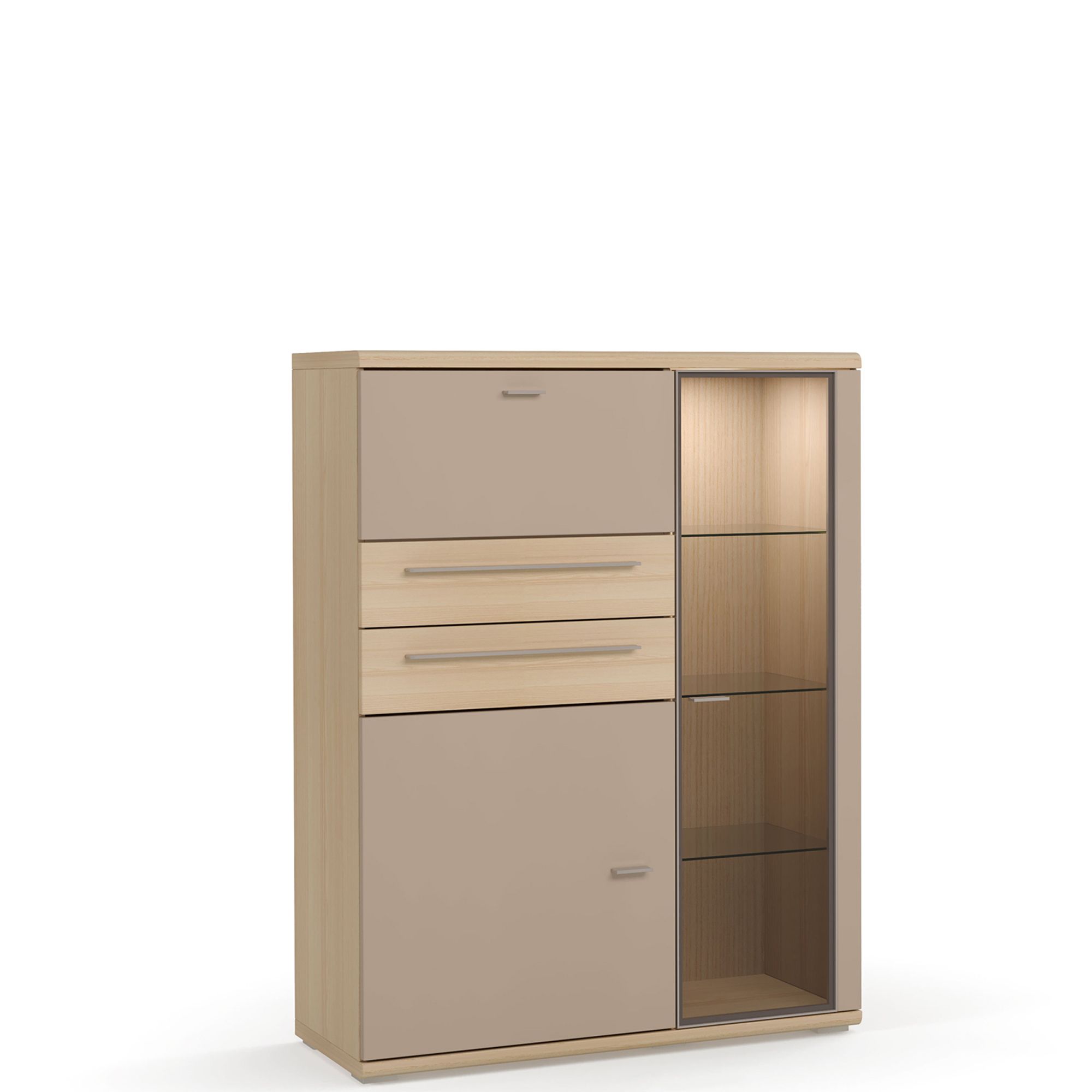 Вместительный шкаф ESTE оснащен распашным и откидным фасадами и выдвижными ящиками. Секция за откидным фасадом оборудована зеркалом. За закаленным тонированным стеклом расположены стеклянные полки и система внутренней подсветки.