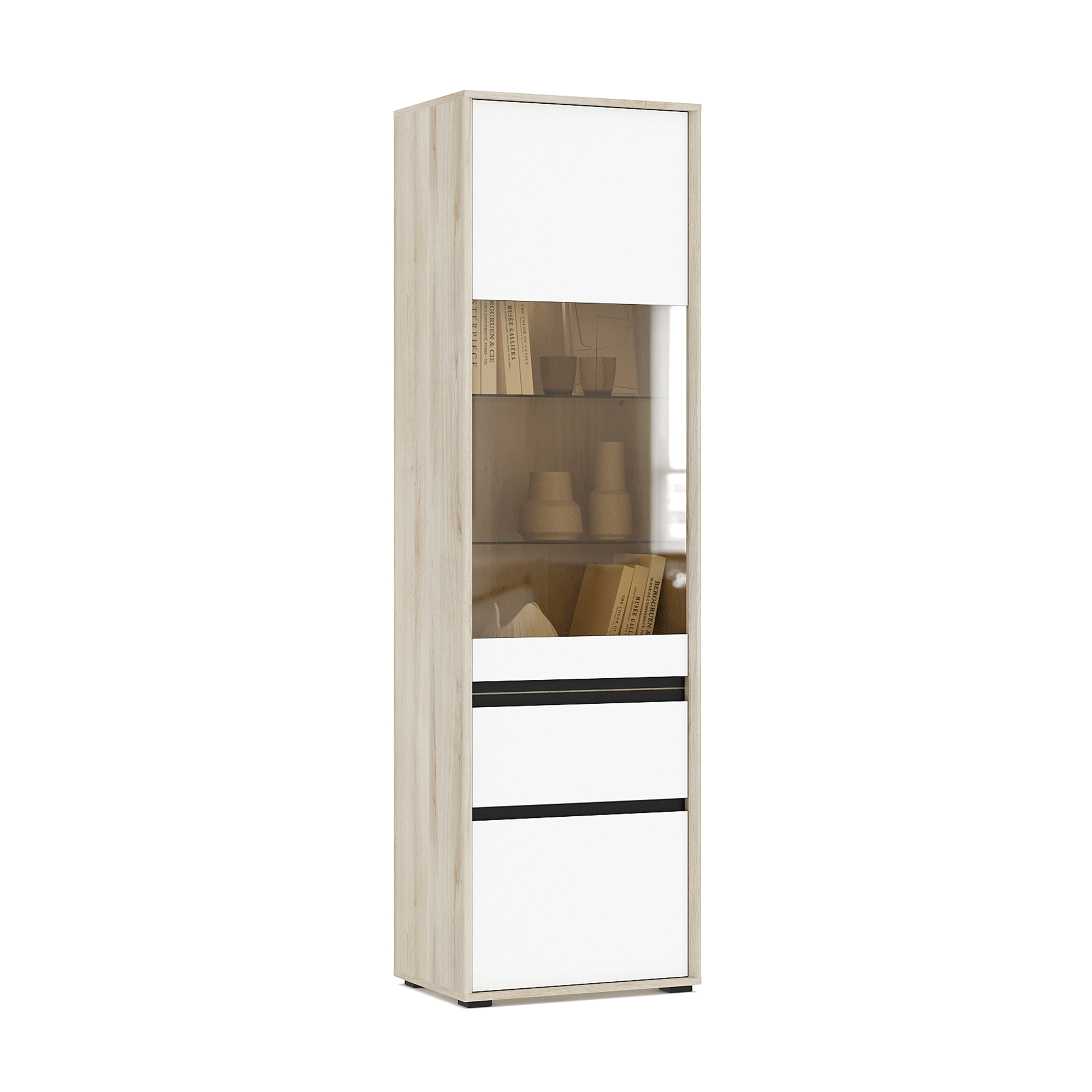 Шкаф-витрина LUNA высотой 206,8 см и шириной 60,1 см с корпусом в текстуре Дуб Anziano оснащен выдвижным ящиком и распашными фасадами с интегрированными J-ручками. За вставкой из тонированного стекла располагаются стеклянные полки, за сплошным фасадом – полки из ЛДСП. Возможно как левое, так и правое исполнение элемента. В качестве опции доступна система подсветки (заказывается отдельно).