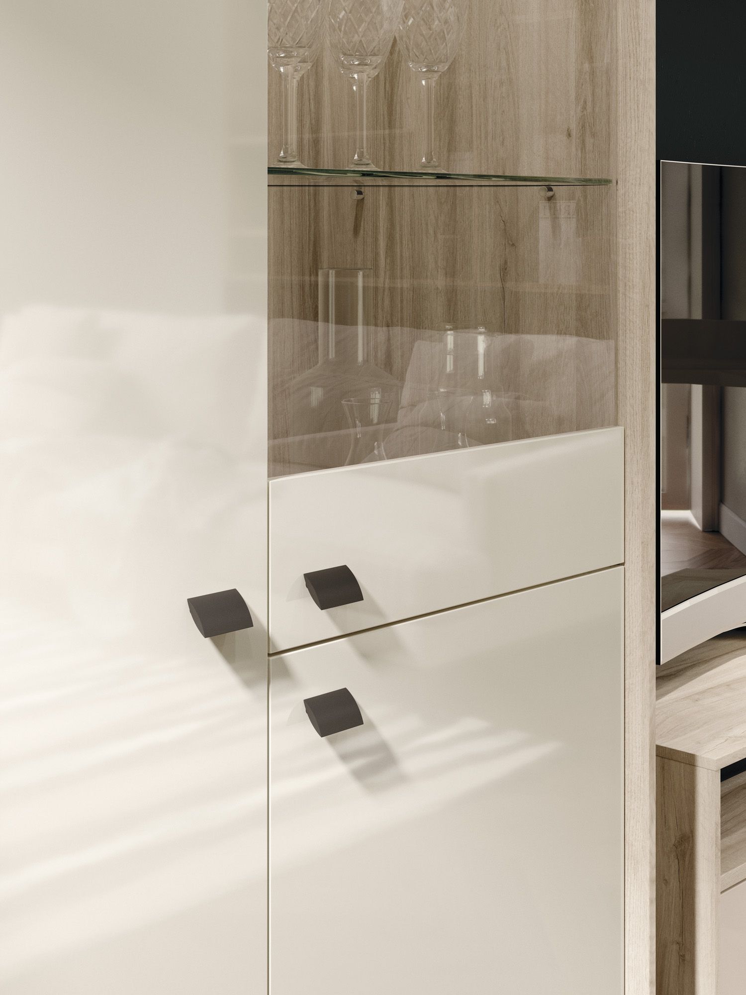 Дизайн коллекции позволяет комбинировать древесную текстуру с глянцевыми фасадами приятного базового оттенка. Это решение оптимально подходит для компактных помещений, поскольку глянец обладает высоким коэффициентом отражения и служит повышению освещенности.