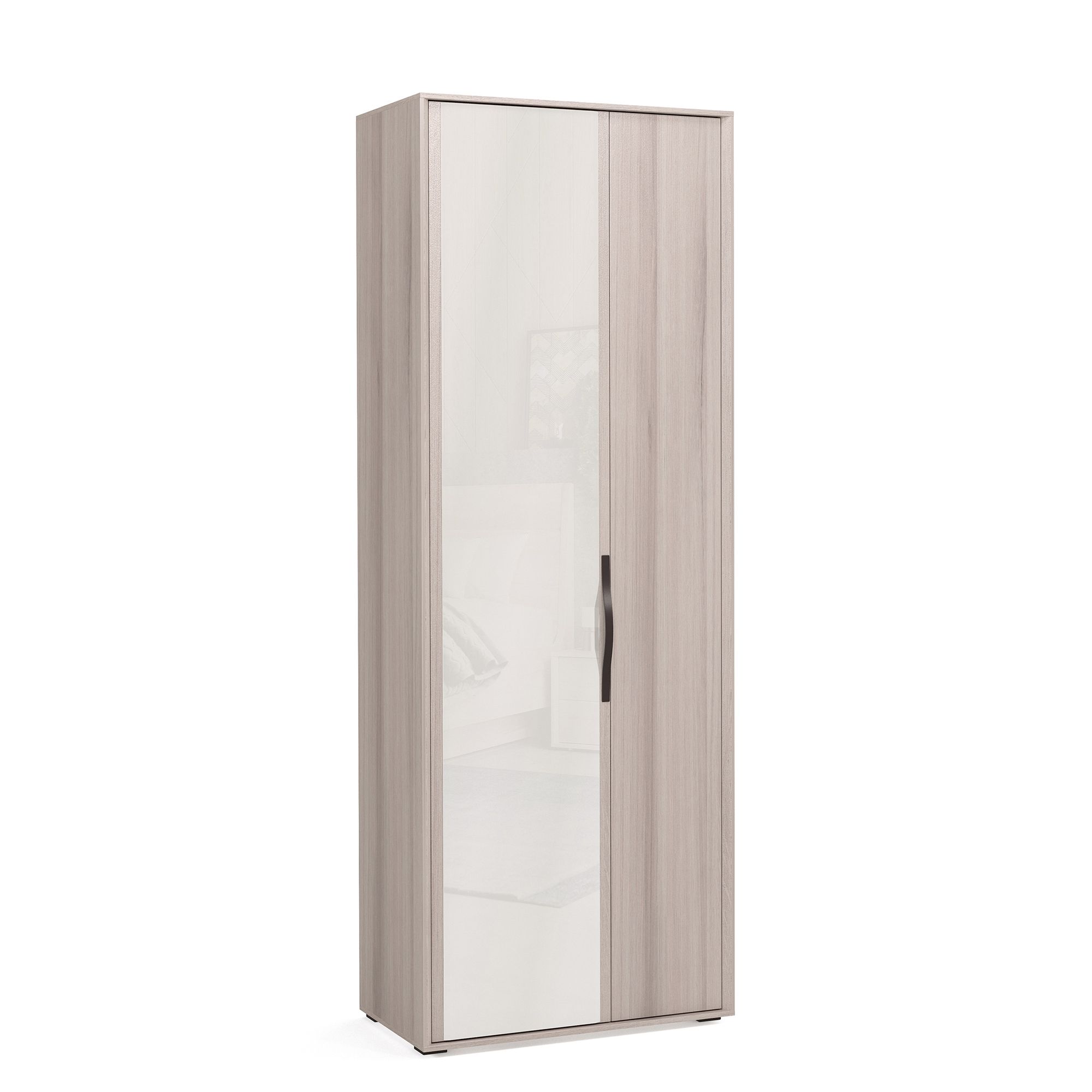 Благодаря небольшой глубине и зеркальному фасаду, визуально расширяющему пространство, двухдверный шкаф ALTERA подходит, в том числе, для обустройства компактных прихожих. Внутреннее пространство модели поделено на две секции – с полками и штангой для вешалок, верхняя и нижняя часть также оснащены полками. Это позволяет организовать рациональное хранение вещей, используя пространство максимально эффективно. Доводчики для плавного закрывания включены в базовую комплектацию. Стандартный комплект ручек входит в комплектацию. Вы можете подобрать к шкафу ручки другого дизайна (заказываются отдельно).