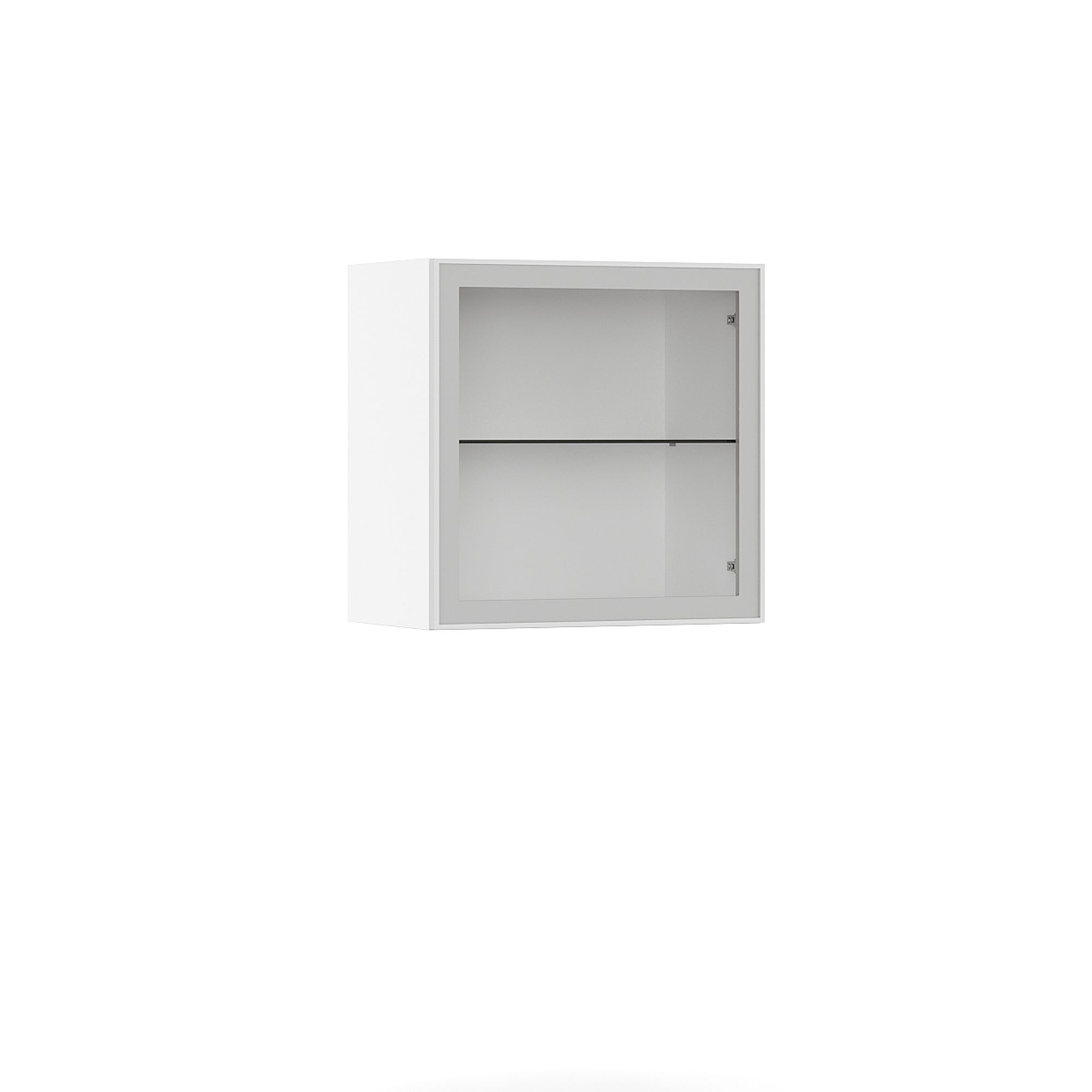 Навесной шкаф TURIN в отделке премиальной белой эмалью с шелковистой поверхностью оснащен фасадом из закаленного тонированного стекла,за которым располагается стеклянная полка. Предусмотрено как левое,так и правое открывание. Максимальная допустимая нагрузка составляет 15 кг. В качестве опции доступна система подсветки (заказывается отдельно).