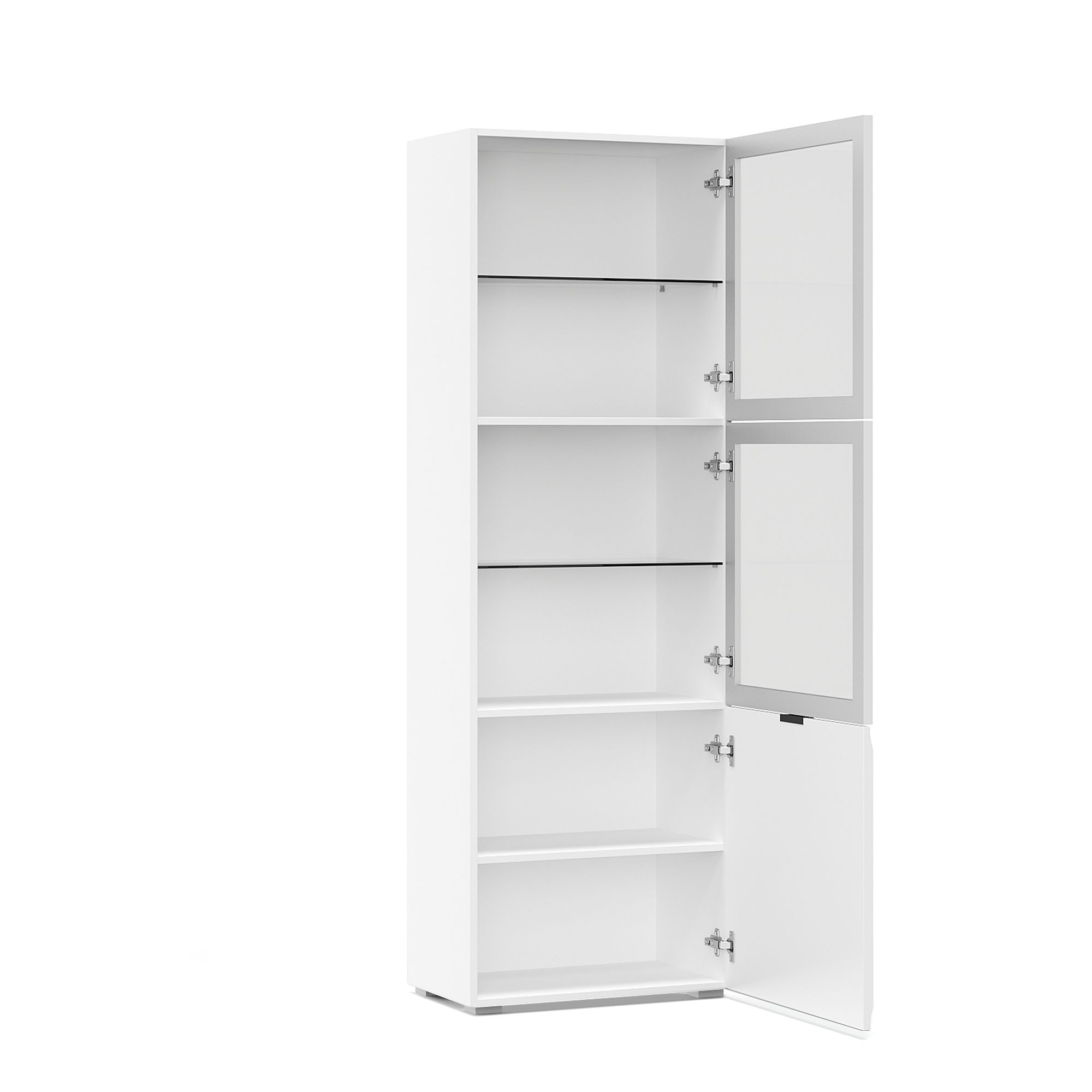 За глухим фасадом шкафа-витрины TURIN,выполненным в отделке премиальной белой эмалью с шелковистой поверхностью,располагается полка из ДСП. Две верхние секции оснащены стеклянными фасадами в алюминиевой рамке с системой открывания Push-to-Open,за которыми находятся полки из тонированного стекла. Возможна навеска дверей как на левую,так и на правую сторону. Ножки и световое оборудование заказываются отдельно,благодаря чему можно придать мебели индивидуальный стиль.