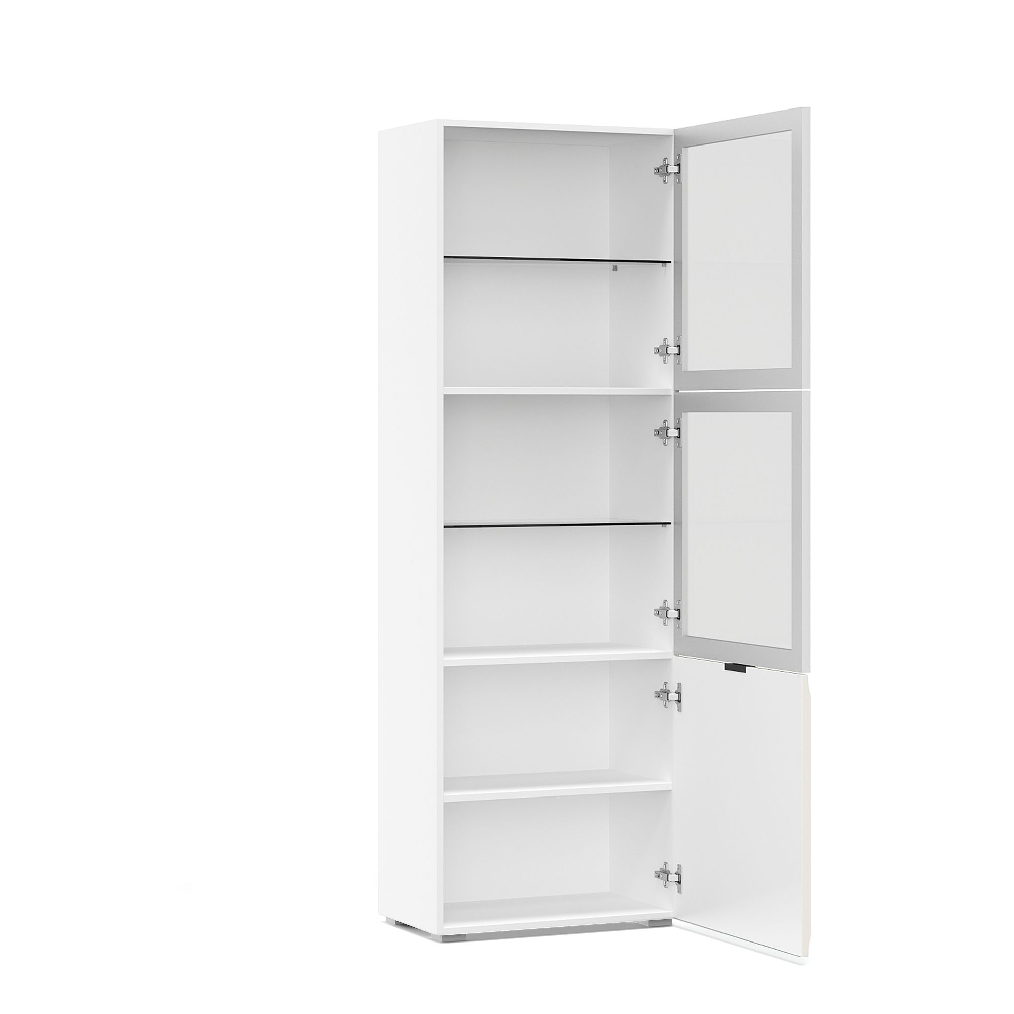 За глухим фасадом шкафа-витрины TURIN,выполненным в отделке премиальной эмалью оттенка Cashmere с шелковистой поверхностью,располагается полка из ДСП. Две верхние секции оснащены стеклянными фасадами в алюминиевой рамке с системой открывания Push-to-Open,за которыми находятся полки из тонированного стекла. Возможна навеска дверей как на левую,так и на правую сторону. Ножки и световое оборудование заказываются отдельно,благодаря чему можно придать мебели индивидуальный стиль.