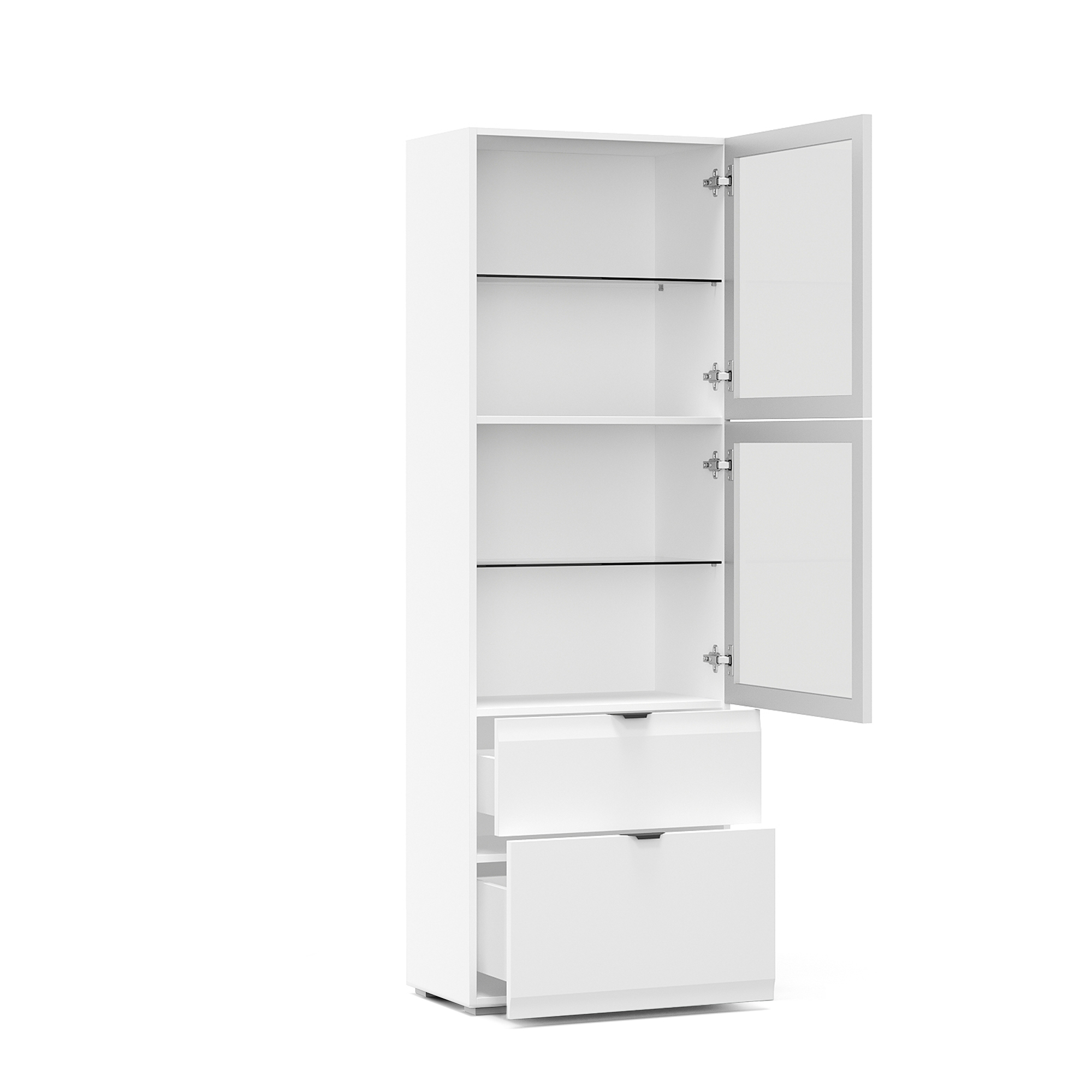 Нижнюю часть шкафа-витрины TURIN занимают два выдвижных ящика,фасады которых выполнены в отделке премиальной белой эмалью с шелковистой поверхностью. Две верхние секции оснащены стеклянными фасадами в алюминиевой рамке с системой открывания Push-to-Open,за которыми находятся полки из тонированного стекла. Возможна навеска дверей как на левую,так и на правую сторону. Ножки и световое оборудование заказываются отдельно,благодаря чему можно придать мебели индивидуальный стиль.