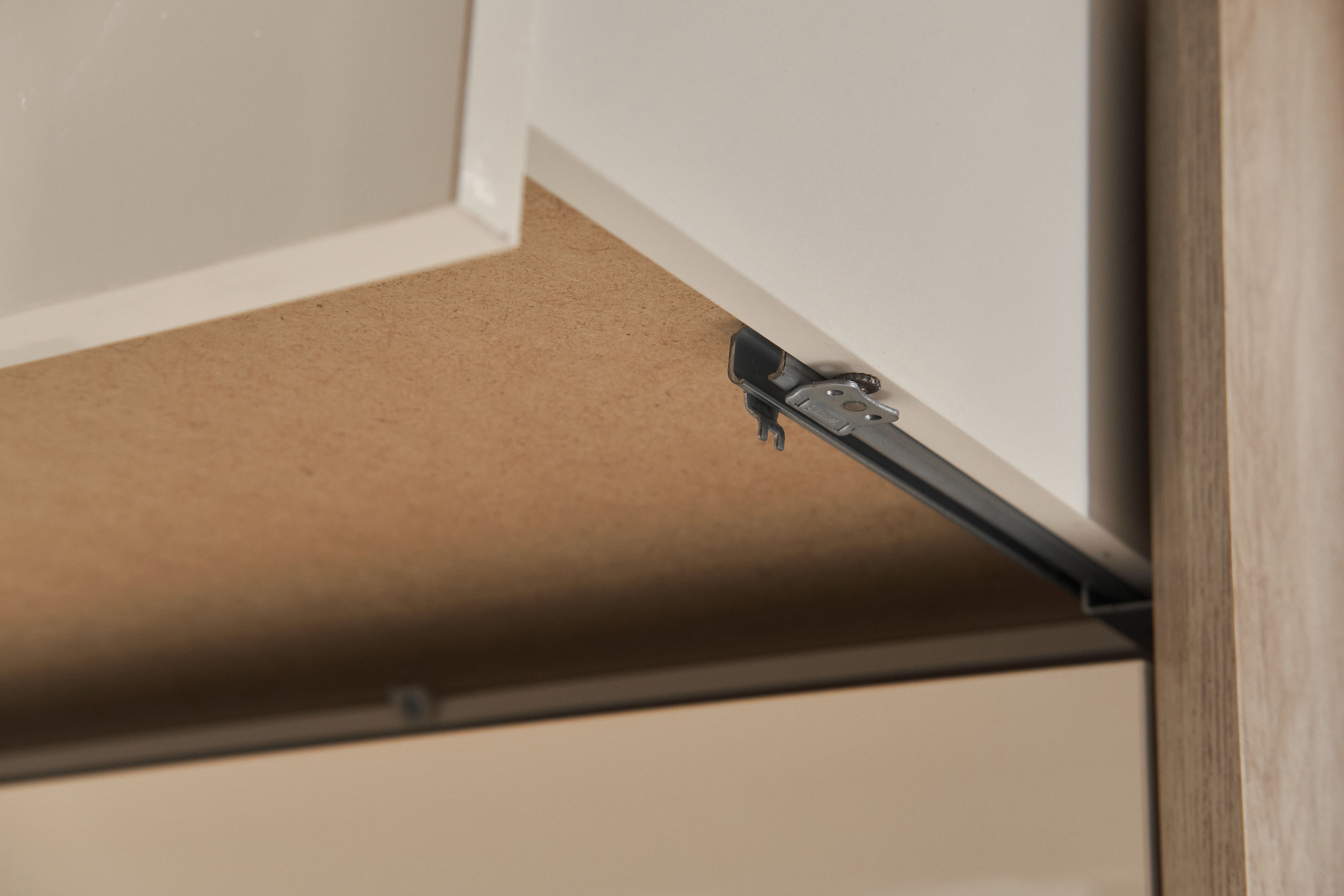 Для выдвижных ящиков используются направляющие скрытого монтажа. Плавное бесшумное движение ящиков обеспечено благодаря специальной геометрии профиля, а долговечный комфорт использования создают стальные шарикоподшипники. Ящик двигается легко и плавно даже при экстремальных нагрузках.
