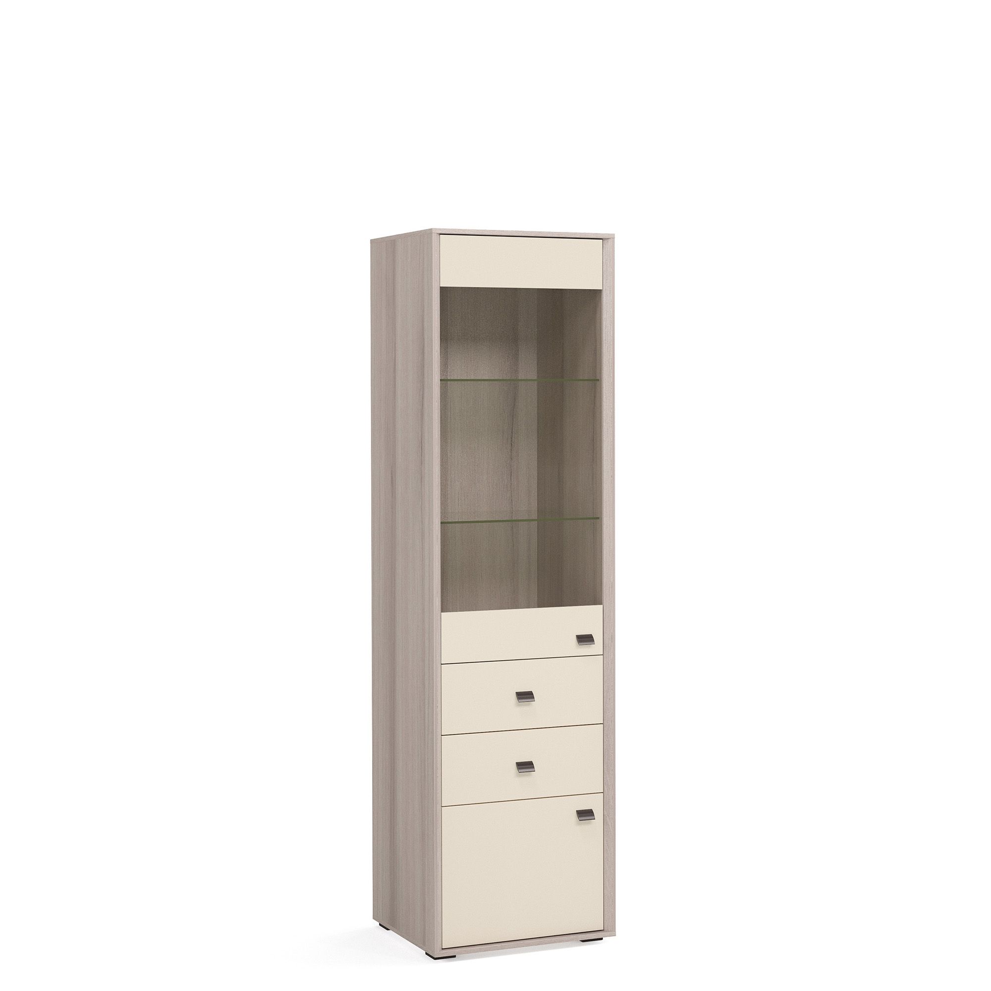 Шкаф-витрина ALTERA с выдвижными ящиками и фасадом из прочного закаленного стекла отлично подходит как для гостиных, так и для молодежных комнат, домашних библиотек и рабочих кабинетов. Доводчики и направляющие для плавного закрывания включены в базовую комплектацию. Стандартный комплект ручек входит в комплектацию. Вы можете подобрать к шкафу ручки другого дизайна (заказываются отдельно).